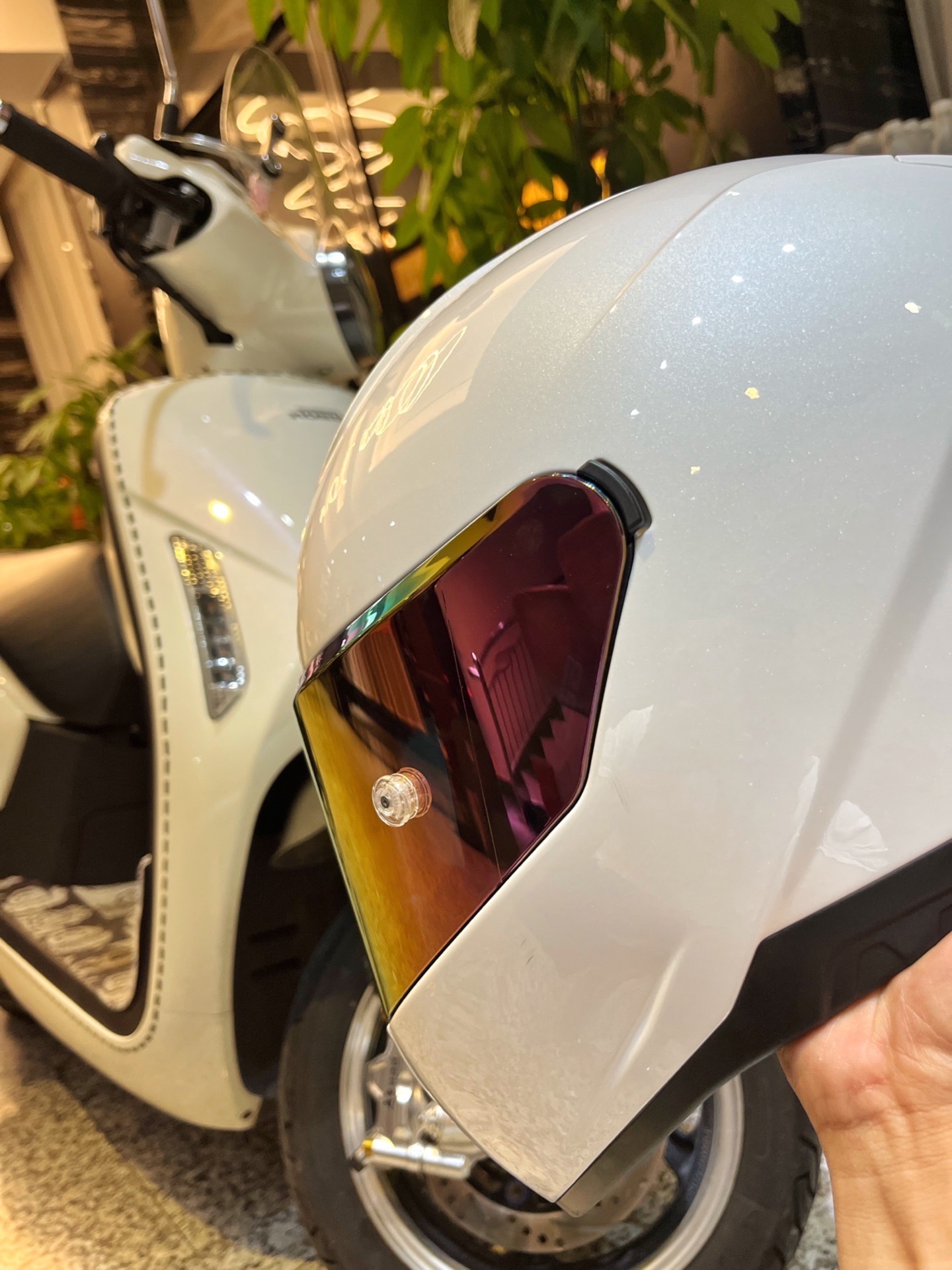 夏天到啦,我骑着小HONDA去兜风~520女朋友送的头盔刚好派上用场🥰 珍珠白颜值好高,和我浅色系穿搭适配度拉满!质感配得上价格,镜片清晰还防晒。 多个通风口戴着呼吸畅快,安全感足足的~戴起来也方便,不会压耳朵,素颜戴也好看~ 唯一小缺点是单镜片,换镜片得手动操作,但整体不影响我喜欢它!我要戴着粗发咯~