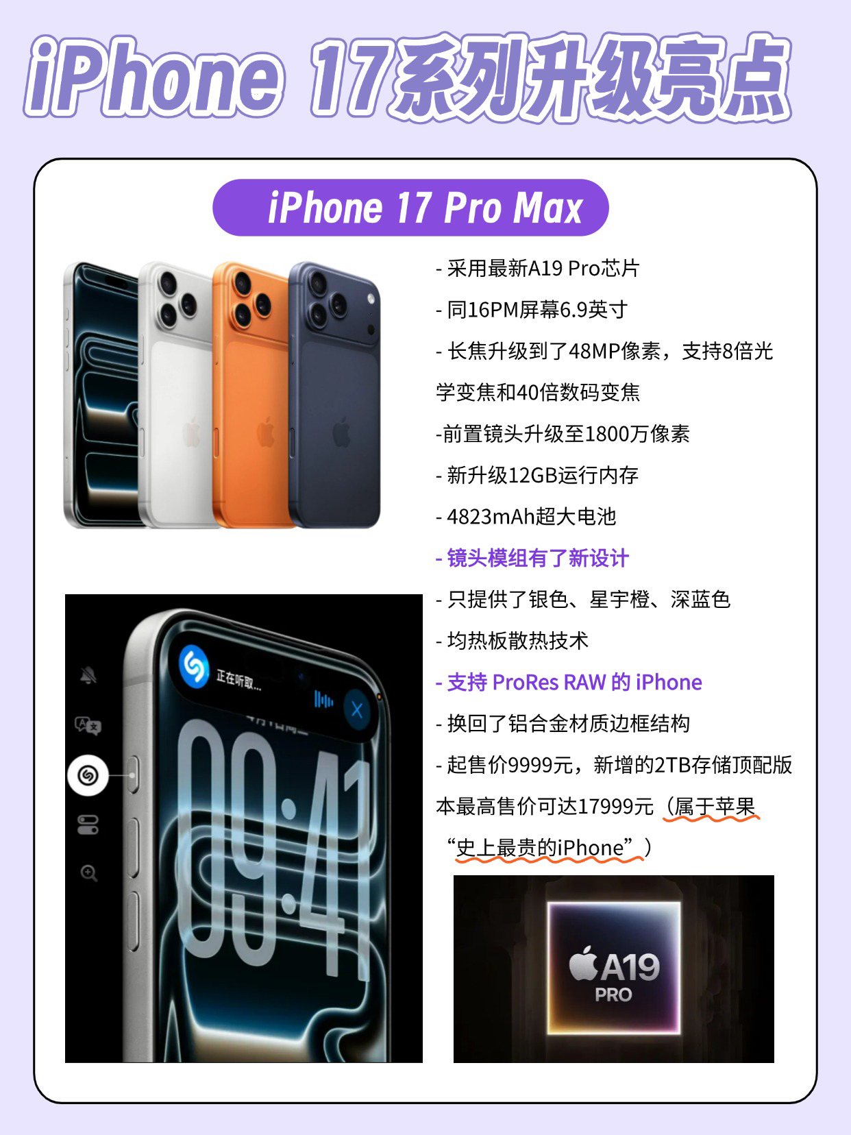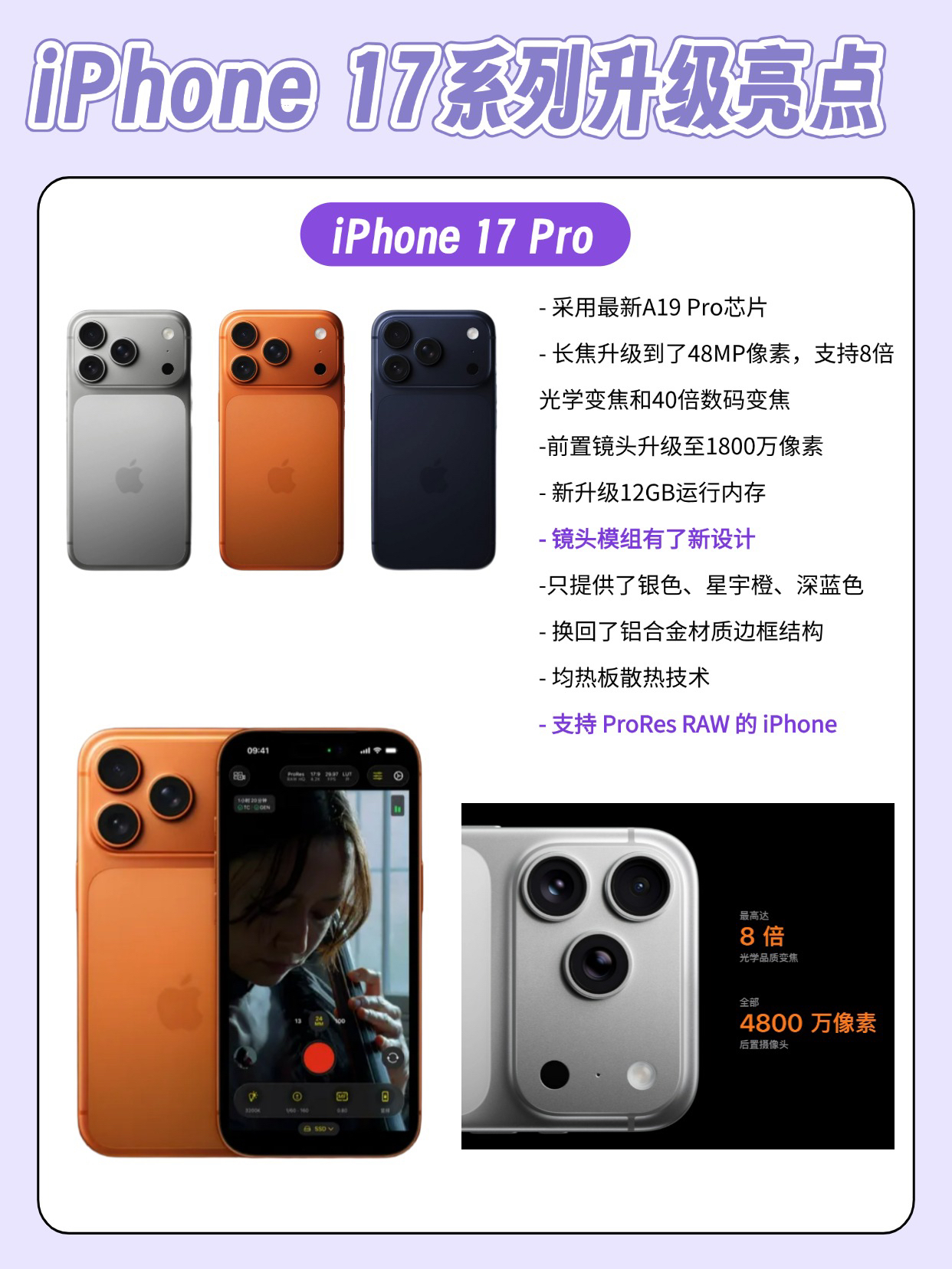 本篇笔记关联了Apple/苹果 iPhone17 5G 手机 超瓷晶面板2 防刮屏幕技术 6核CPU 5核GPU 120hz高刷 1800万前摄 自适应AI摄像 双卡 全网通 视网膜屏 薰衣草紫色、Apple/苹果 iPhone17 Pro Max 5G 手机 抗反射显示屏 全新散热系统 4800万像素镜头全模组 8K视频录制 8倍变焦 支持WIFI7 全网通 双卡 视网膜屏 银色、Apple/苹果 iPhone17 Pro 5G 手机 航空级铝合金材质 全新散热系统 7层抗反射涂层 4800万像素后摄全覆盖 全网通 双卡双待 视网膜屏 银色等商品,为用户提供真实的使用体验和购买参考。