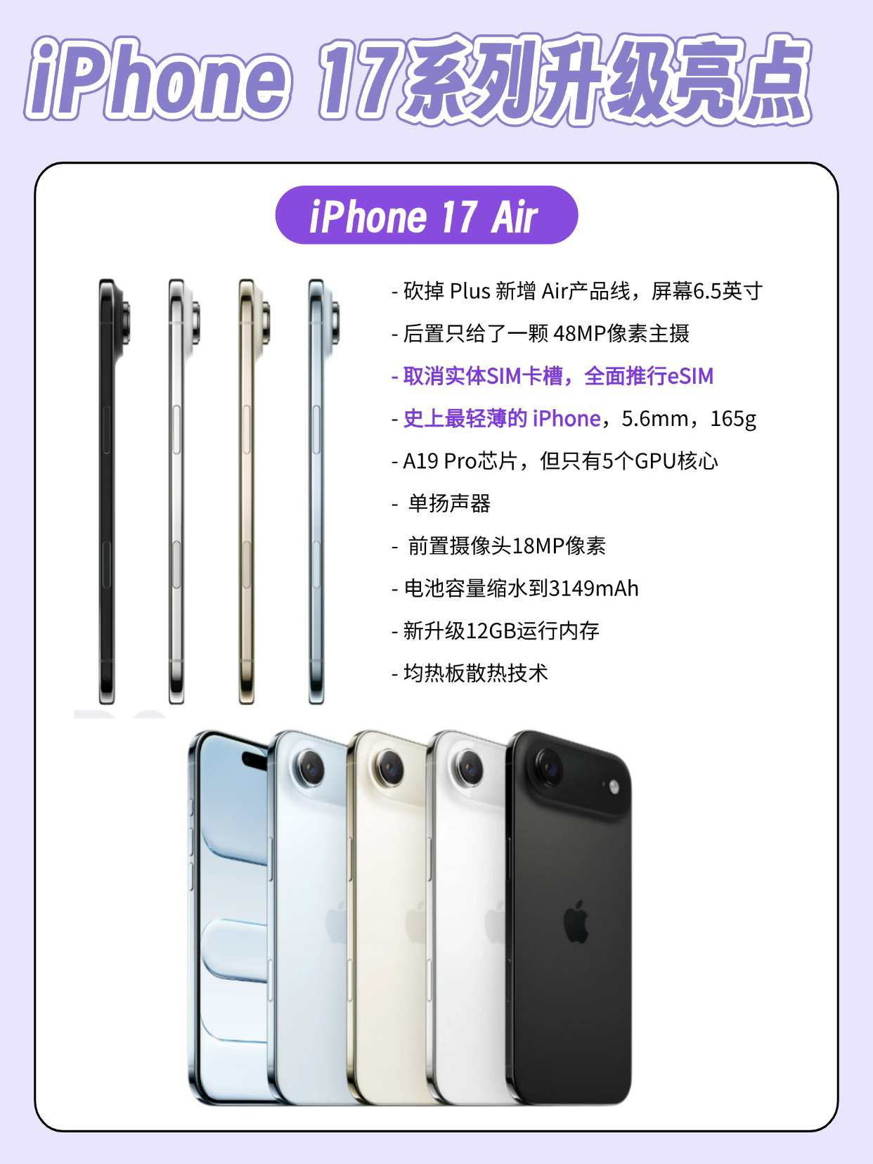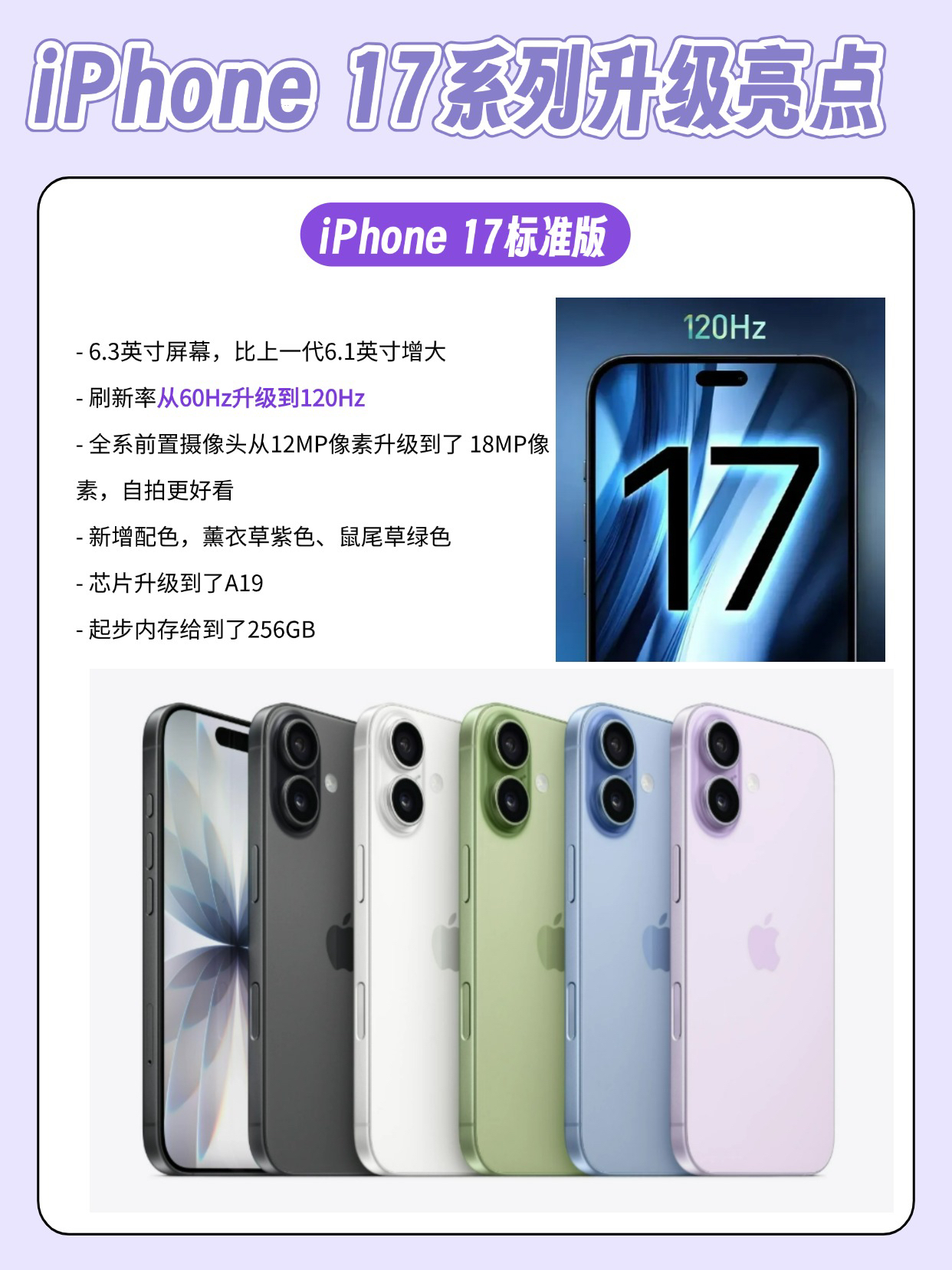 iPhone17系列正式发布啦,具体配置看图。 ✅标准版 iPhone 17 1、祖传60Hz屏,这回终于给到了120Hz ProMotion高刷 2、用上了A19新款芯片 3、超广角和主摄都采用了4800万像素融合式摄像头,前置用上了1900万像素整了一个叫做 Center Stage 的前摄像头,自拍更出片 4、全系128GB配置已经全部取消了,起步容量是256GB,挤了这么多牙膏...