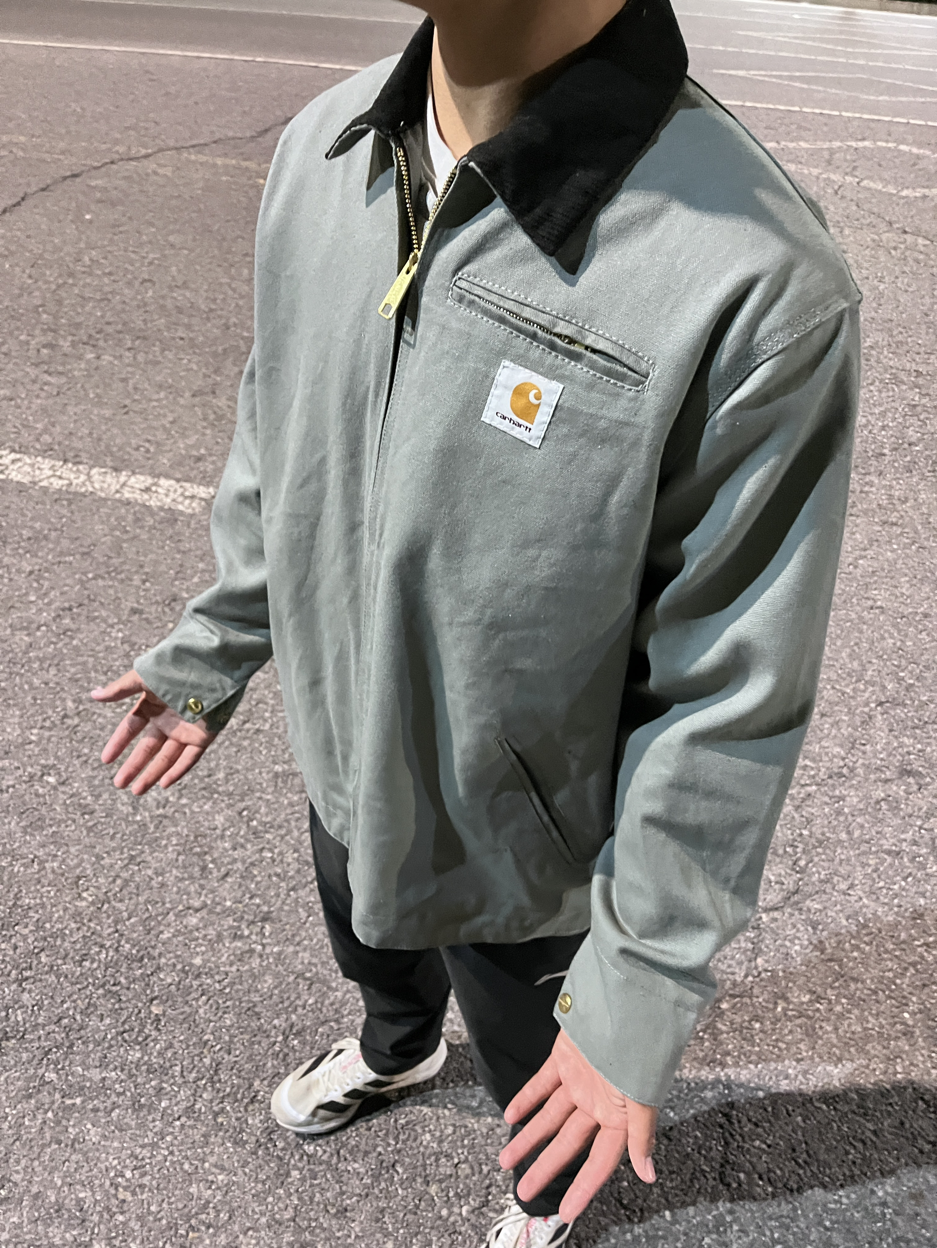 这件烟绿色的carhartt颜色高级的让我爱不释手 底特律是好穿的工装外套,是那种宽松立体的板型,灯芯绒衣领,胸前拉链口袋和拉链口袋下的经典贴布LOGO。下摆和袖口是可以调节的有扣子复古感满满 初秋不费力穿搭拿下