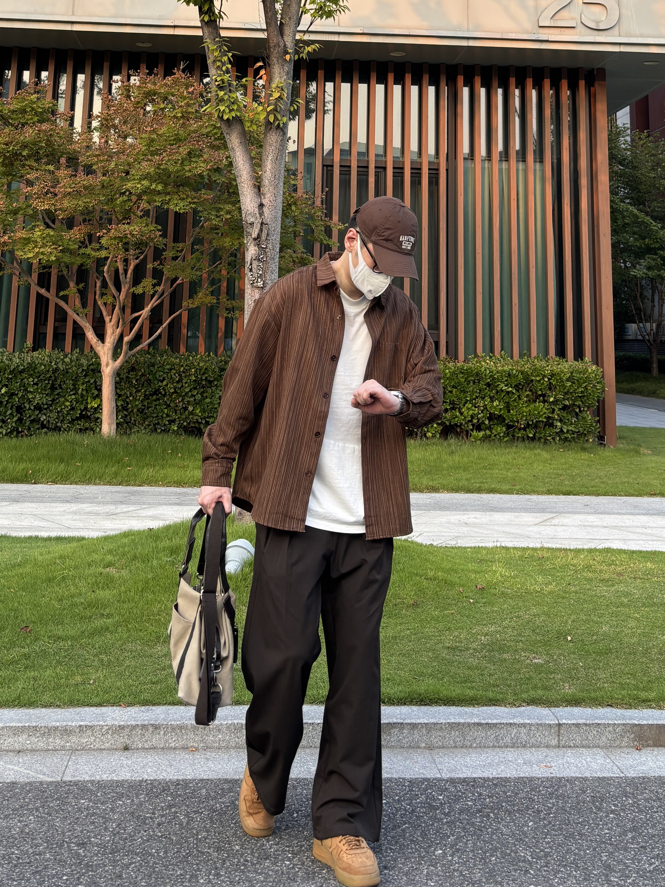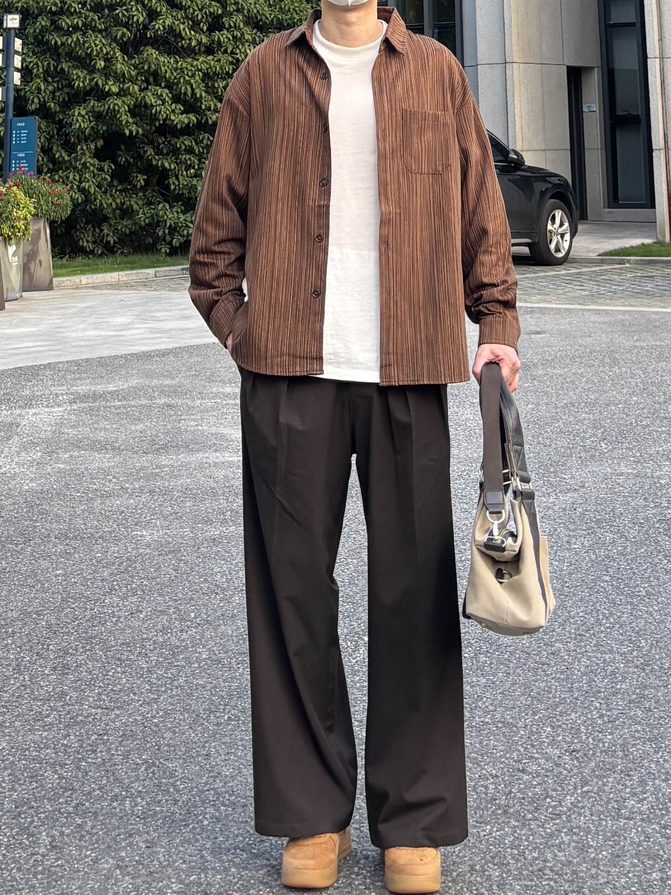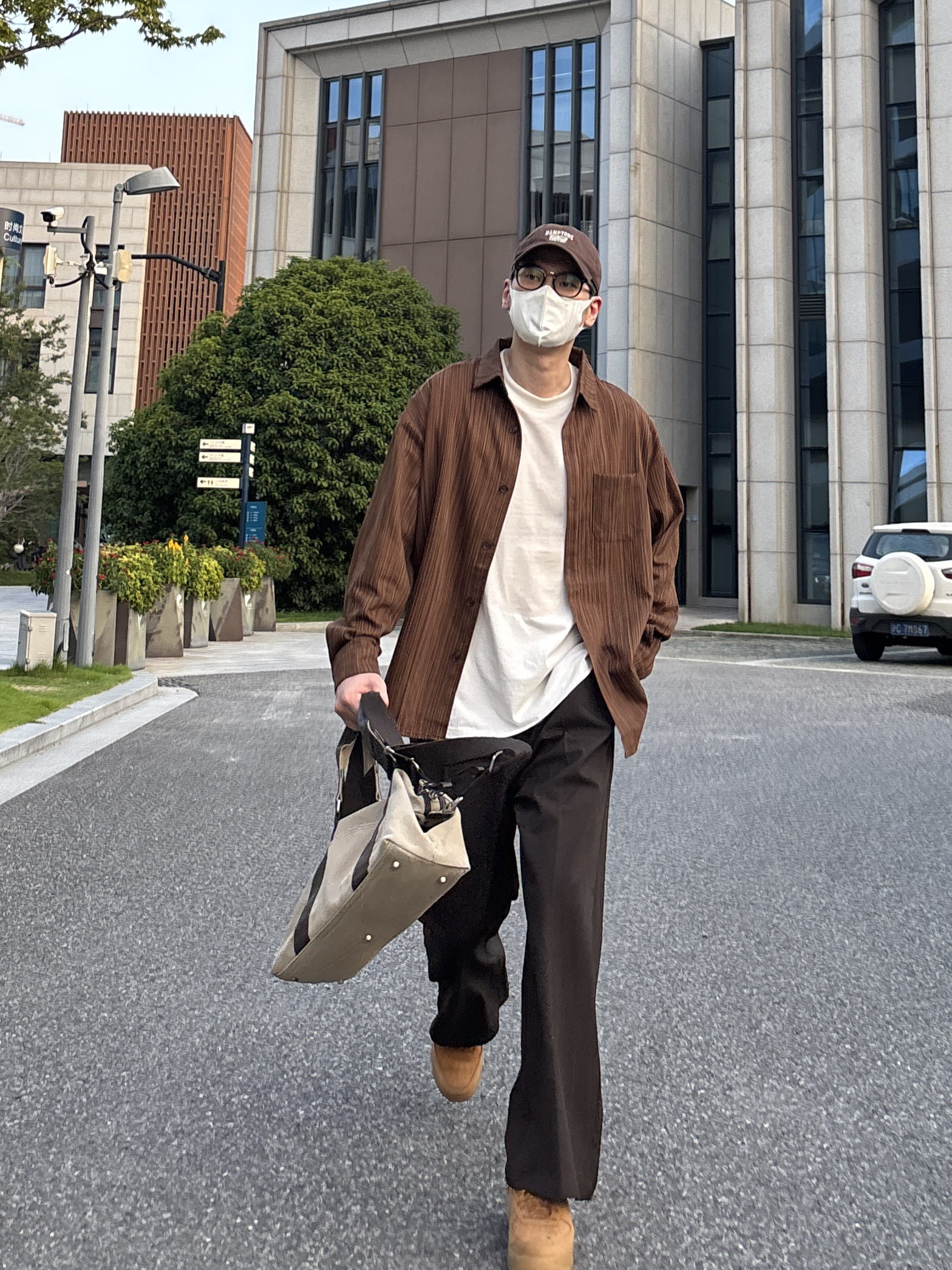今天这套上衣穿了一件氛围感十足的咖啡色宽松廓形条纹肌理感提花衬衫 ⬇️ 裤子选择松弛显腿长的深咖色直筒垂感西装裤 ⬇️ 鞋子上脚经典百搭的小麦色af1 ⬇️ 最后拿一个卡其色帆布拼接手提包解放双手 - 今日搭配 衣服裤子:NICE LILI 鞋子:AF1小麦
