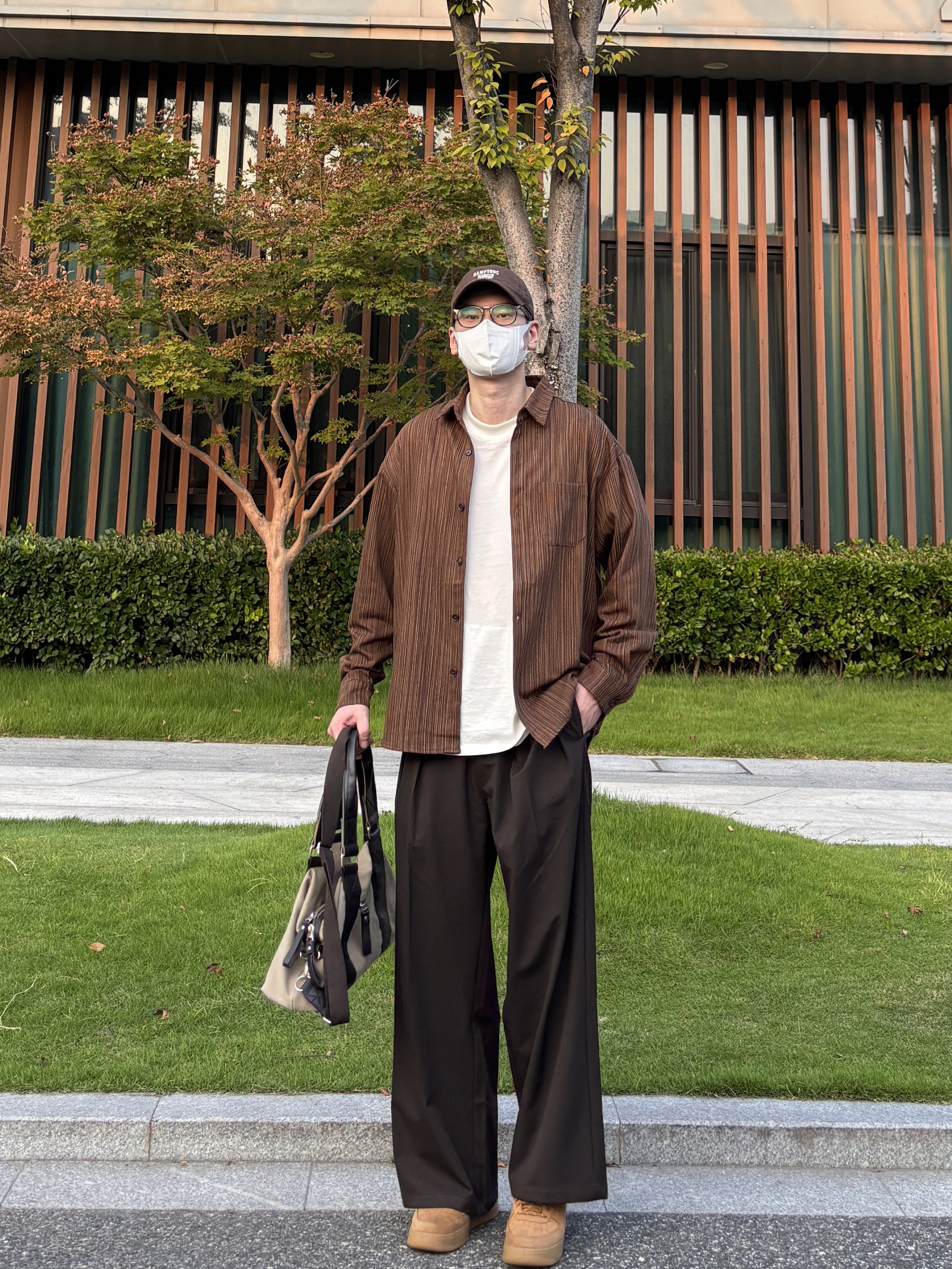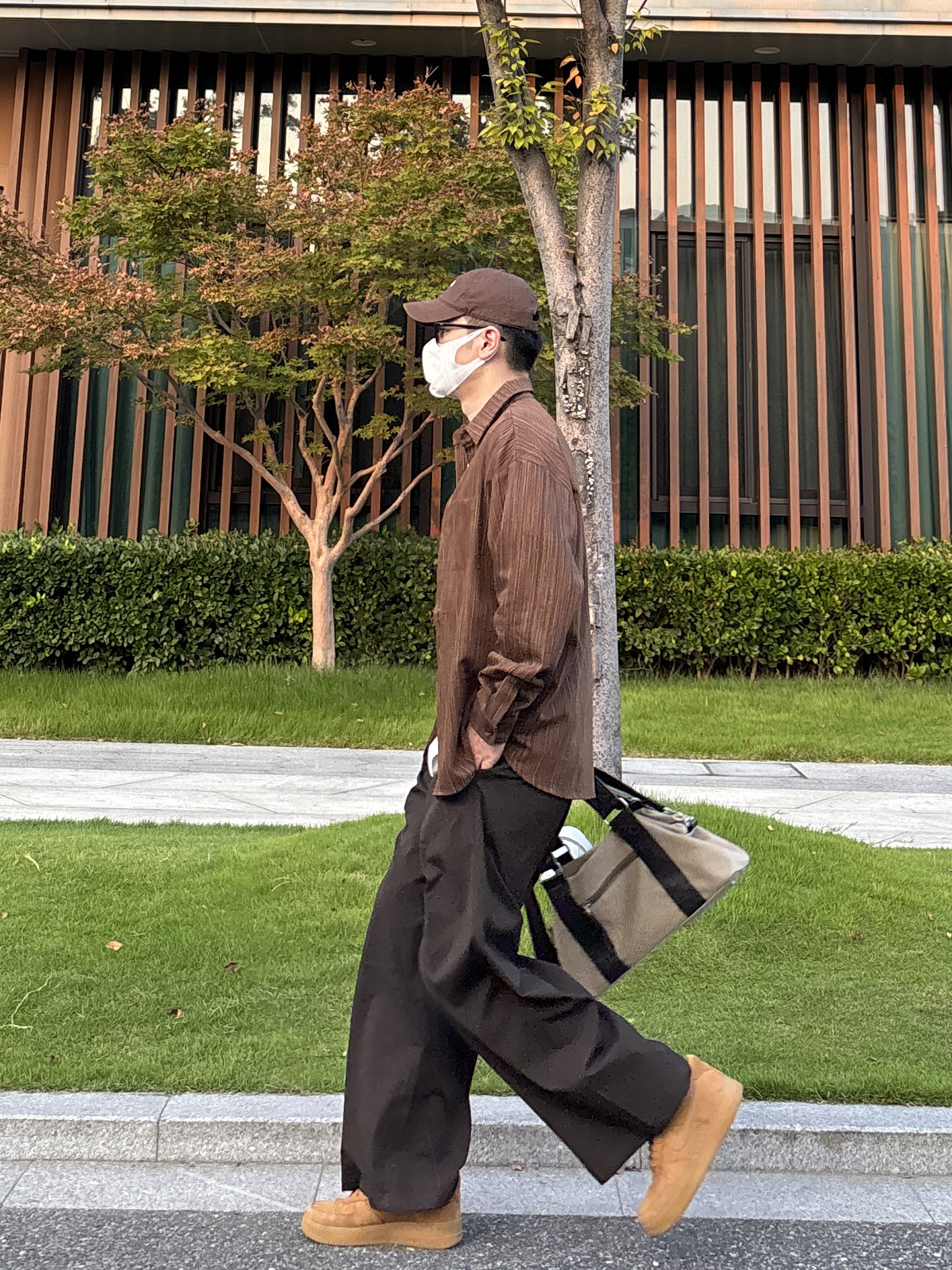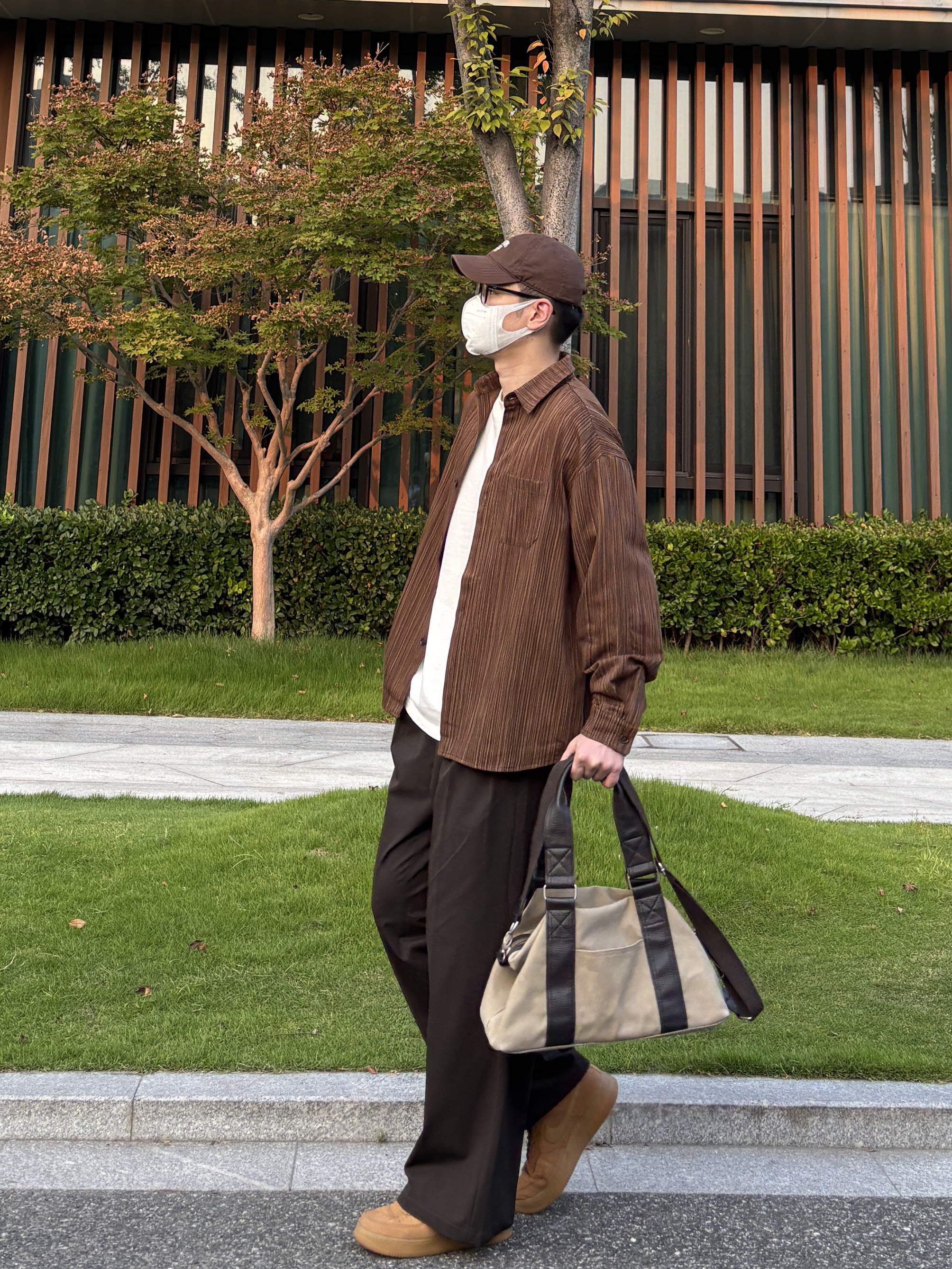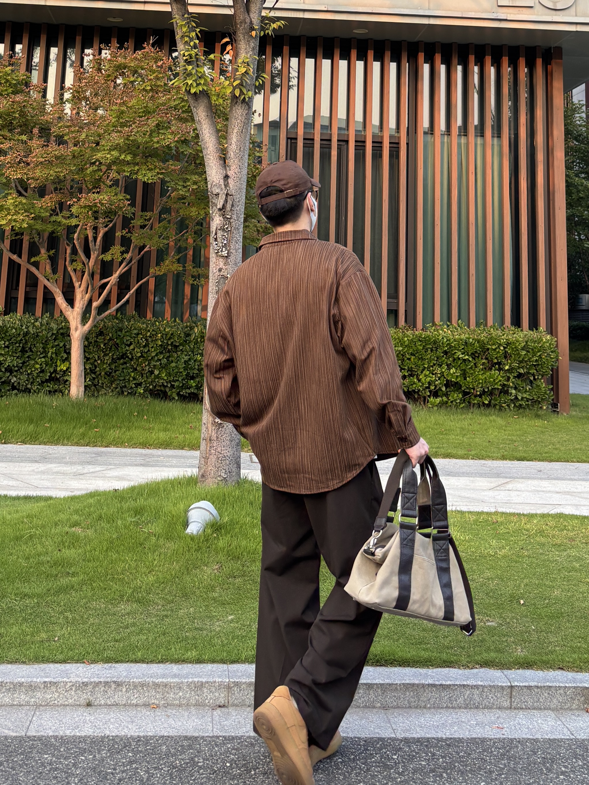 今天这套上衣穿了一件氛围感十足的咖啡色宽松廓形条纹肌理感提花衬衫 ⬇️ 裤子选择松弛显腿长的深咖色直筒垂感西装裤 ⬇️ 鞋子上脚经典百搭的小麦色af1 ⬇️ 最后拿一个卡其色帆布拼接手提包解放双手 - 今日搭配 衣服裤子:NICE LILI 鞋子:AF1小麦