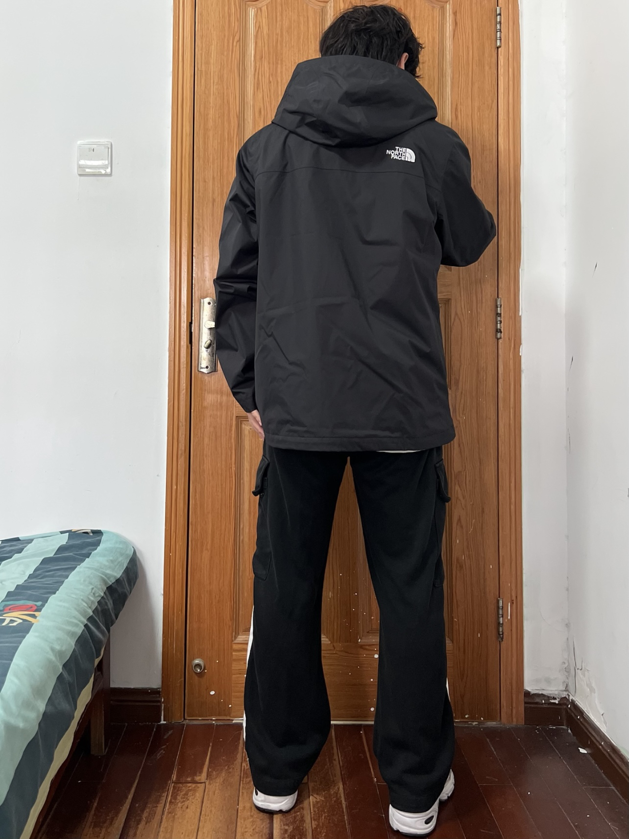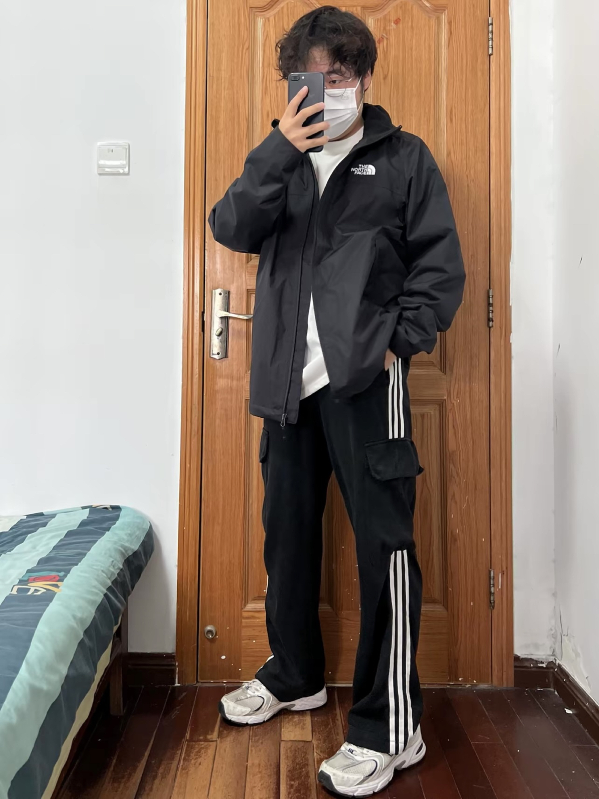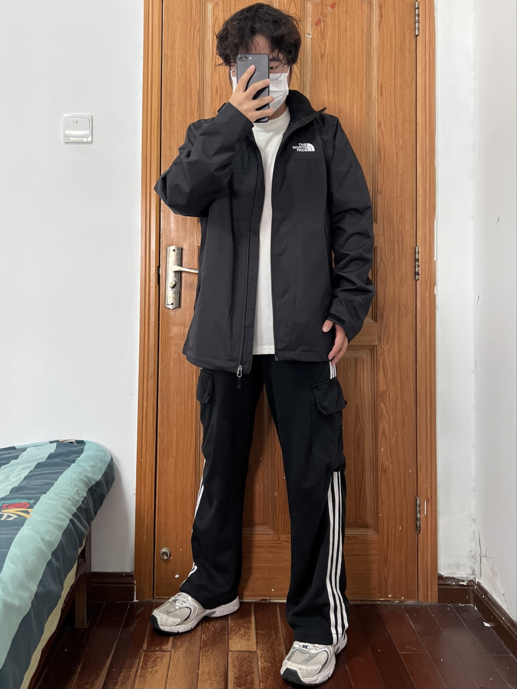 今日份穿搭分享🎉 THE NORTH FACE 黑武士冲锋衣 前后都有的白色刺绣logo略显低调大气🉑️ 不同于其他品牌冲锋衣的年年变动经典永流传 版型设计偏宽松可内加抓绒羽绒内胆冬季穿 我拥有一件TA长期主义没问题👀 搭配一条黑色条纹长裤和白色运动鞋帅上加帅 👔 170/130斤 L