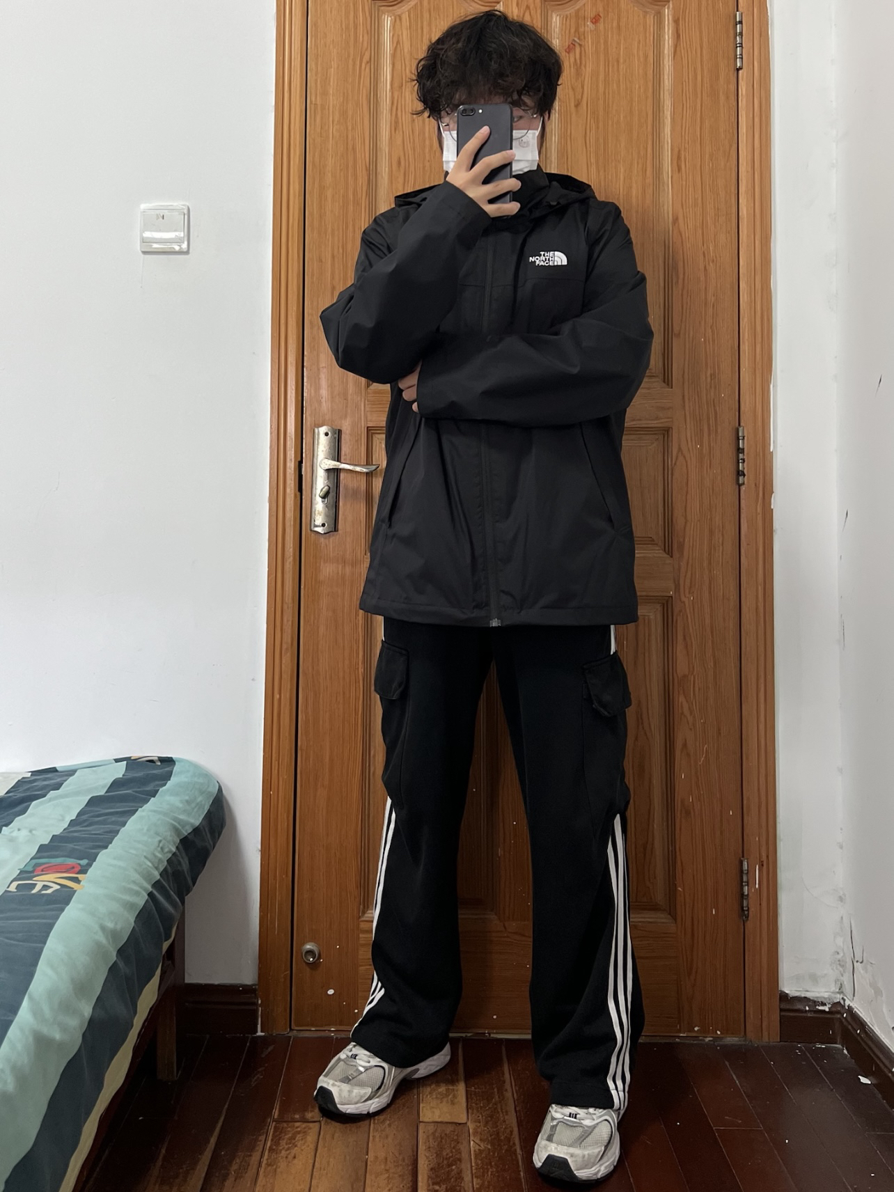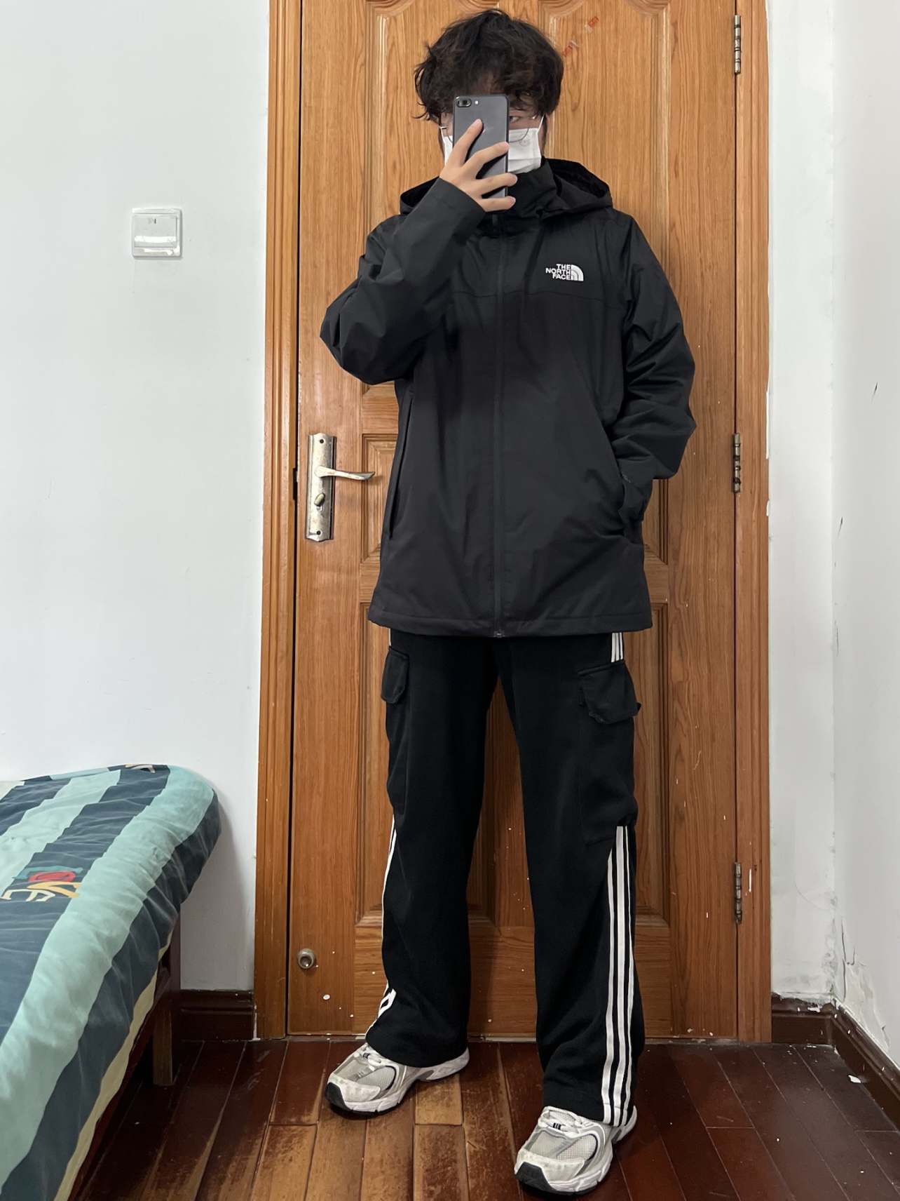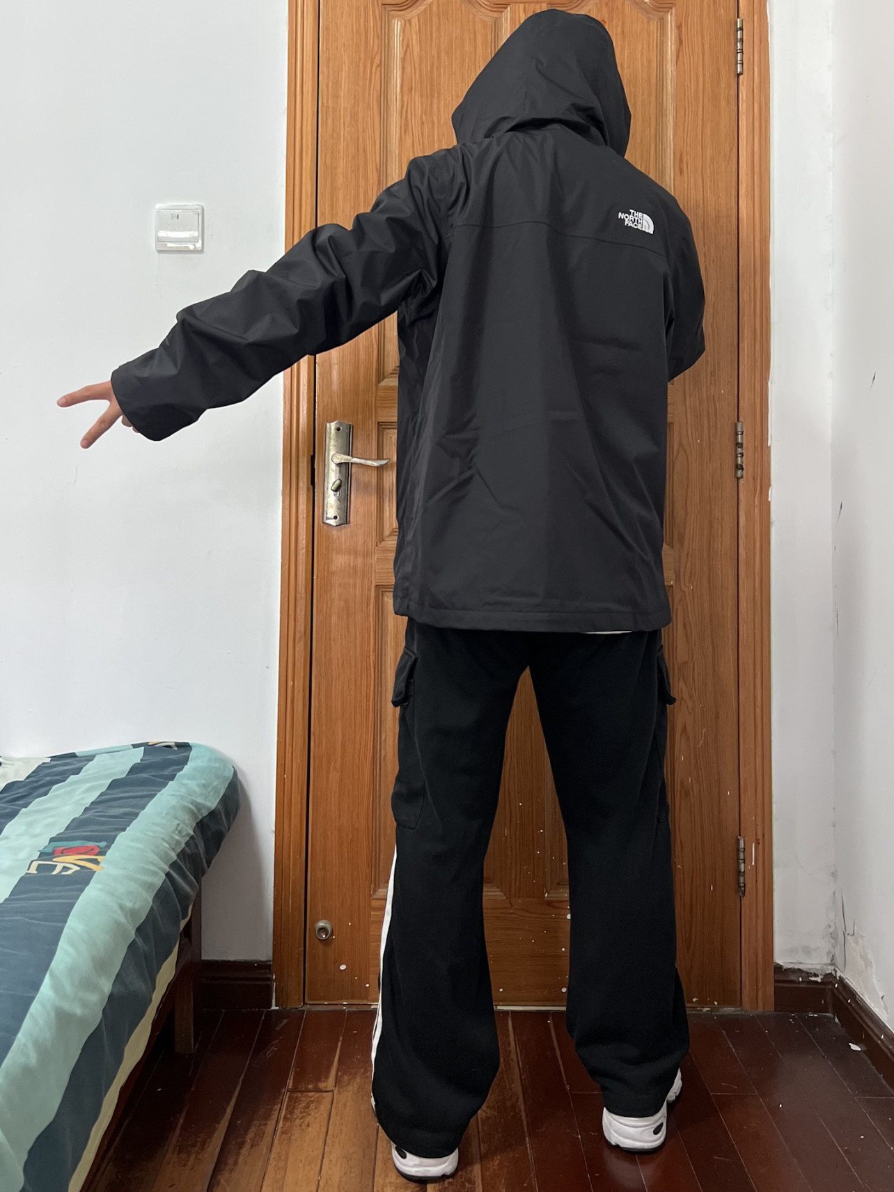 今日份穿搭分享🎉 THE NORTH FACE 黑武士冲锋衣 前后都有的白色刺绣logo略显低调大气🉑️ 不同于其他品牌冲锋衣的年年变动经典永流传 版型设计偏宽松可内加抓绒羽绒内胆冬季穿 我拥有一件TA长期主义没问题👀 搭配一条黑色条纹长裤和白色运动鞋帅上加帅 👔 170/130斤 L