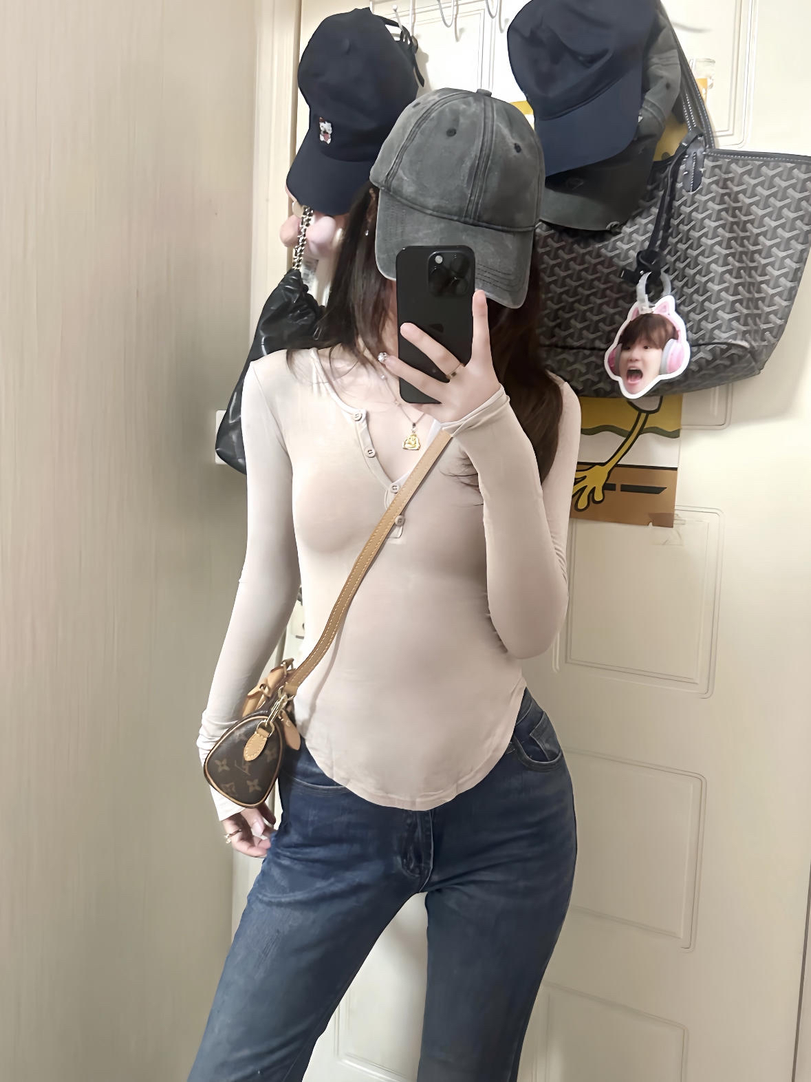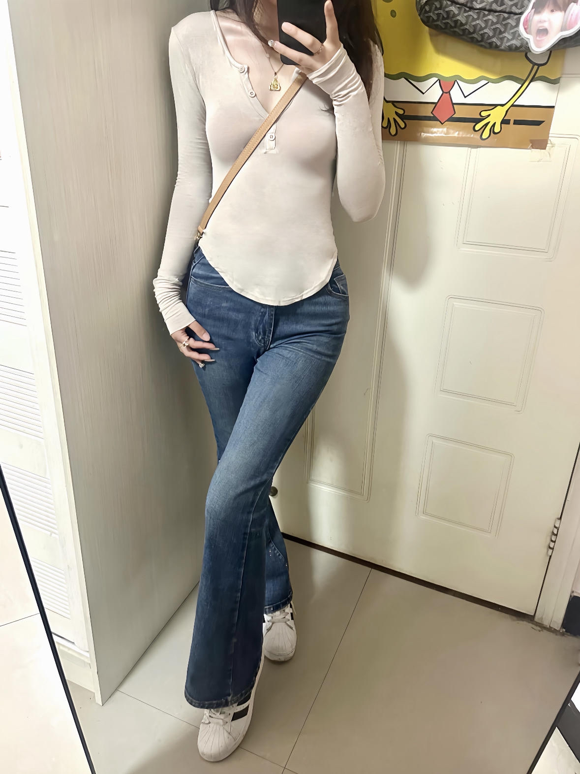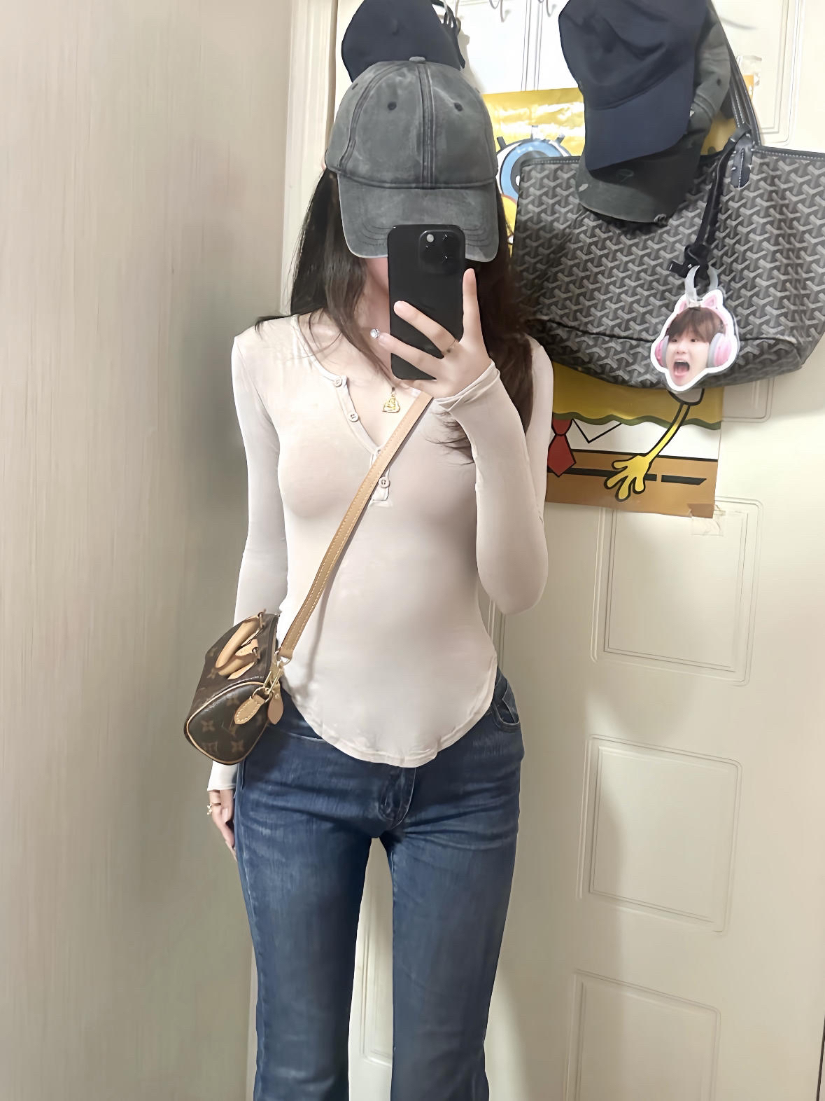 自带纯欲滤镜的v领打底! 软糯亲肤➕微微透肉的设计 谁穿谁是纯欲代名词~ 搭配牛仔裤和阿迪鞋子 又是一种不一样的感觉🥰
