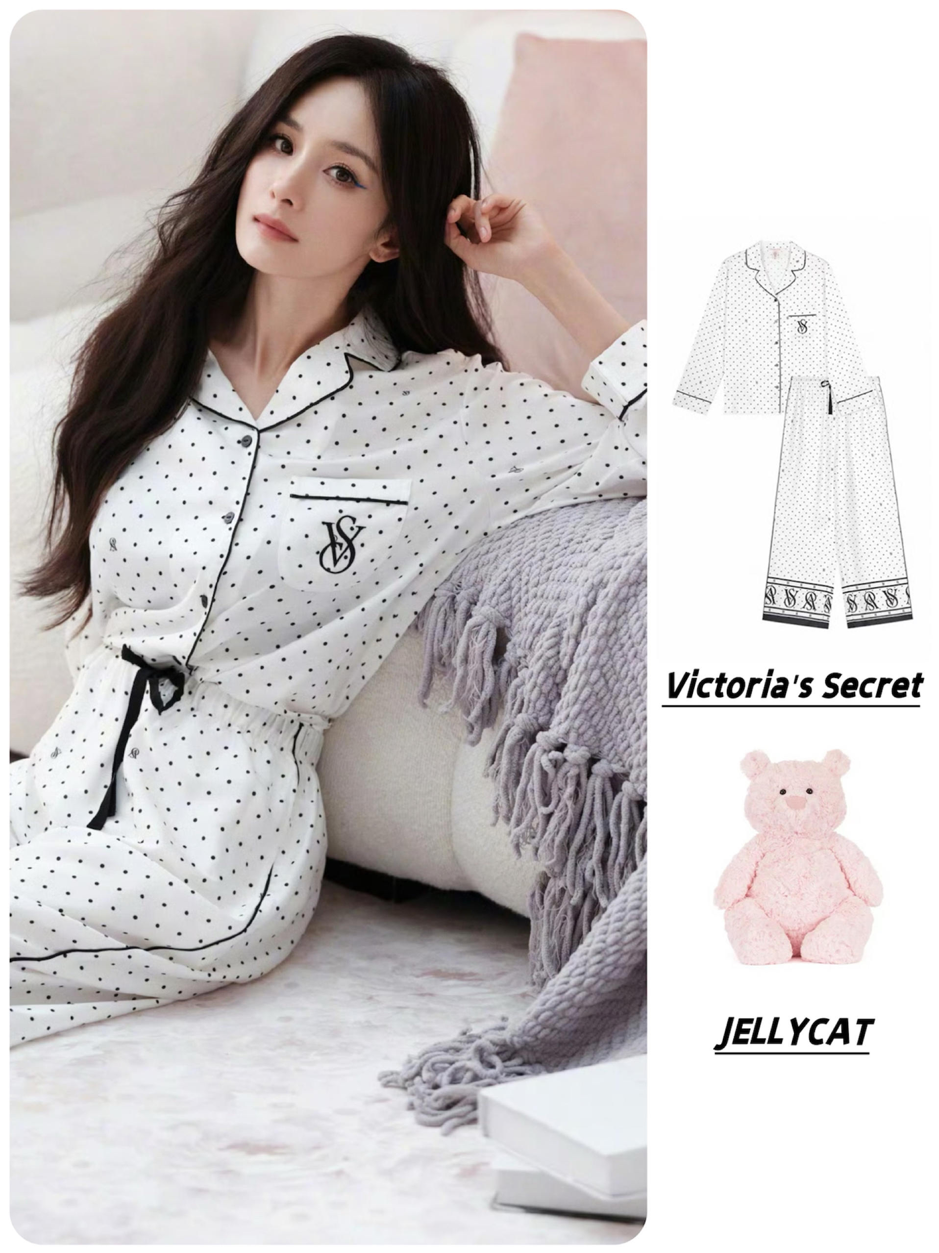 谁懂啊家人们!幂姐同款维密波点睡衣 直接把「慵懒+高级」狠狠拿捏住🤌 ✨ 波点+品牌字母 设计感拉满 经典黑白波点永不过时,裤腿的品牌字母印花,精致又有辨识度,居家穿像画报里的慵懒美人~ ✨ 质感绝了 软乎乎好贴肤 缎面材质顺滑又亲肤,垂坠感一绝,穿上像被云朵包裹,舒适度直接拉满💯 维密女孩速冲!!这套幂式慵懒风睡衣,居家/出片都封神,get同款做精致懒美人🔗 图源网络,侵删