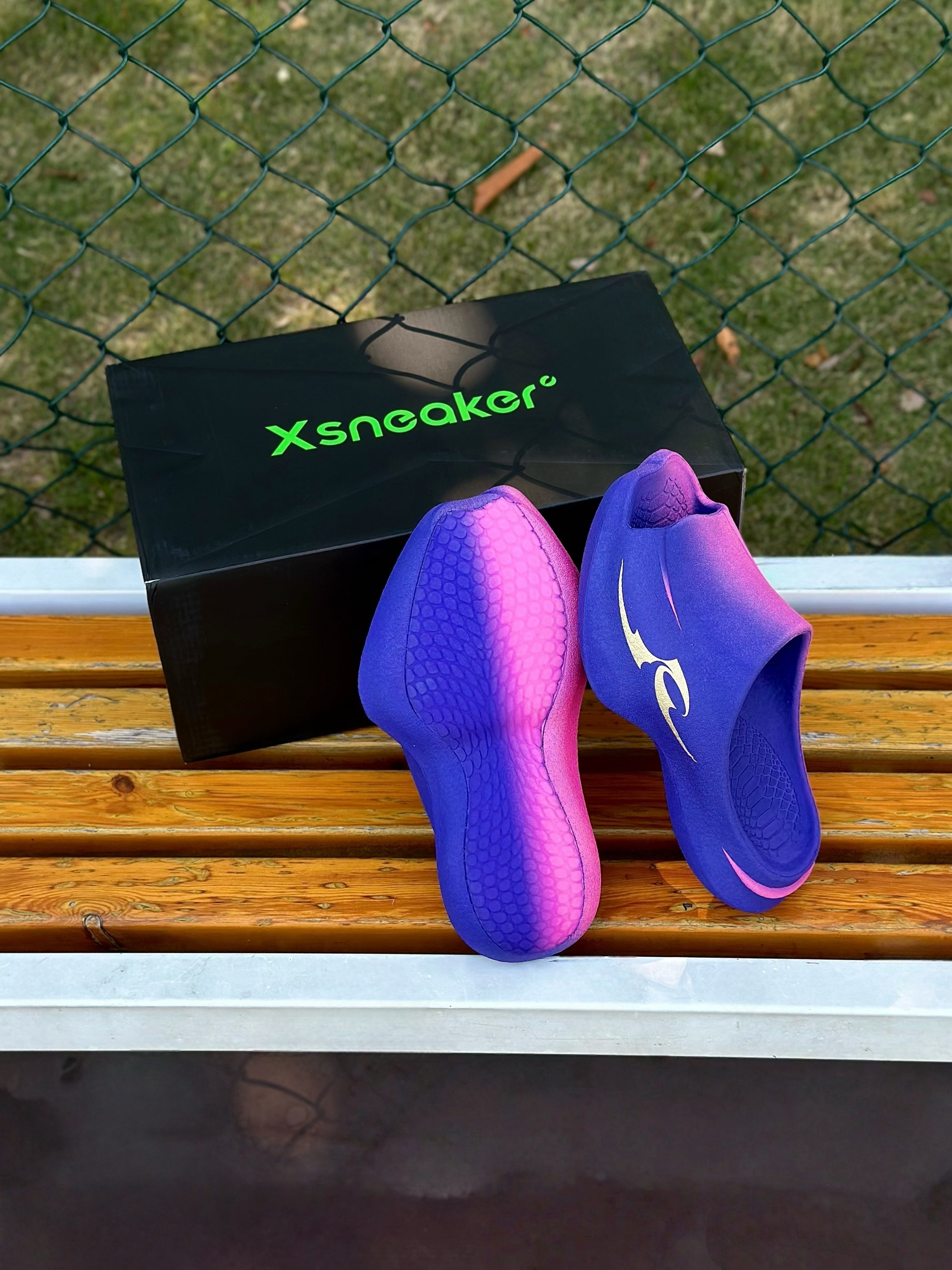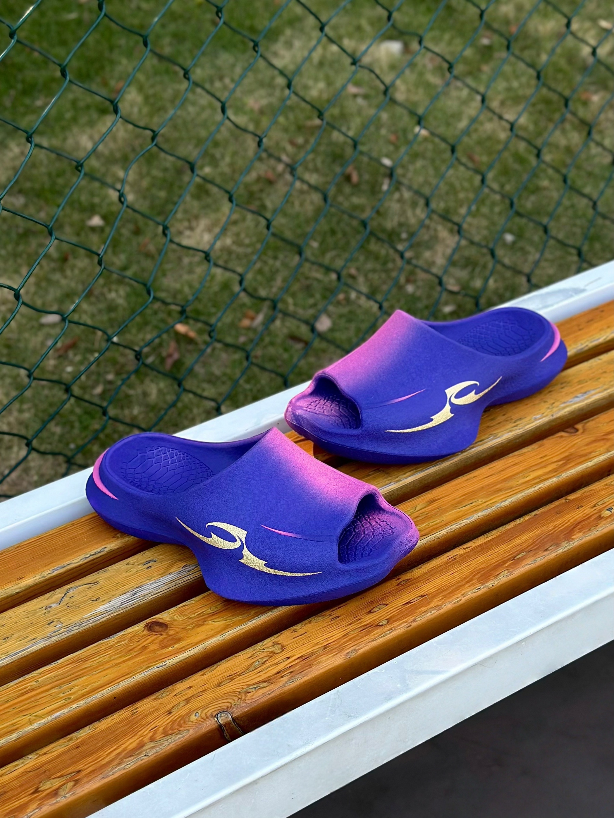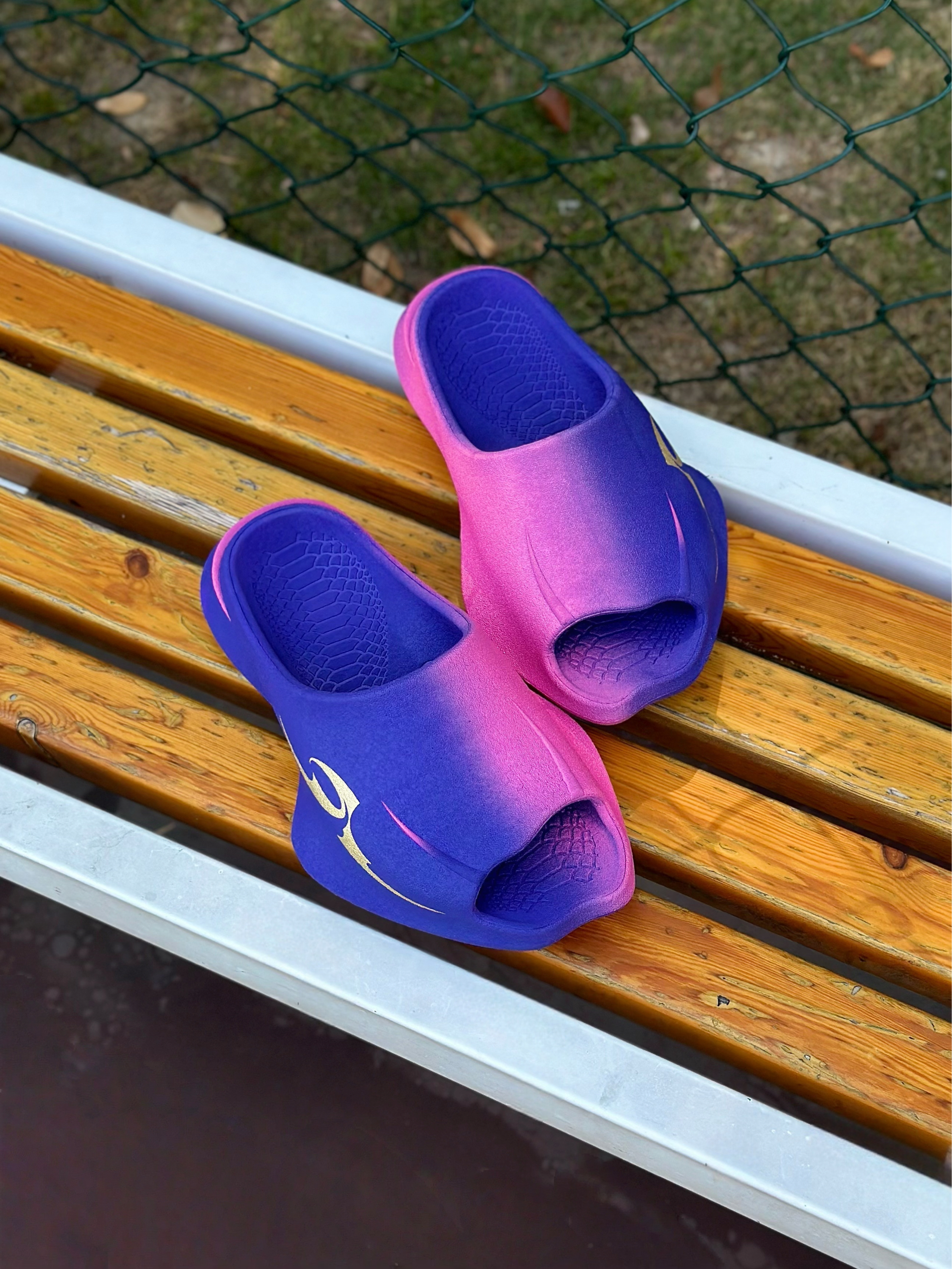发现一双好酷的一体成型超临界拖鞋, xsneaker曼巴拖~ 这款配色的名字也很有诗意 「八千里路云和月」 它以紫色为韵,缀金色为辉,染粉色为梦 多巴胺撞色设计上脚简直不要太吸晴✨。 同时整体的造型设计也很新潮, 搭配上蛇元素,致敬曼巴! 主要加厚的中底踩起来也很软弹, 平常休闲出街,打球穿都OK! 尺码方面建议选大一码哦…