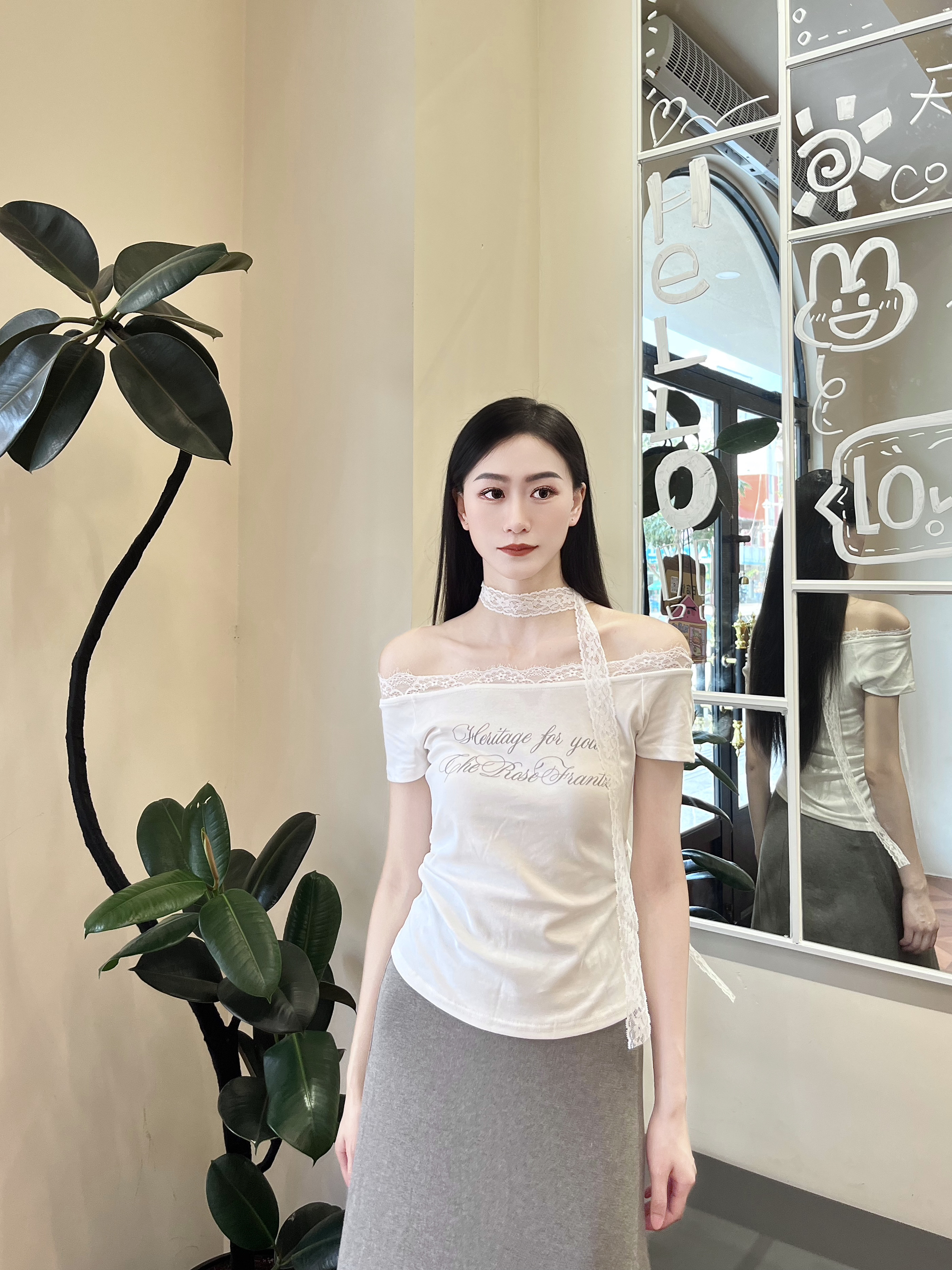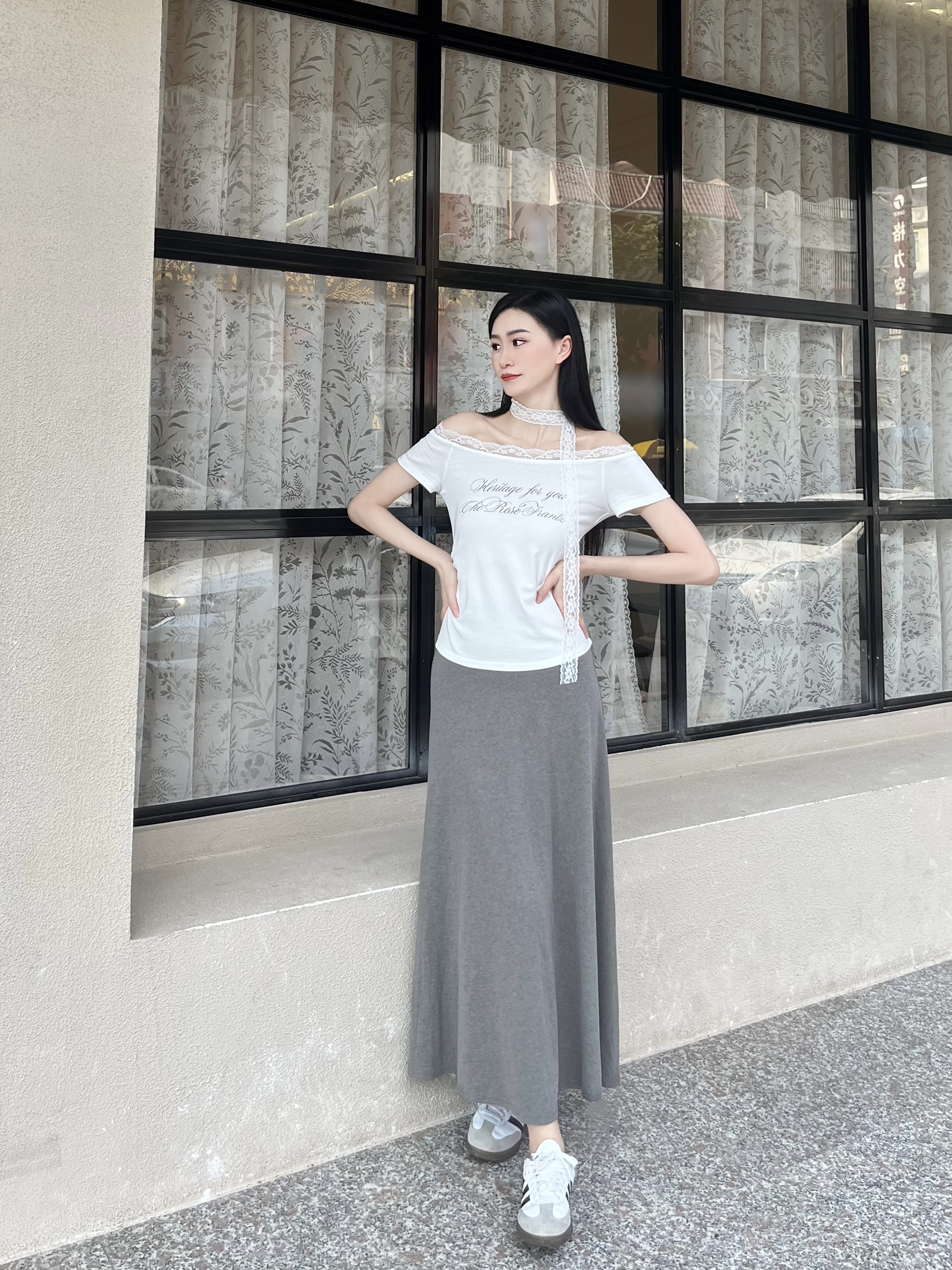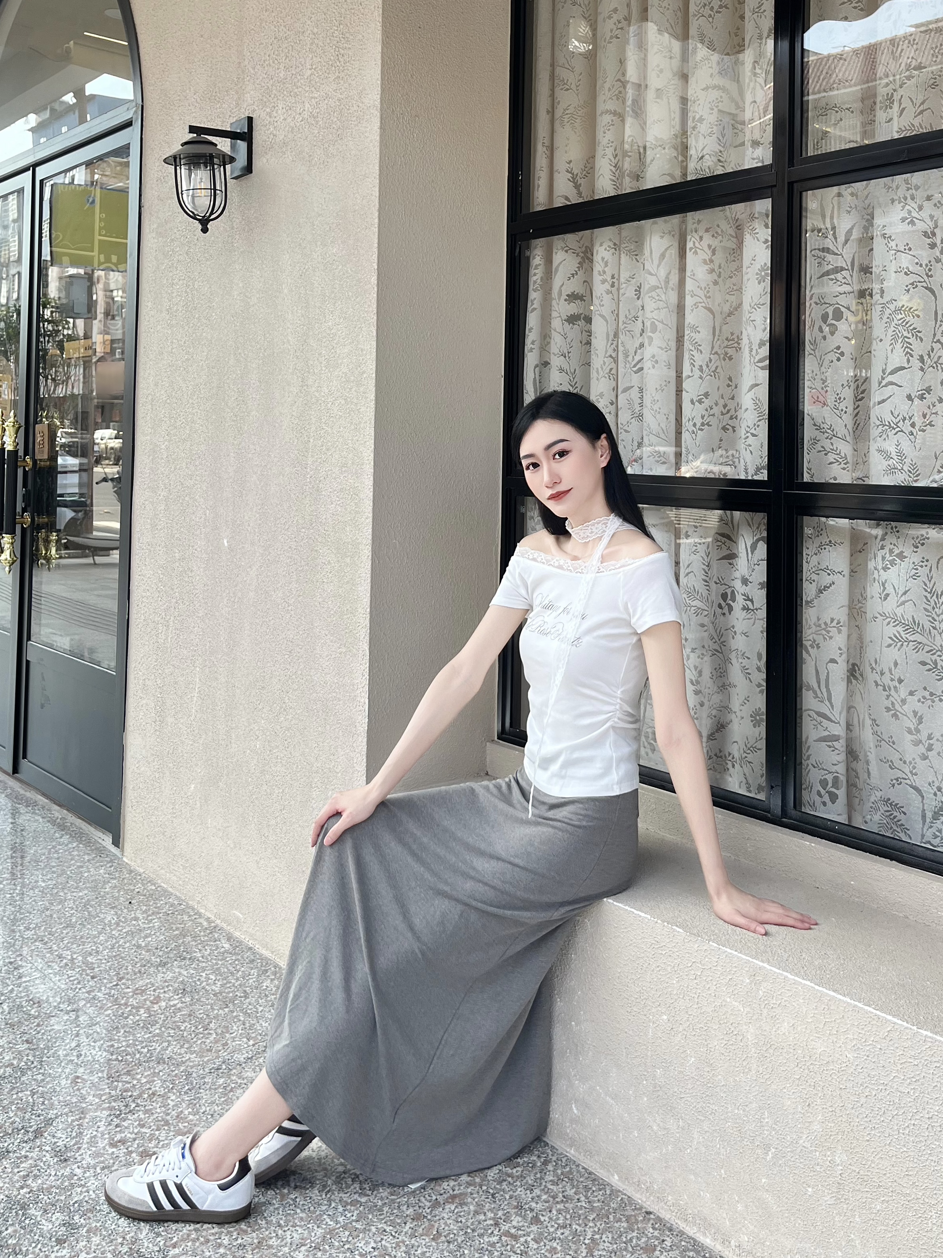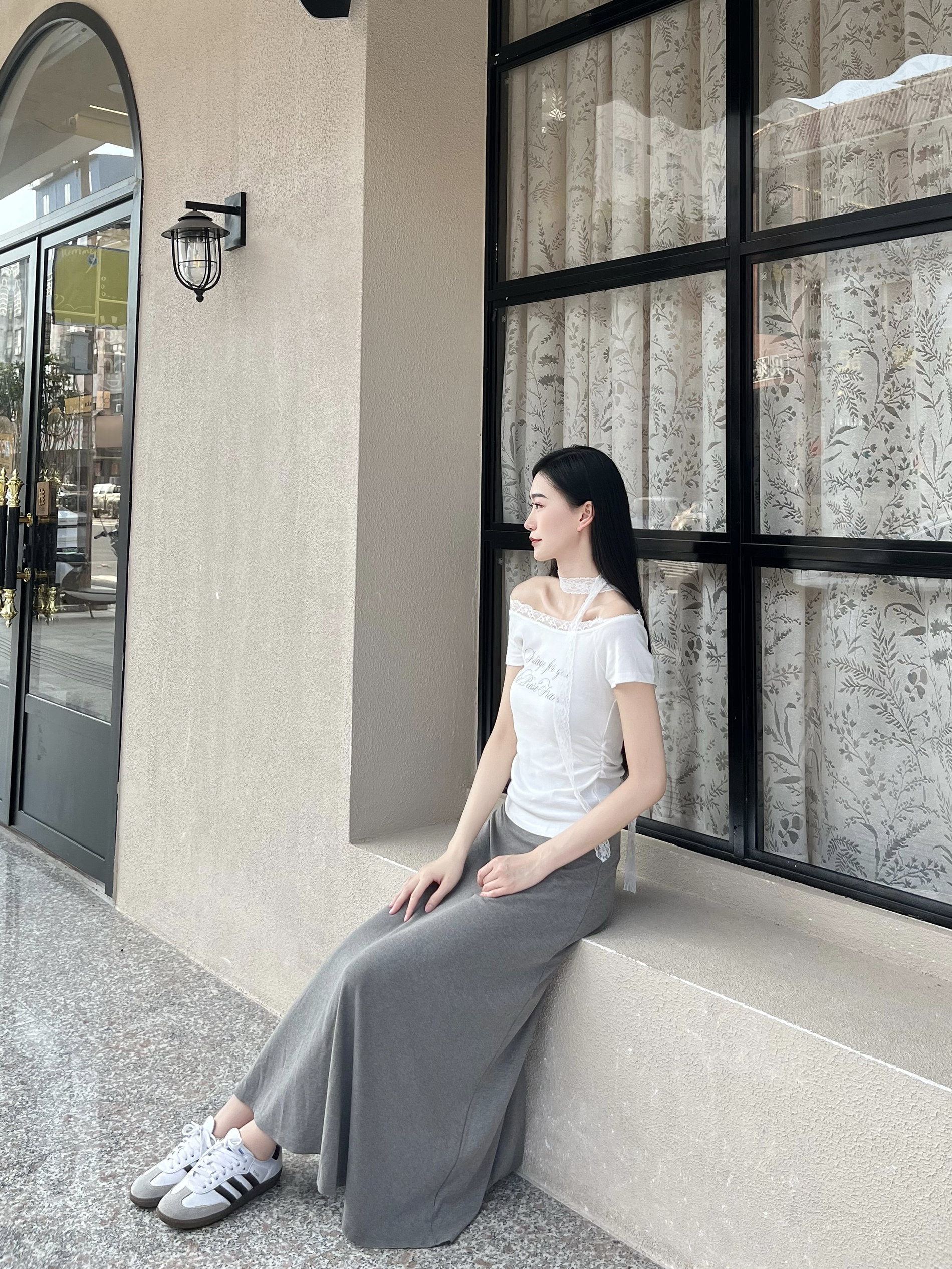 露肩上衣配灰色长裙,蕾丝设计精致,简约又纯欲,搭配adidas低帮板鞋 夏日出街超吸睛!