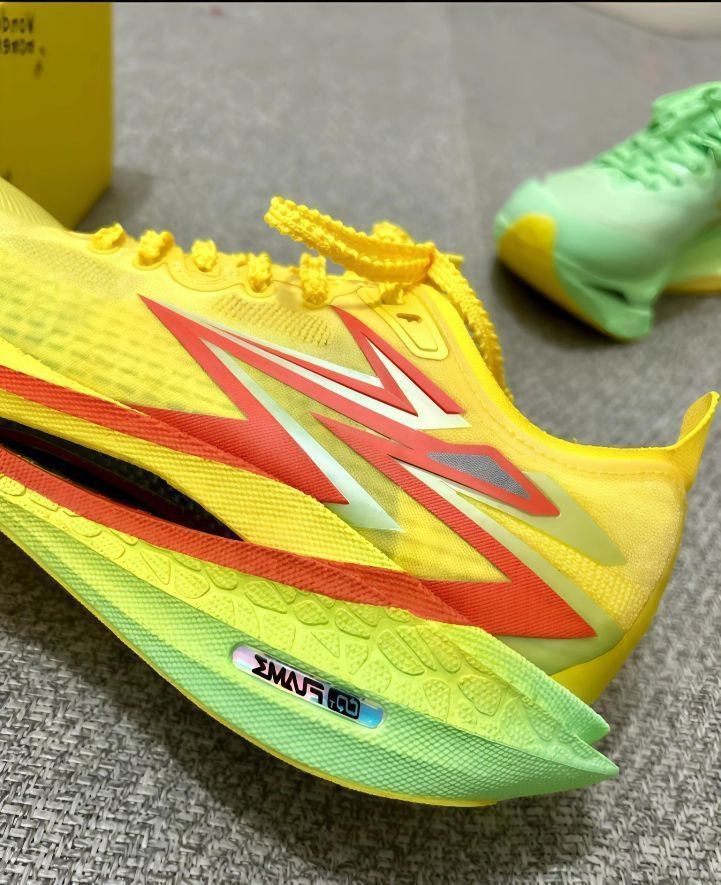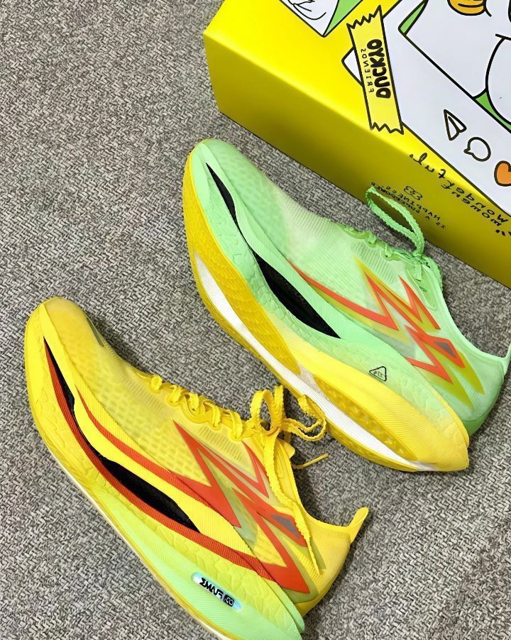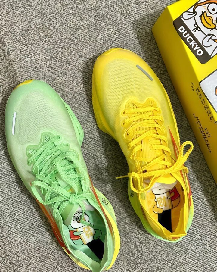 是一双鸳鸯鞋耶✌🏻 绿色和黄色组合的 鞋子是网面的,左右两边也是 鞋后跟印字也有趣[狗头_blue] 穿上试了下,还挺软弹的 对学生党以及体育生是个不错的选择,鞋子有碳板的加持,能够帮助提升成绩。