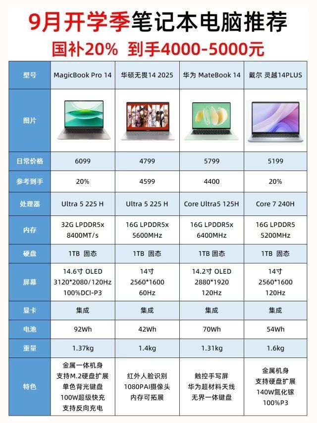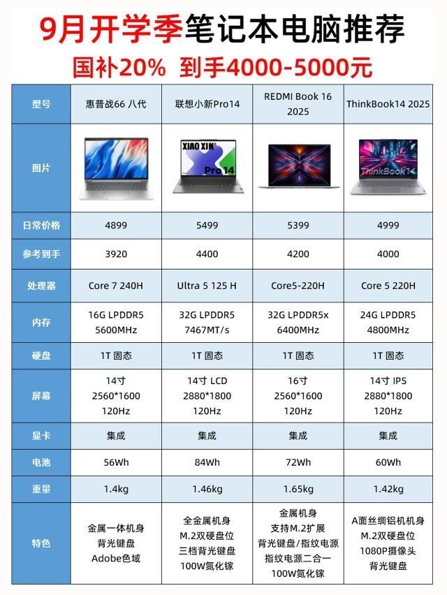 随着9月开学季的到来,又到一波笔记本电脑选购潮,还没有入手的小伙伴赶紧看过来,这次整理了8款4000-5000元的笔记本电脑机型给大家参考。 1惠普战66八代 2联想小新Pro14 3REDMI book 16 2025 4Thinkbook14 2025 5荣耀MagicBook Pro14 6华硕无畏142025 华为Matebook14 8戴尔灵越14Plus 有弱显卡需求的可以考虑酷睿U...