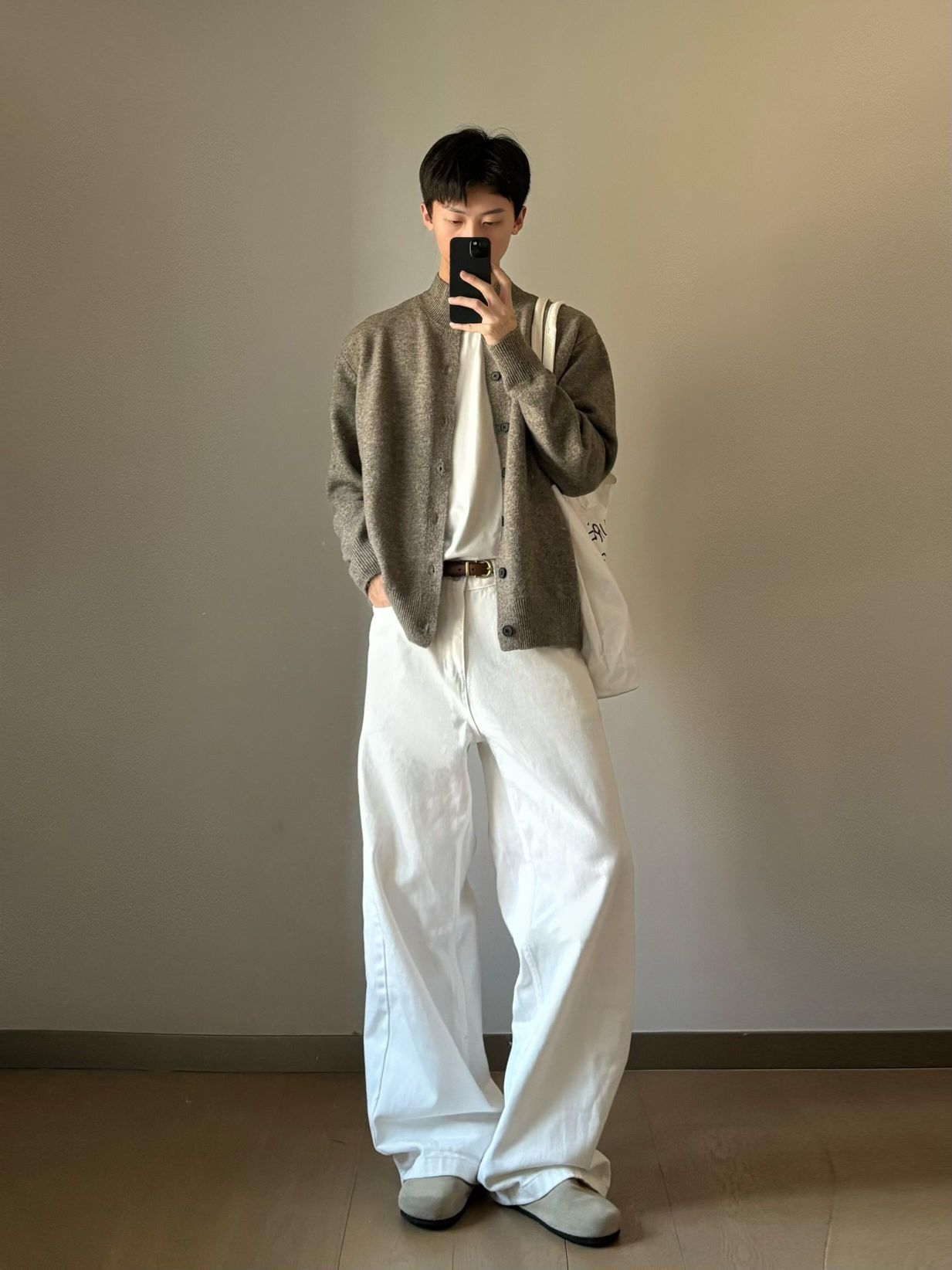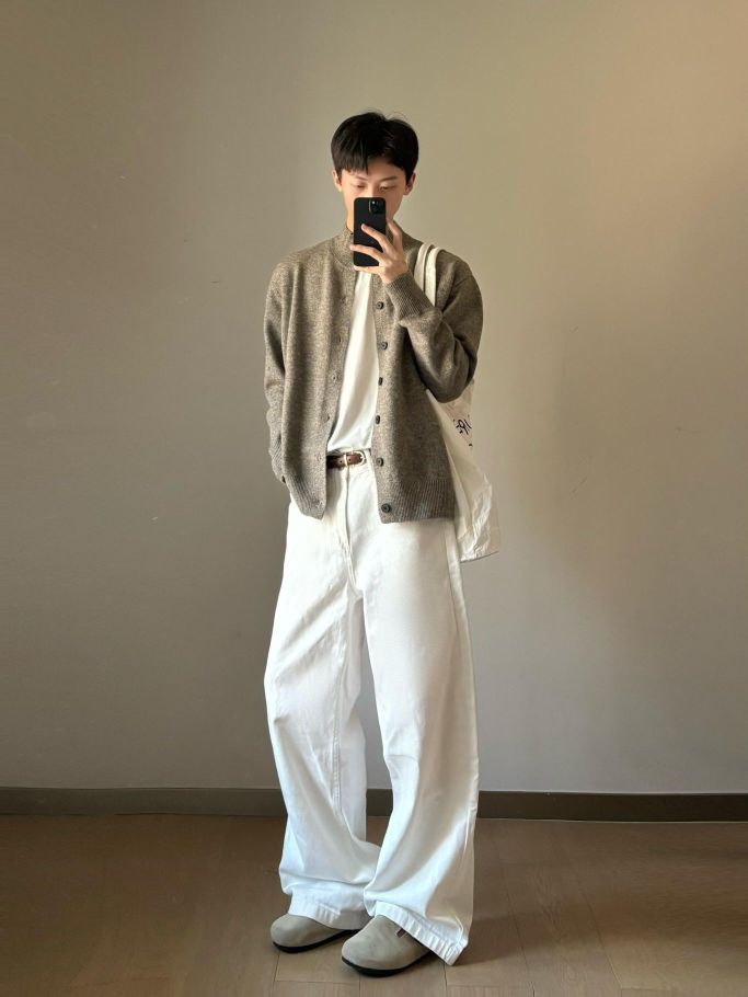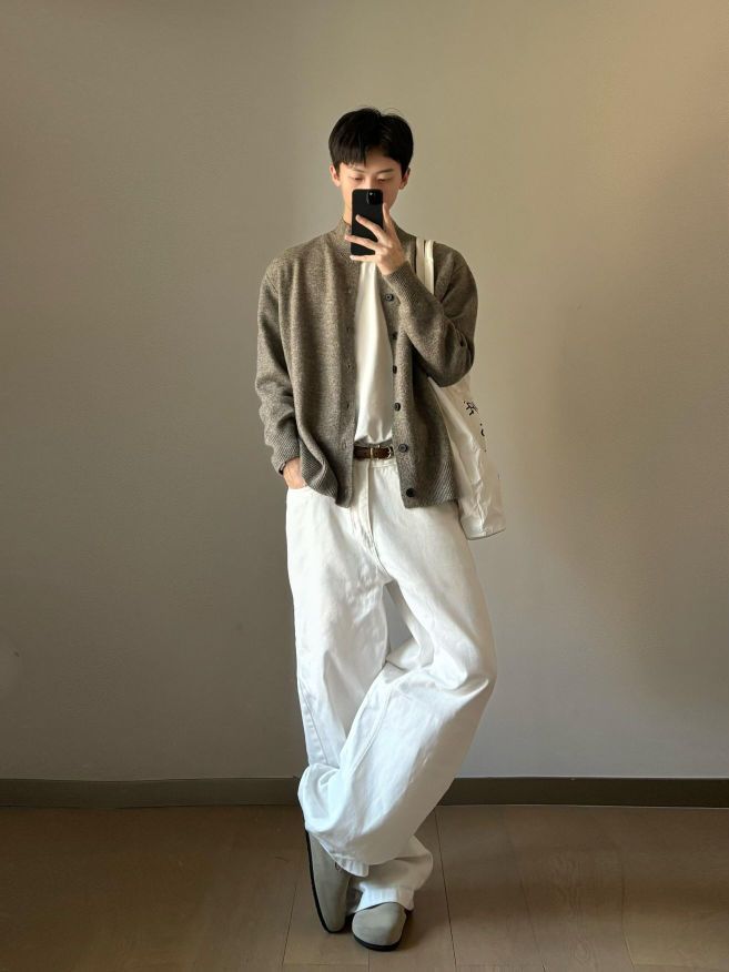 👔上衣选了浅咖色针织开衫,软糯又有质感,内搭简约白T,层次立马出来。 👖下装搭配白色阔腿裤,宽松版型超显腿长,还很自在。 👟脚上踩一双浅灰休闲鞋,和整体色调呼应。再挎个帆布包,随性又有秋天那味儿了~