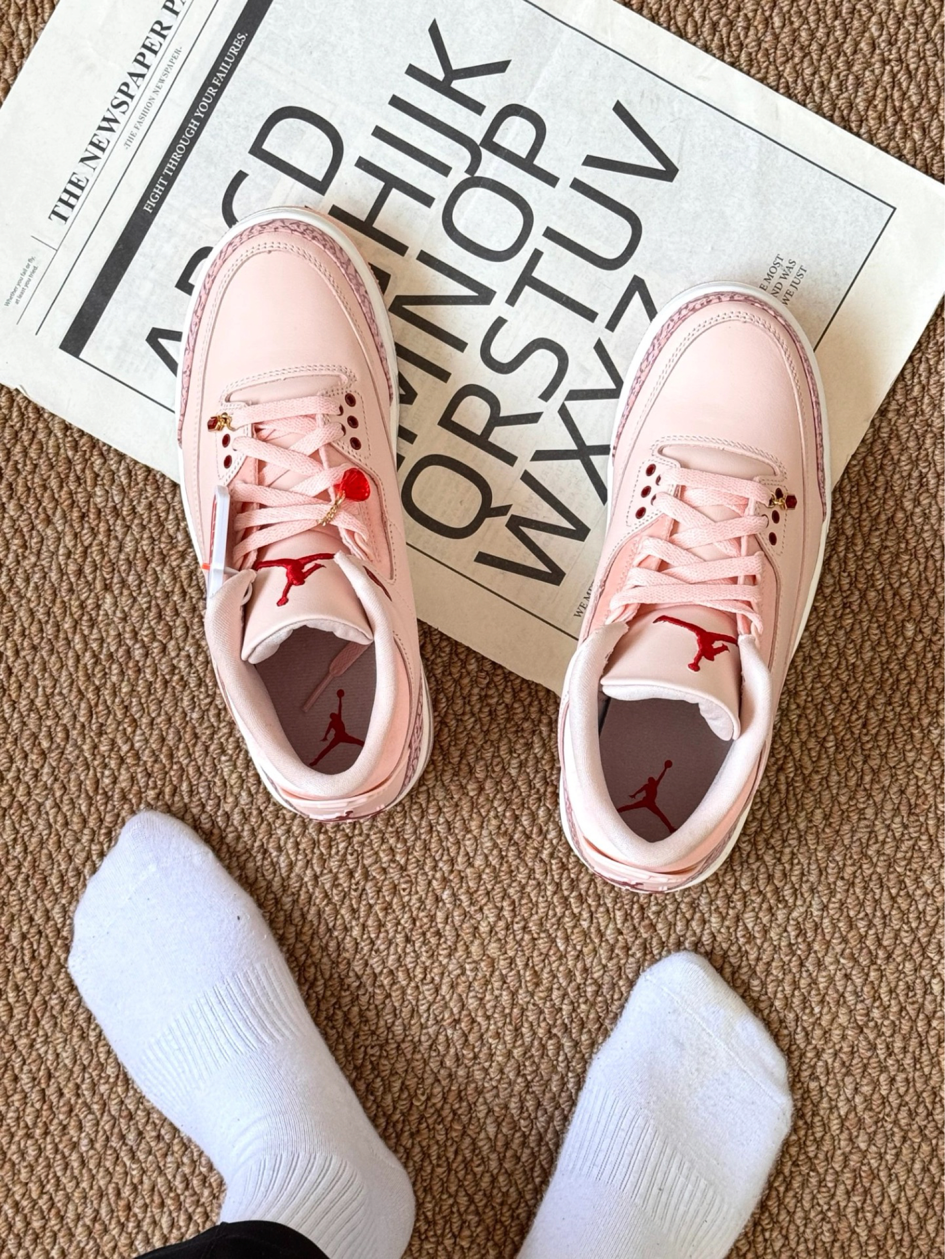 对于好看又好穿的鞋子 我真的一点抵抗力都没有哇~ 这双藕粉色AJ3也泰好看了叭,粉色鞋面搭配红宝石点缀,高端奢华一整个心动住 鞋型看起来很力挺,上脚显腿长 平时搭配牛仔裤、休闲裤都hin不错!