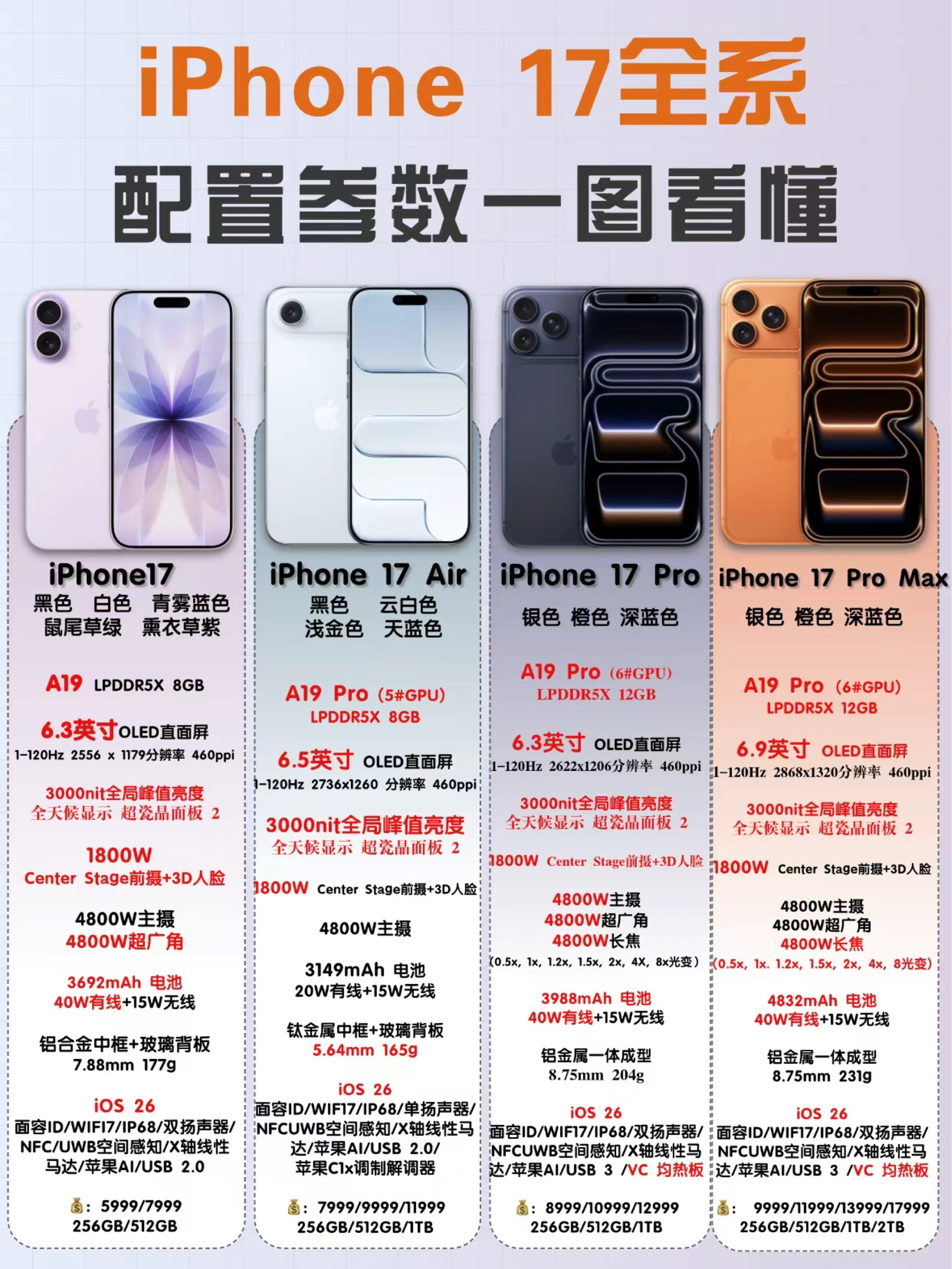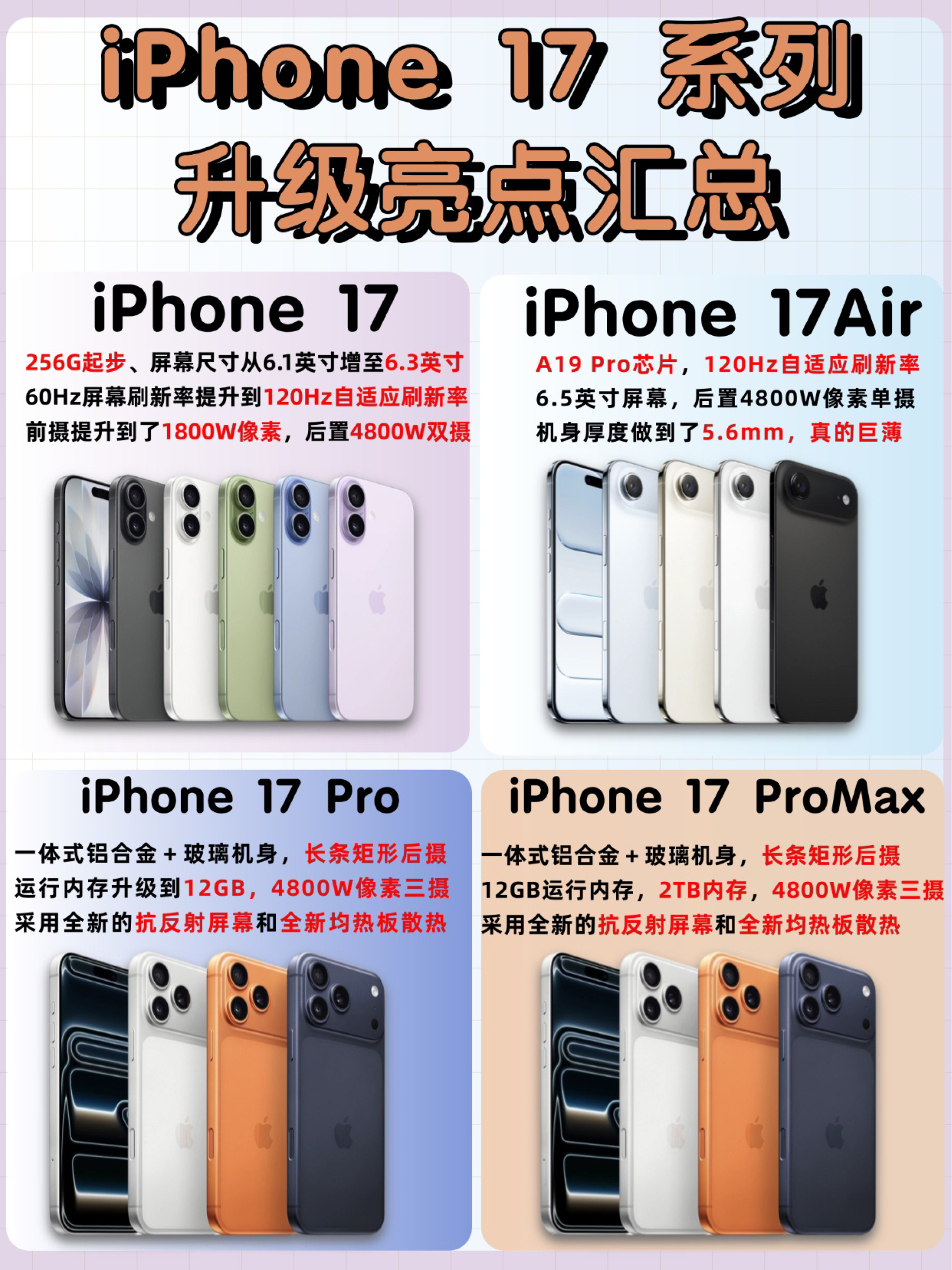 🔥 苹果这次真的卷起来了! iPhone 17系列终于发布啦!包含iPhone 17、17 Air、17 Pro、17 Pro Max四款,价格从5999元到17999元不等。 我连夜整理了这份选购攻略,帮你闭坑避雷,选对最适合自己的那一款!💖 📱 一、颜值党首选:iPhone 17 & 17 Air 1️⃣iPhone 17(5999元起) 🔥屏幕:6.3英寸超视网膜XDR屏,终于支持120Hz...