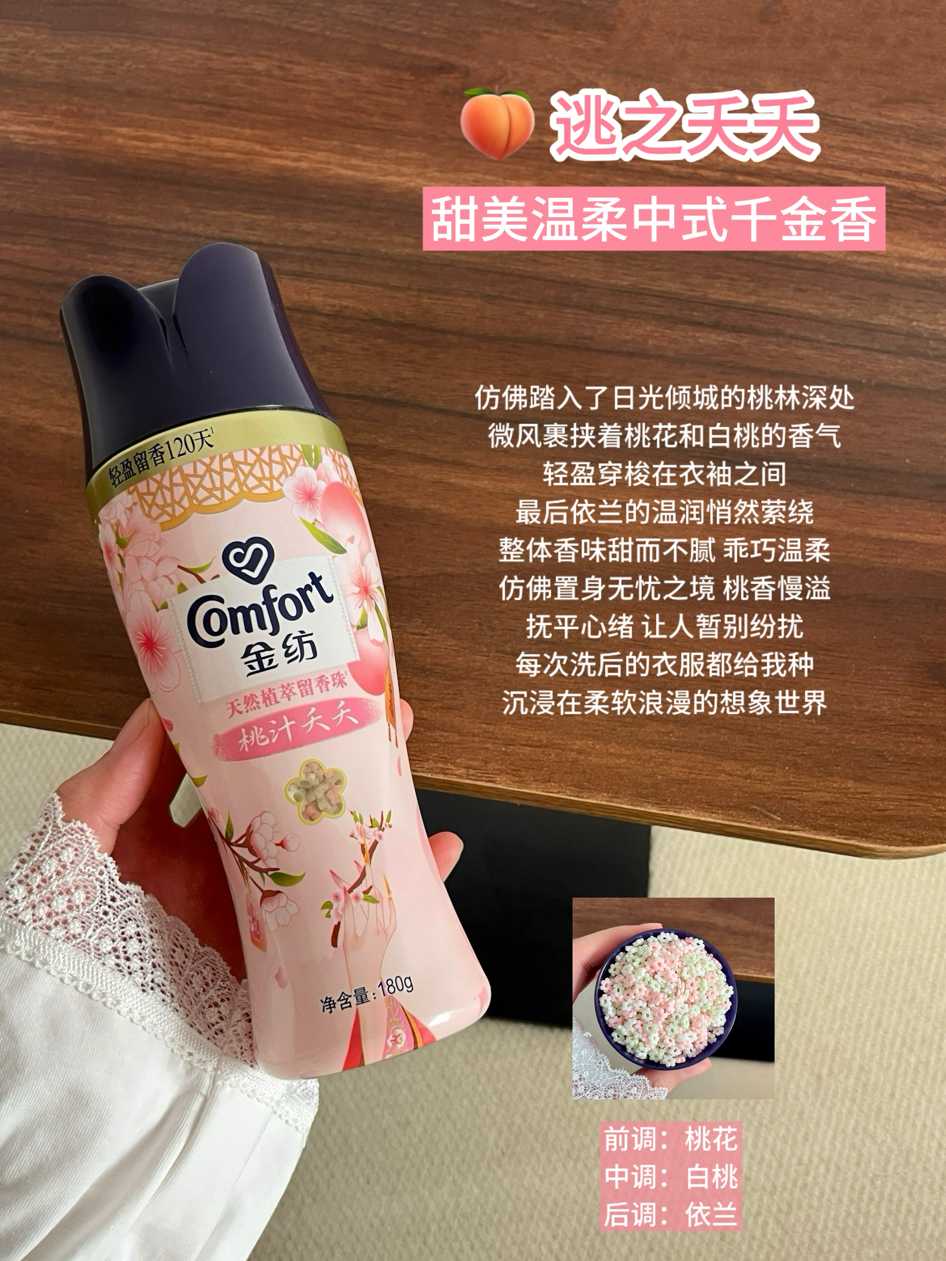 之前凑单顺手买了一瓶金纺留香珠 不仅把我家洗衣液卷失业,现在更是恨不得抛弃所以香水独宠它一人!! 只要往洗衣机里丢一瓶盖,衣服晾晒到阳台能香满一整个屋子 因为买的是逃之夭夭 整个夏天去健身房大汗淋漓流的汗都是桃花香 关键留香真的有点颠覆我的认知 洗完很久的衣服放到衣柜等再次拿出来穿 打开柜门那刻依旧是香香的 香的让人陶醉 而且我查过用的是100%可食用级糖基成分 香的自然 持香留香更久 还能去异味...