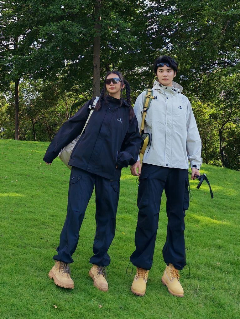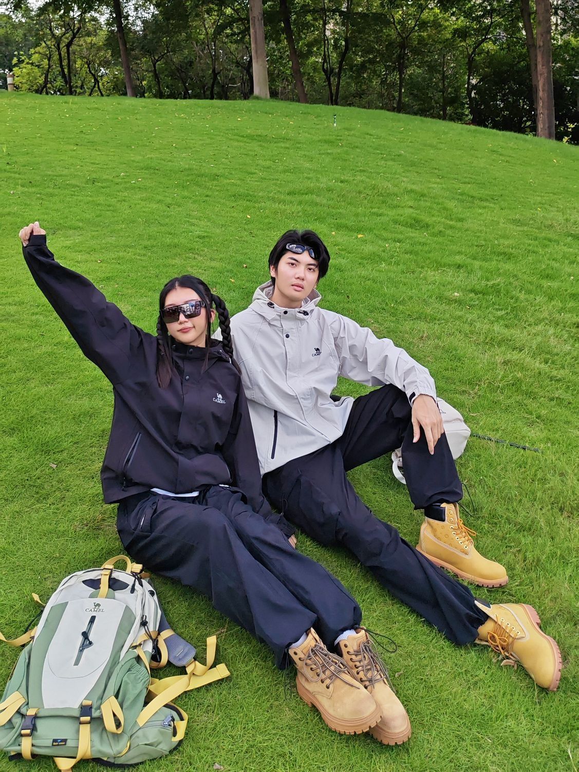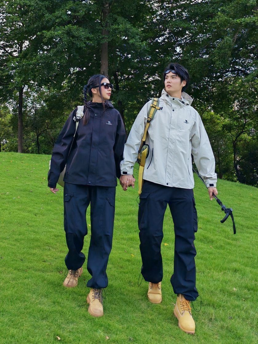 🧍♂️ 穿搭风格:户外森系穿搭 👔 上衣:骆驼冲锋衣一黑一白cp感满满 👖 下装:搭配了黑色伞兵裤,时尚又百搭 👟 鞋子:踢不烂的大黄靴 🎒配饰:户外双肩包