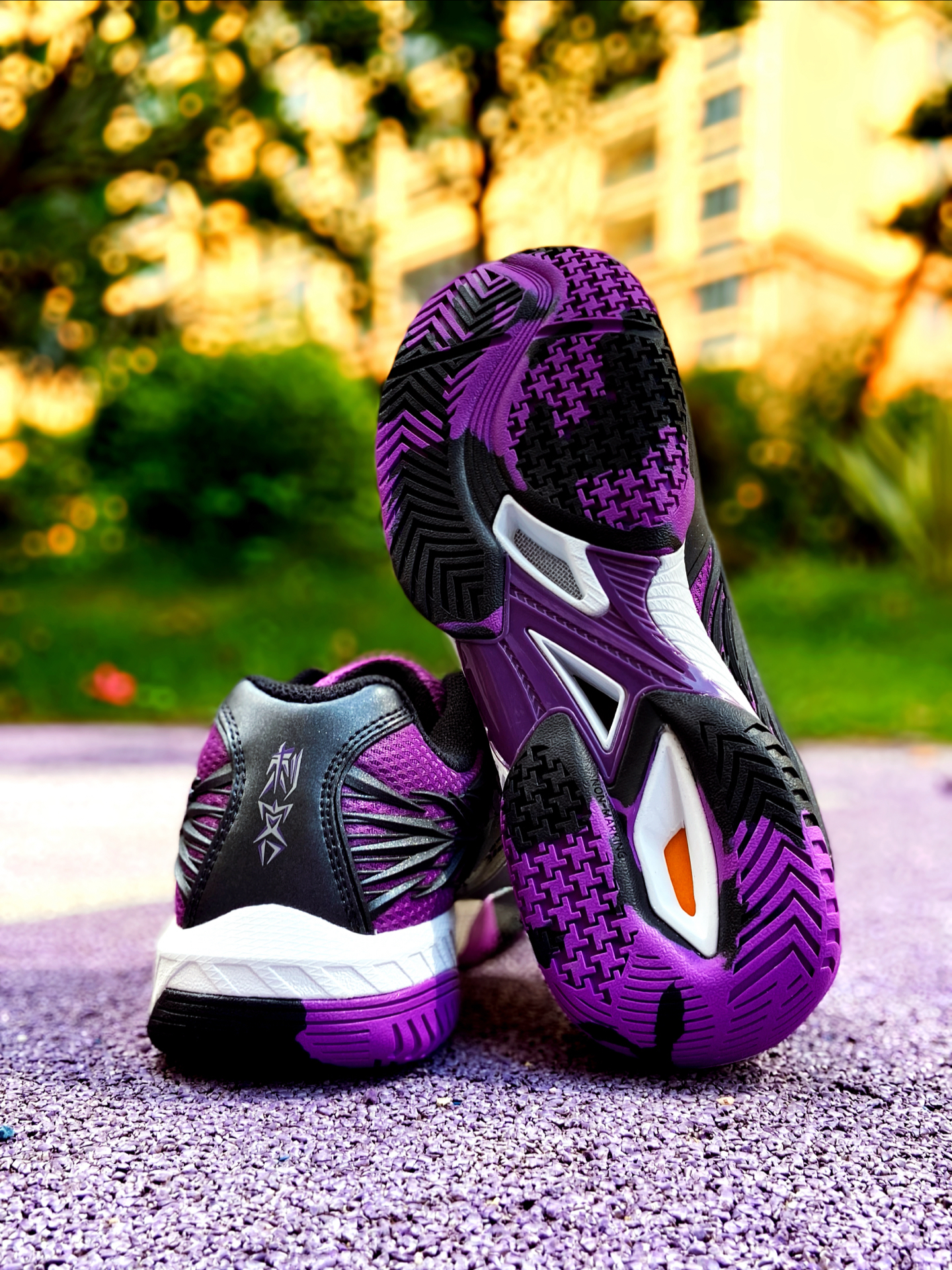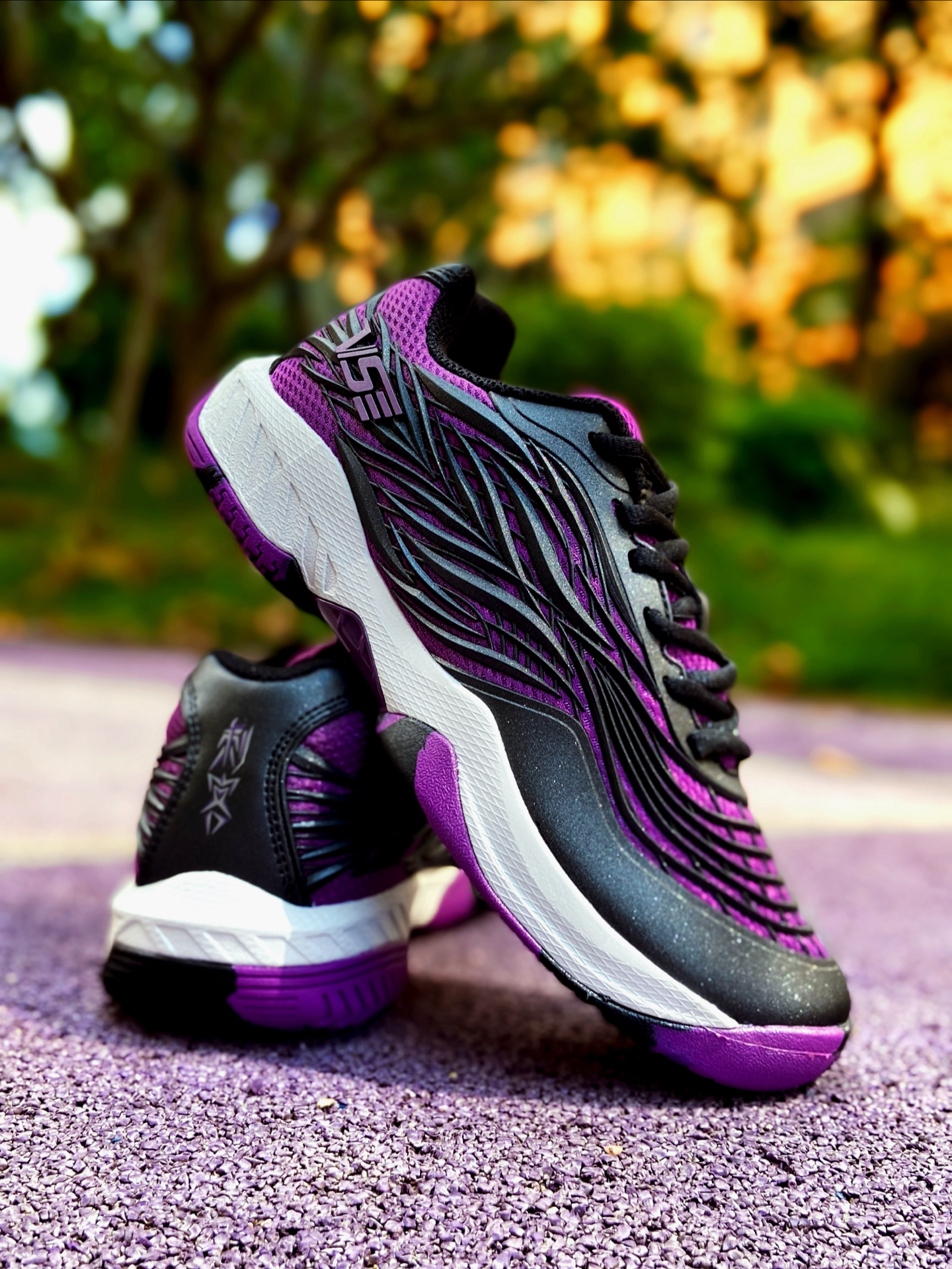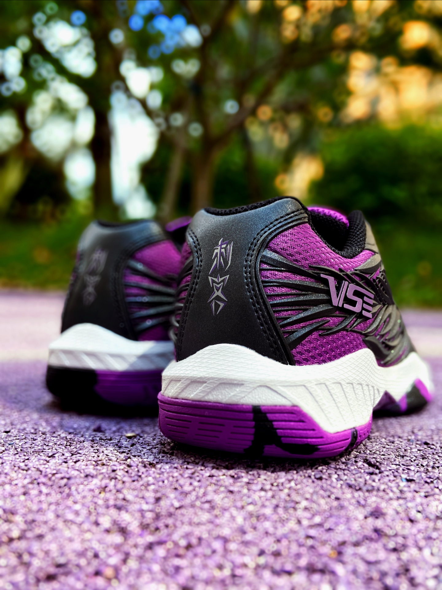 挑来挑去,终于让我找到这款 #威臣 的刺客系列羽毛球鞋。黑紫撞色设计+羽毛感线条纹理细节,这颜值完全长在我的审美点上 。 鞋面采用透气网布+KPU革拼接,包裹感十足却不紧绷,也不压脚背。鞋底纹路很深,抓地力和防滑绝了,打球时启动超快,急停也是稳稳的,中底缓震蛮到位,跳杀落地膝盖都没咋震。 颜值和功能双双在线!我觉得日常打球、出街都没问题,而且无论你是小白还是老手都能轻松驾驭,码数方面正常选就...