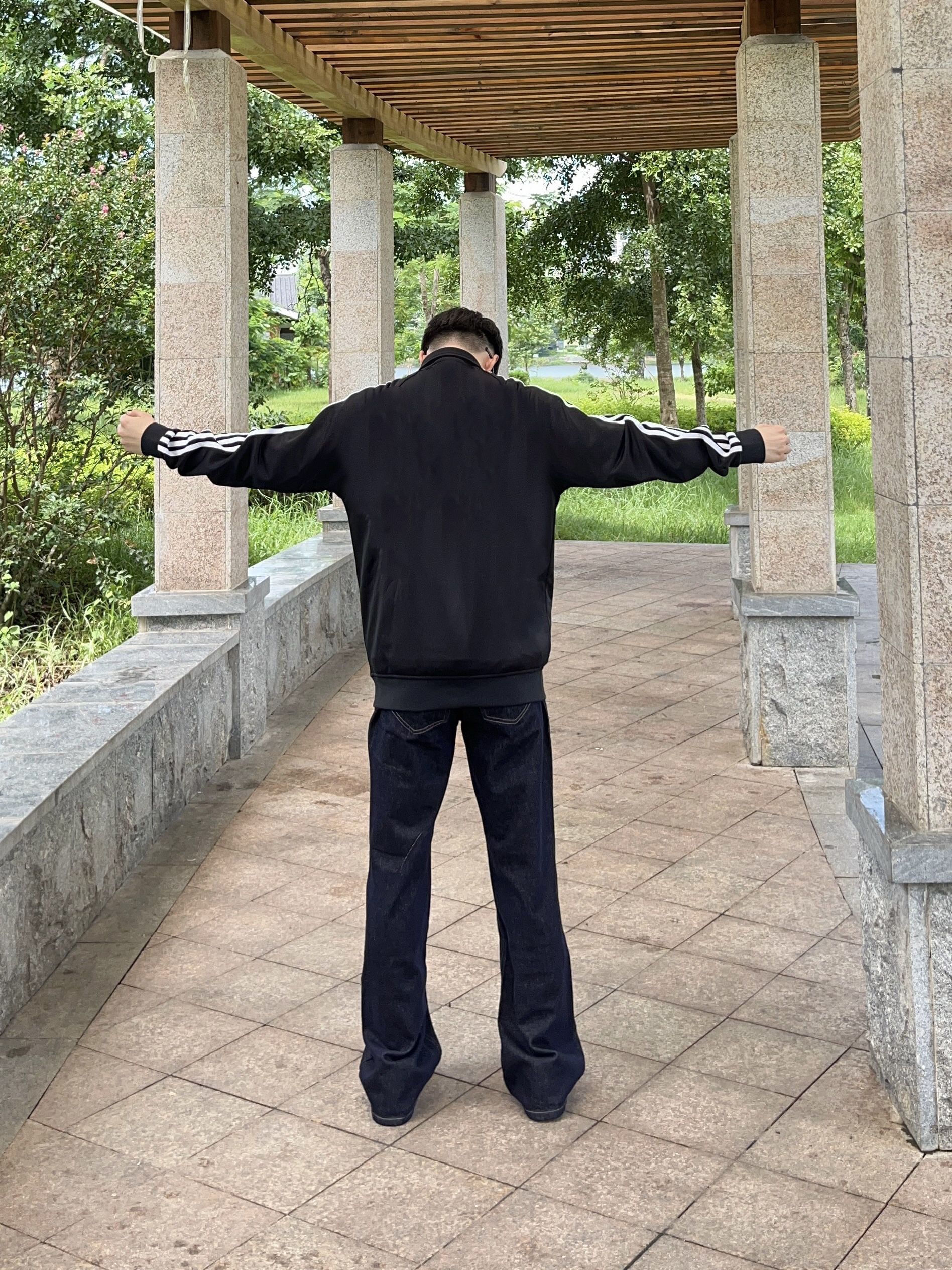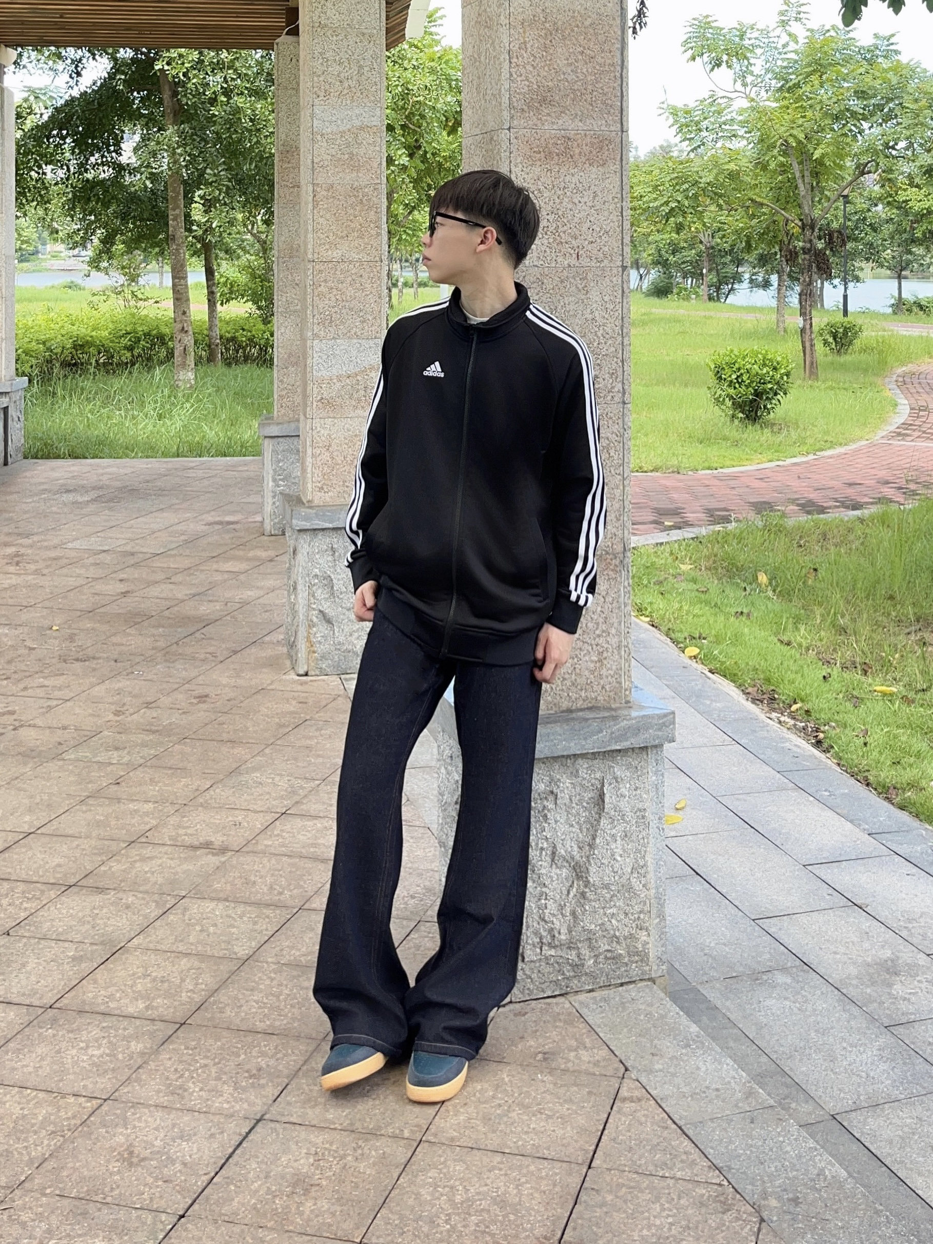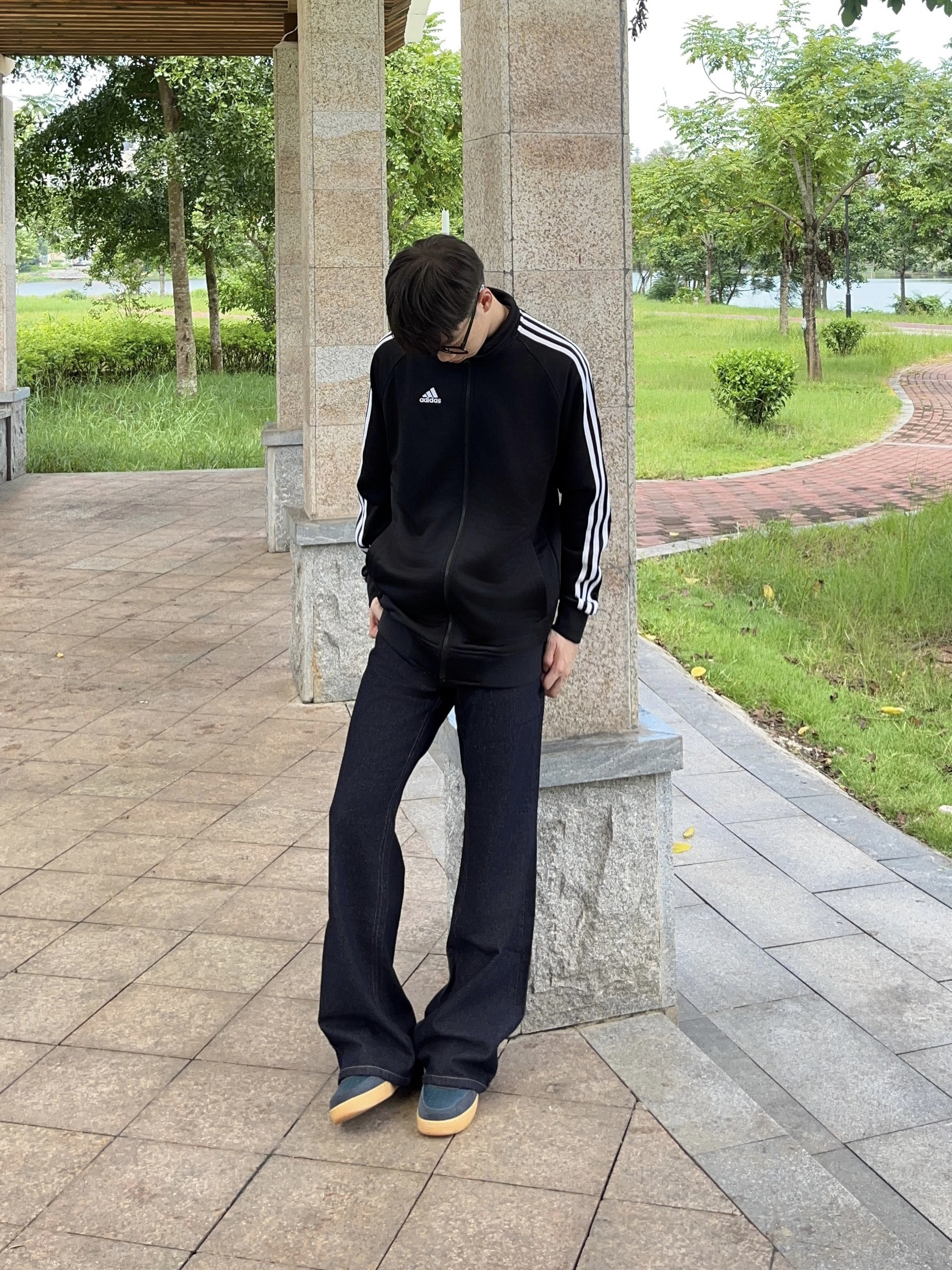 今日份穿搭分享look👀 黑色经典阿迪外套卫衣👔搭配 gangurru 的 深蓝色原牛直筒牛仔裤👖 颜值复古时尚 水洗面料舒适透气 微喇版型宽松显腿型🔥 一套搭配下来 早秋街头vibe风帅气值拉满