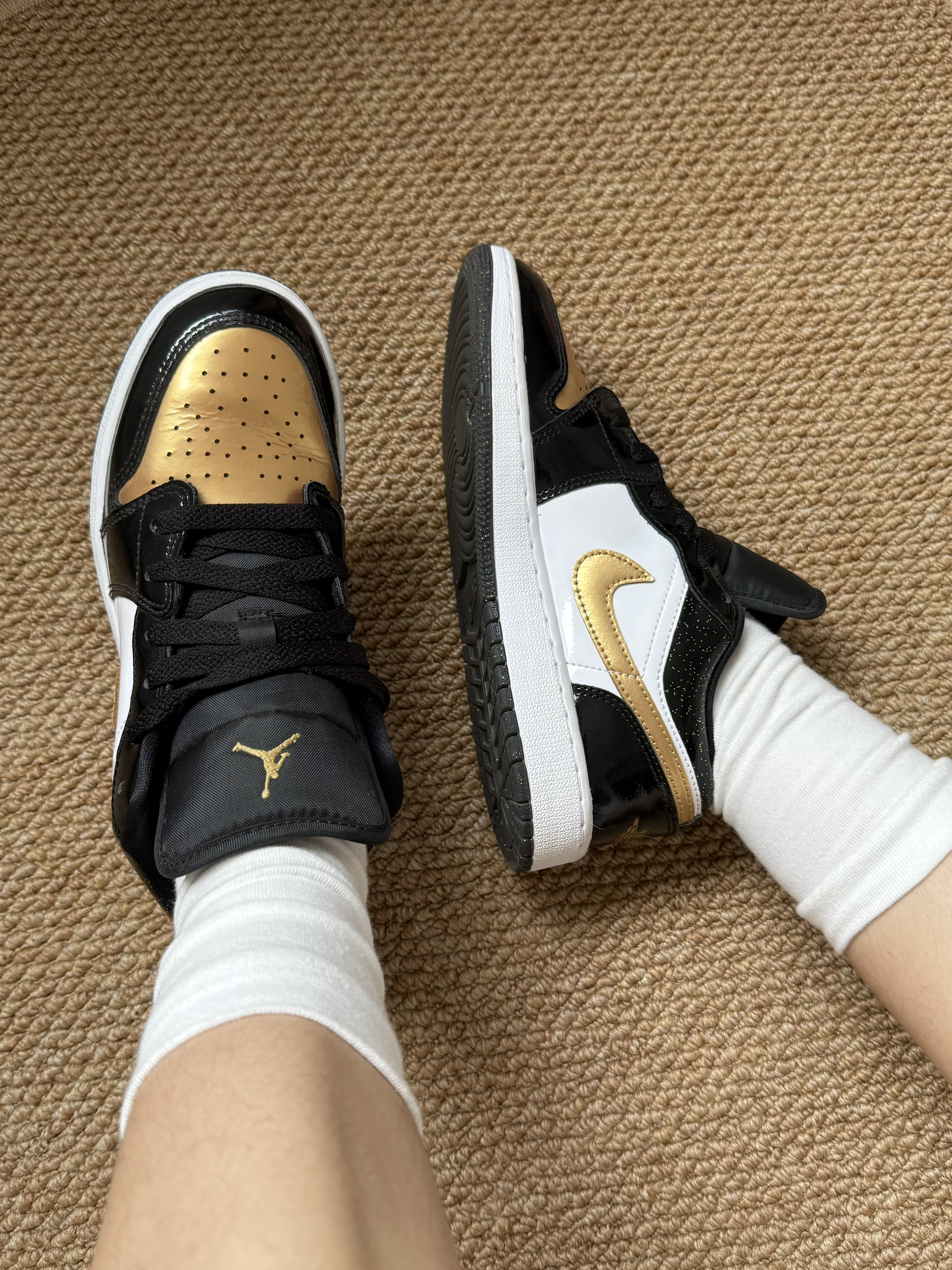 上脚一整个“贵气感” 低调奢华大气又时髦! 漆皮质感超赞哦!舒适又百搭! 黑白金配色简直高级感满满! 这个黑金配色适合所有搭配!!!