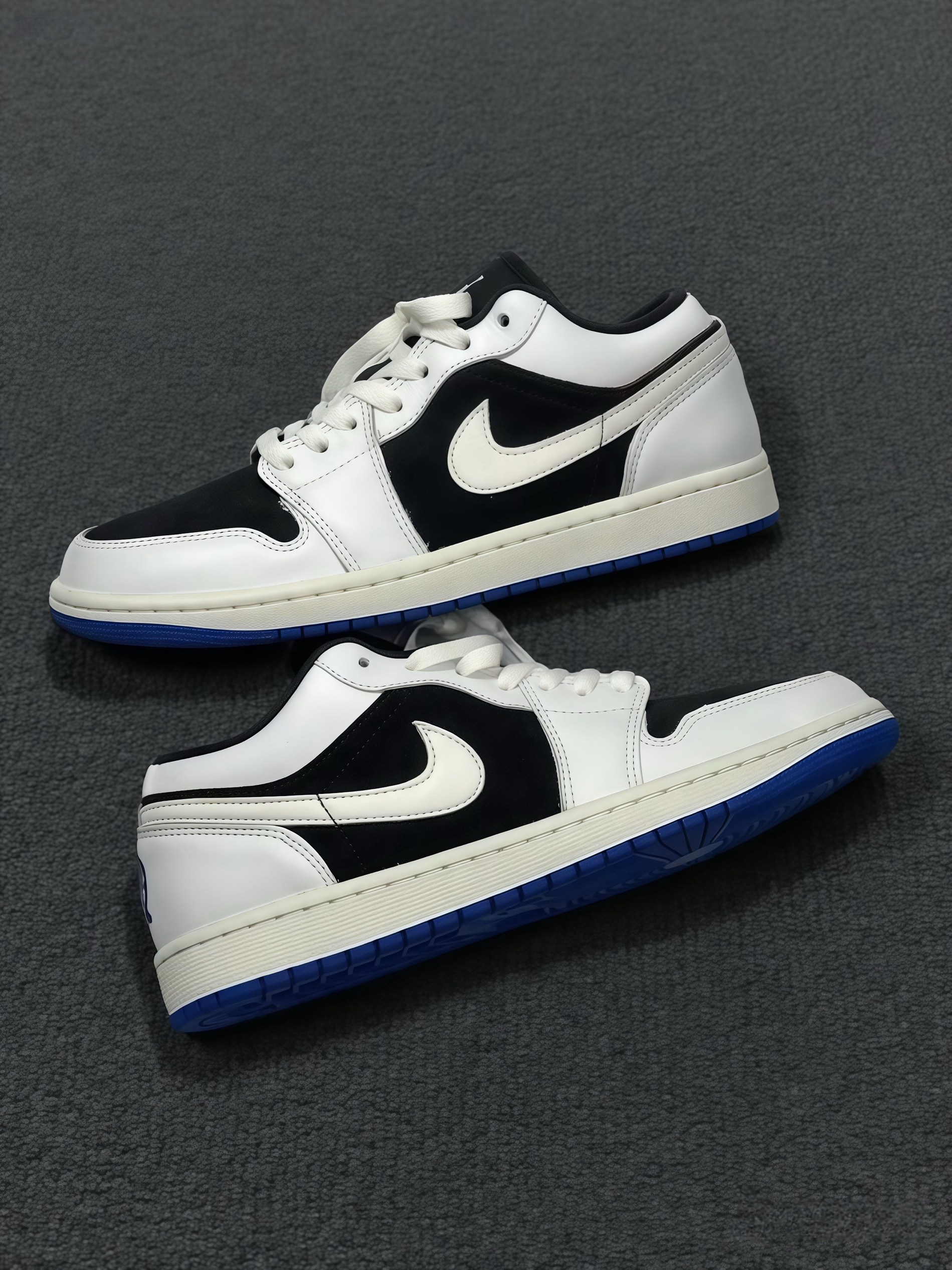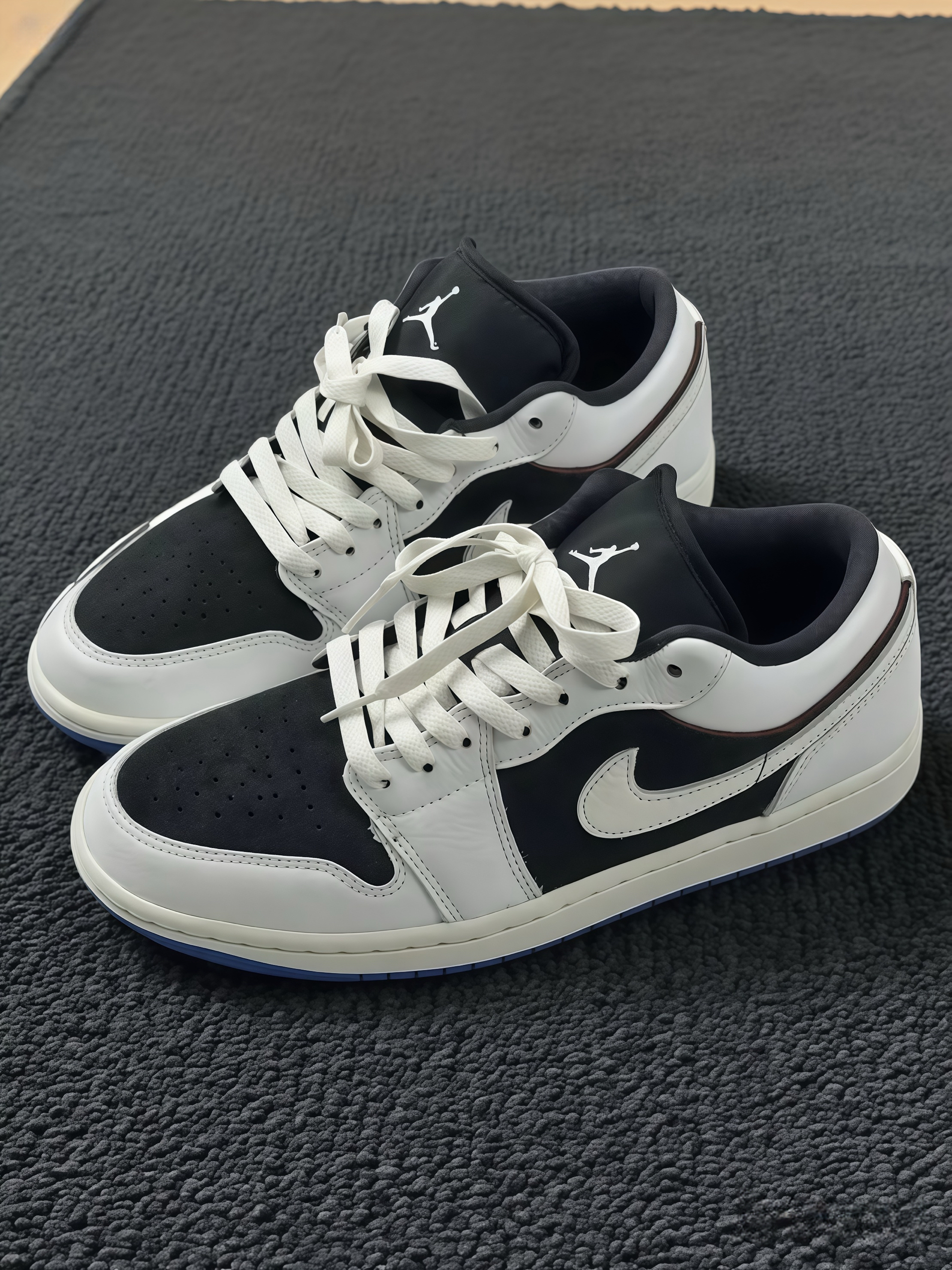 这双鞋,拆开快递那刻就被惊艳到了!经典的黑白配色,简约又高级,鞋侧的钩子和鞋舌的飞人标志,细节很到位。拿到手里质感满满,皮质摸着很舒服。上脚试了下,脚感超棒,包裹性很好,走路也很轻快。搭配牛仔裤或者运动裤都很合适,瞬间让穿搭变得有格调。