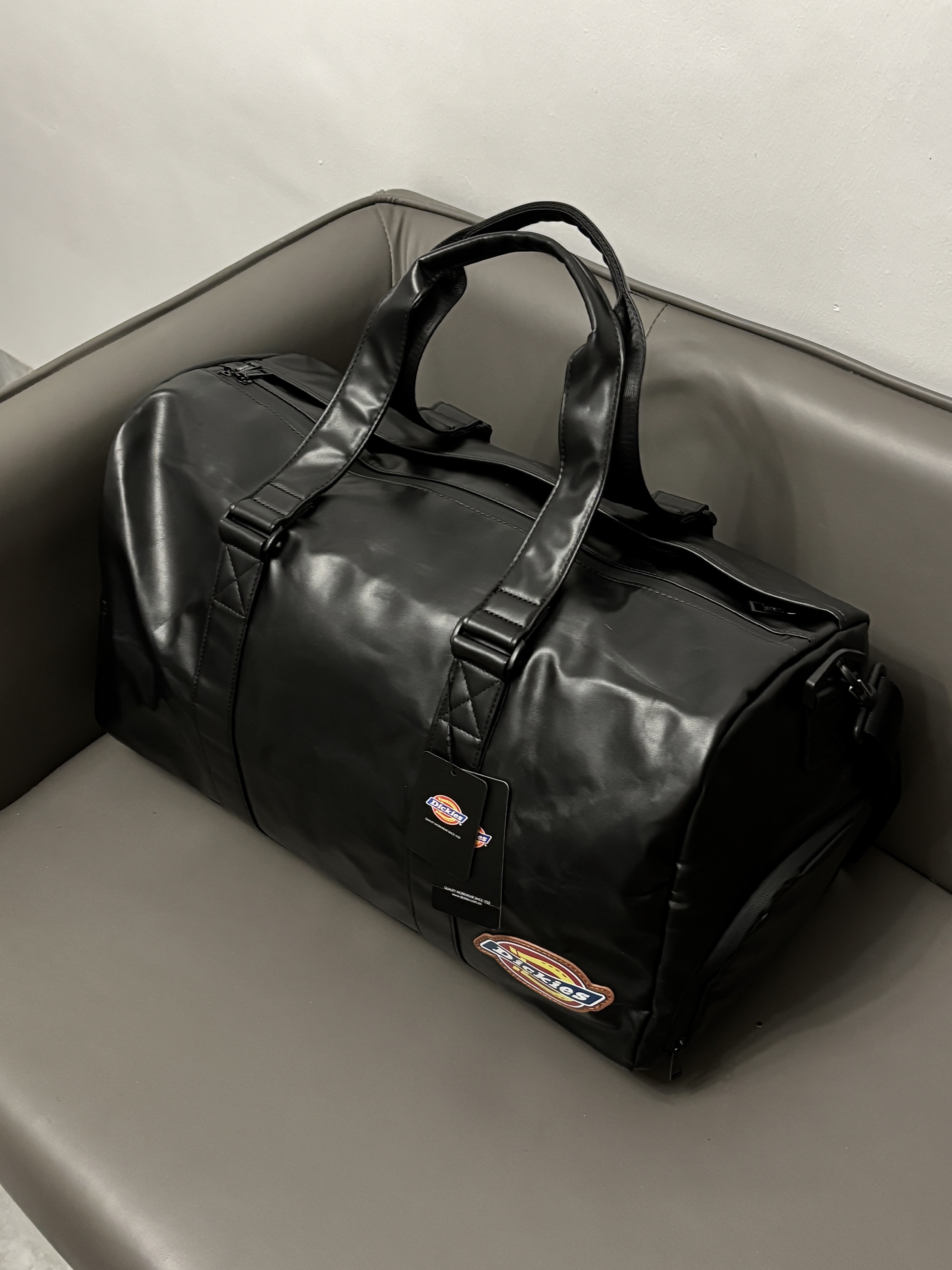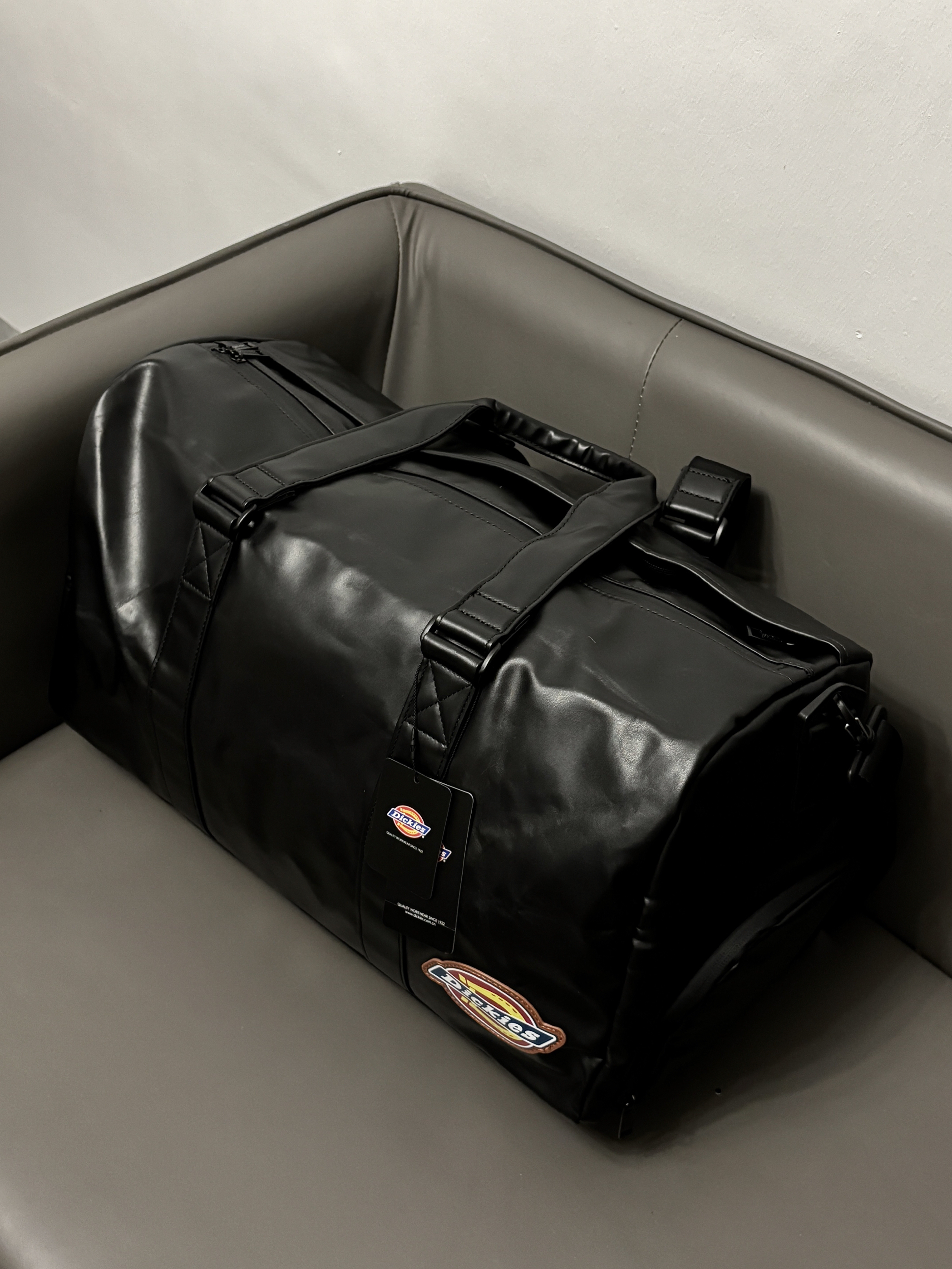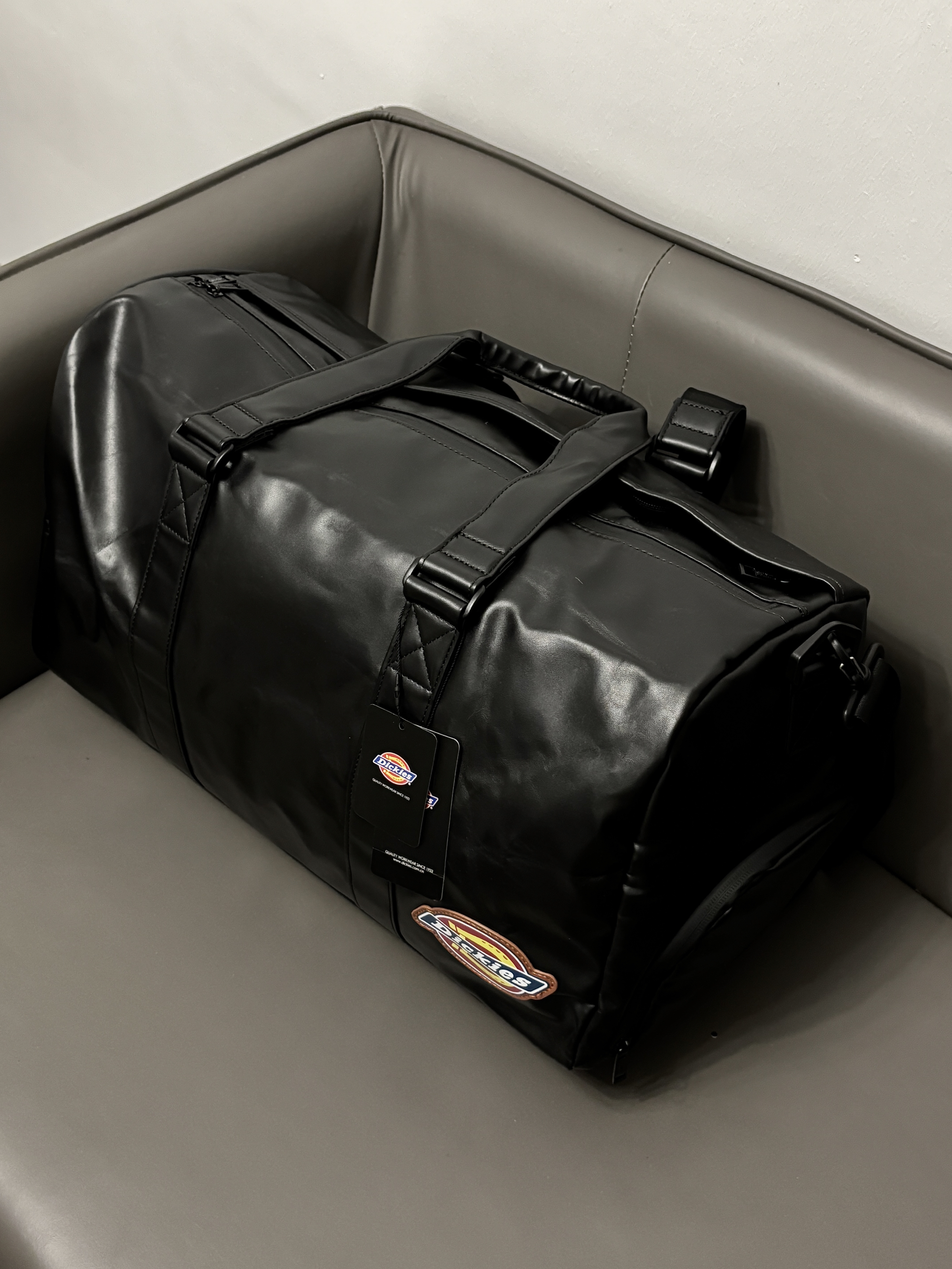 最近刚好在给男朋友看健身包 dickies旅行包包还挺在线哒 Pu防水材质质感尊嘟hin高级 款式也是时尚不沉闷的 还挺百搭嘟😎 多隔层设计我蛮喜欢的 干湿分离 独立鞋仓一包搞定 出门旅行或者健身带这一个就嘎嘎顶用了 男朋友尊嘟很喜欢🥰
