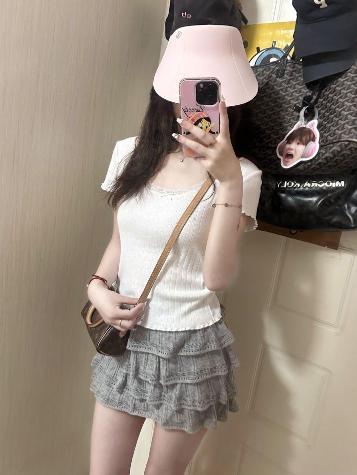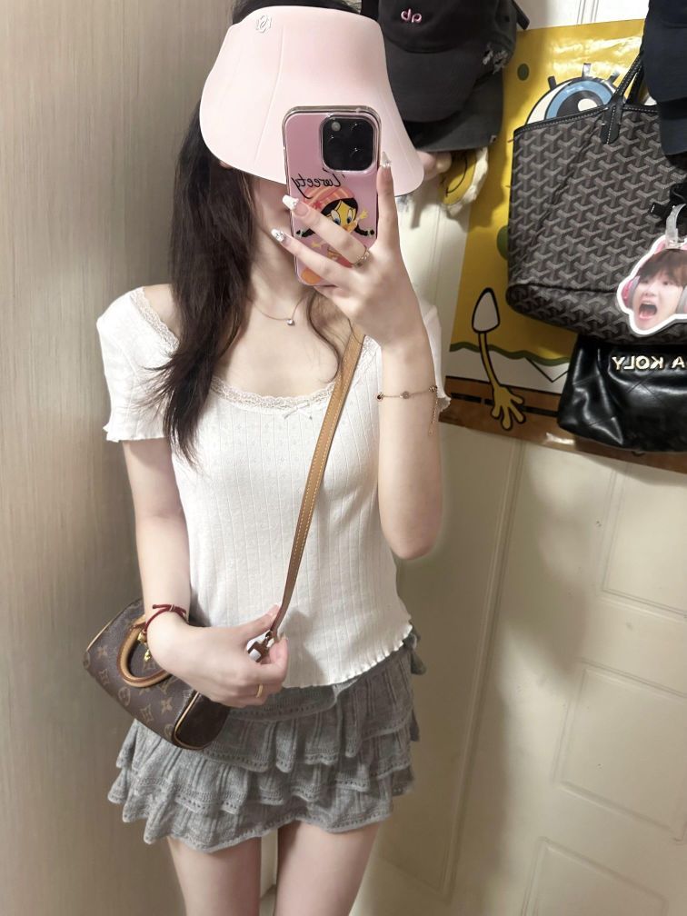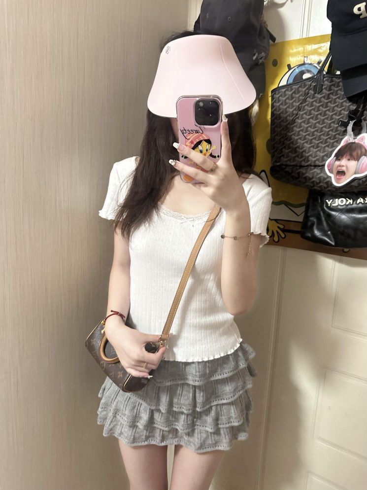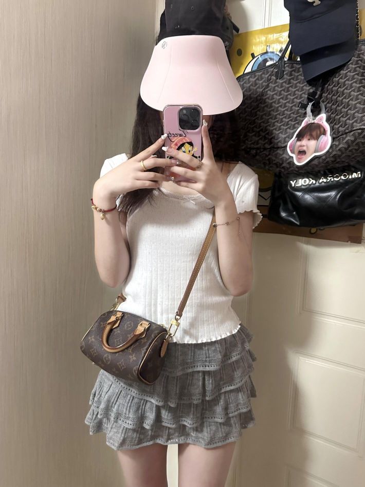 戴久了棒球帽 换换风格也很好看耶 搭配白色花边短袖+灰色蛋糕裙 清新又甜妹~