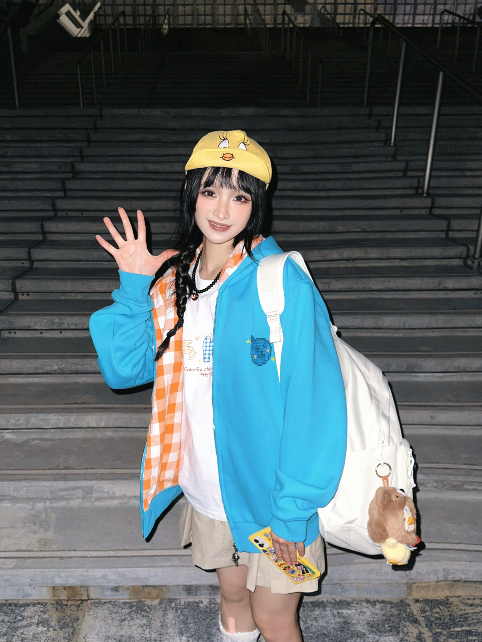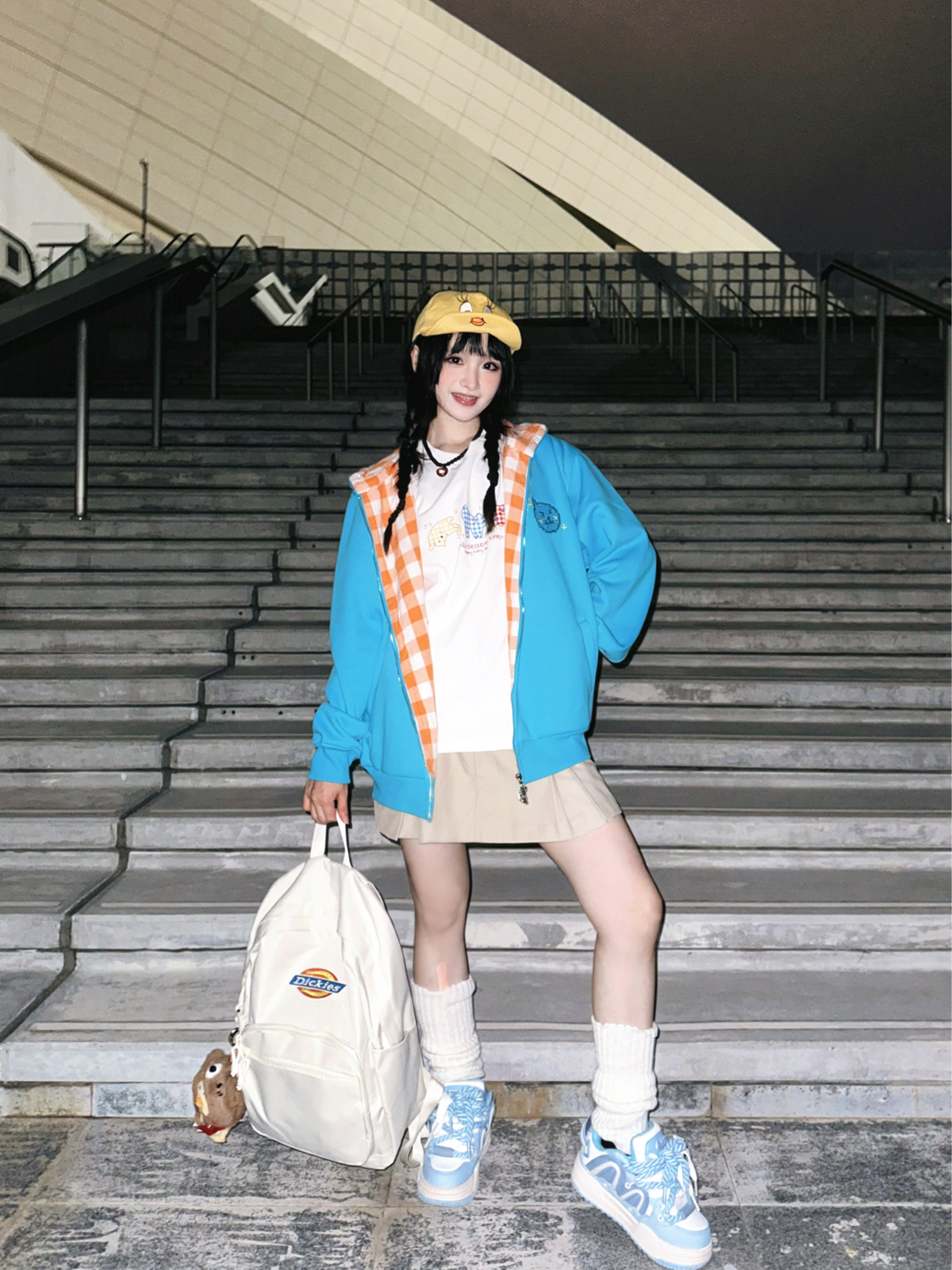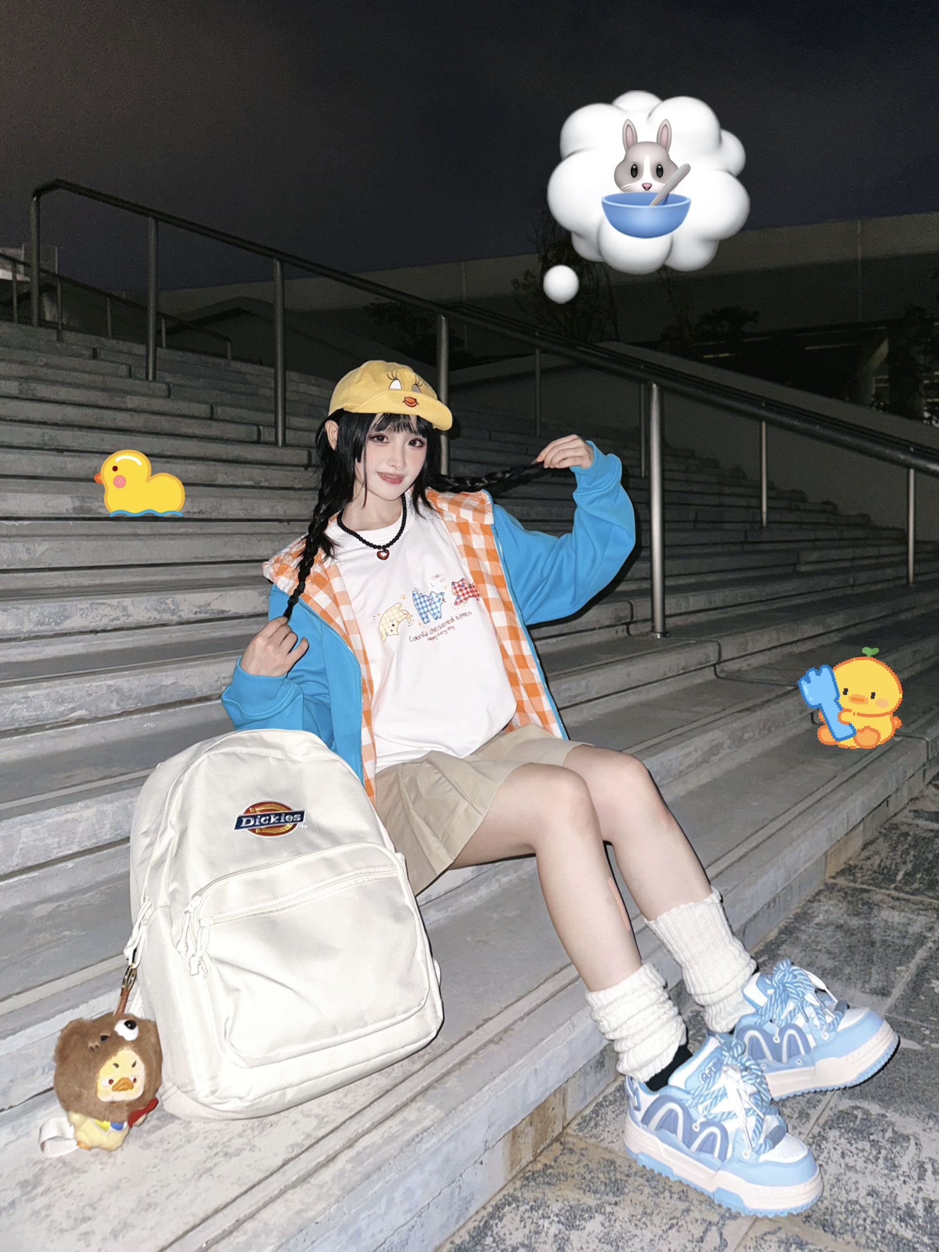 返校日穿点高能彩色呀🐣 尊嘟很有活力可可爱爱的一套 亮蓝色外套➕百褶裙校园感十足 翻领的橙色撞色蛮吸睛呢 身上彩色比较多就用个低饱和双肩包搭配 不会出错哟👀还能增加整套Look的氛围感~ 双肩包🎒很百搭的颜色啦 前面有个彩色的logo 刚好呼应了我这套的配色啦~ 很硬挺的帆布材质背上一整个小方块儿 挂上可爱滴鸭鸭挂件包好看滴🤩 这套真出门看着像晚自习下课的大学生👩🎓