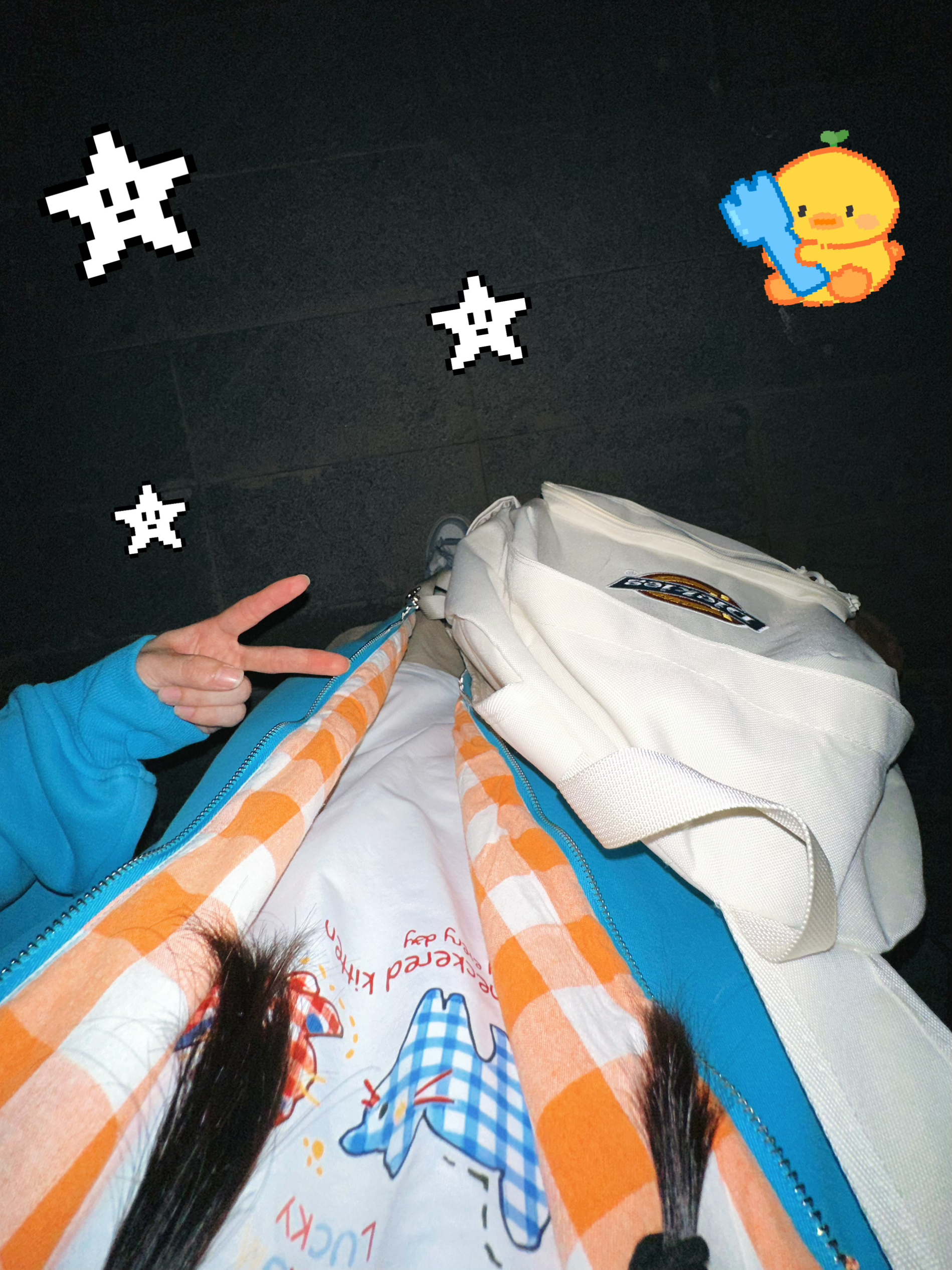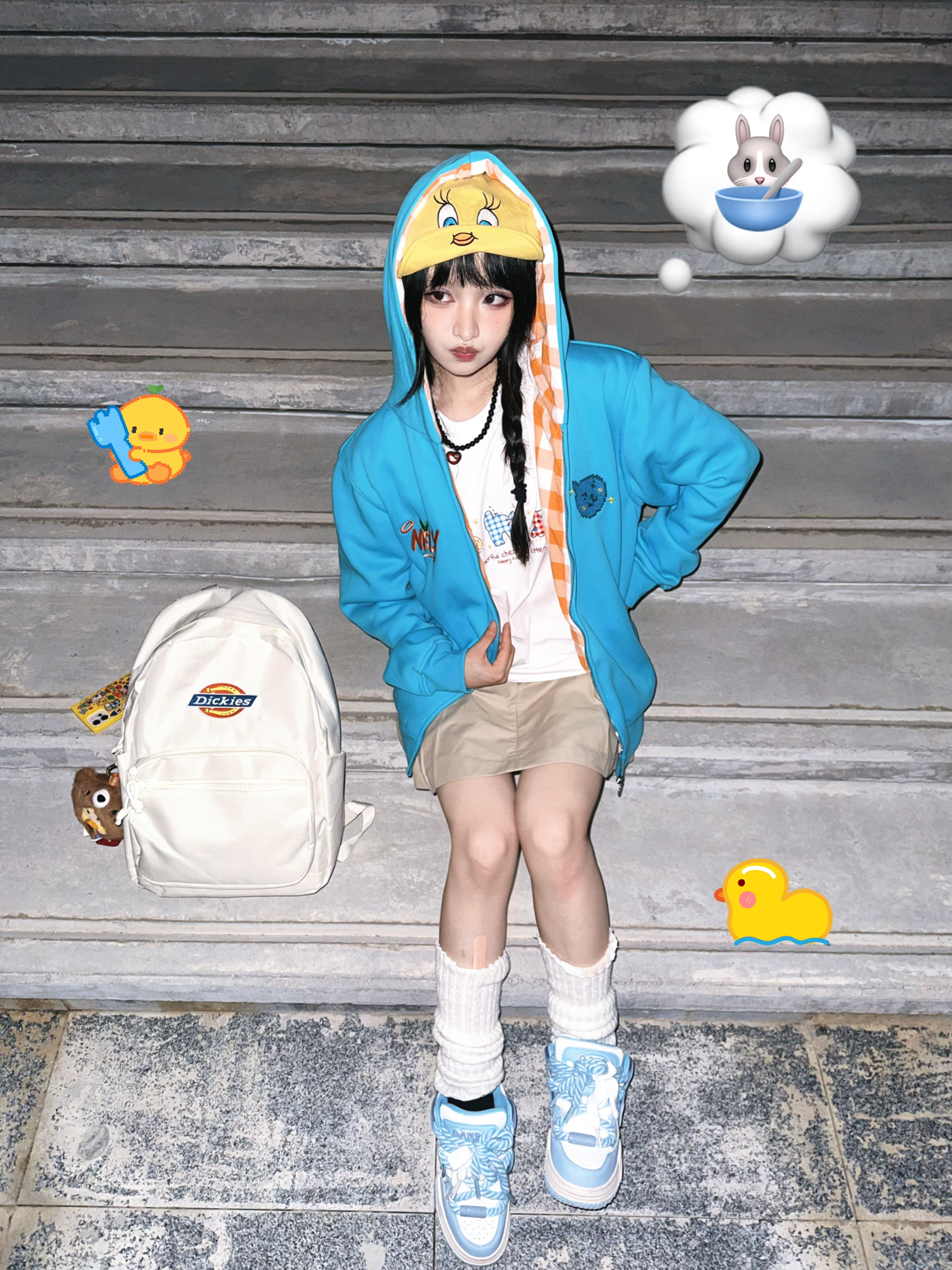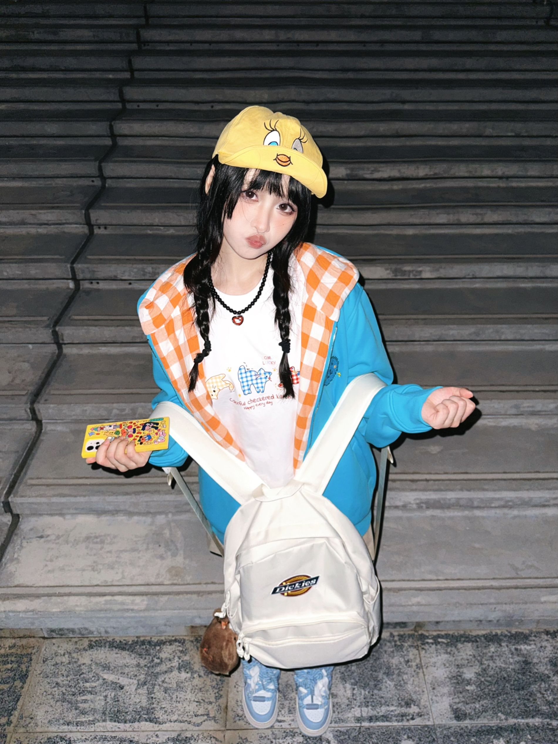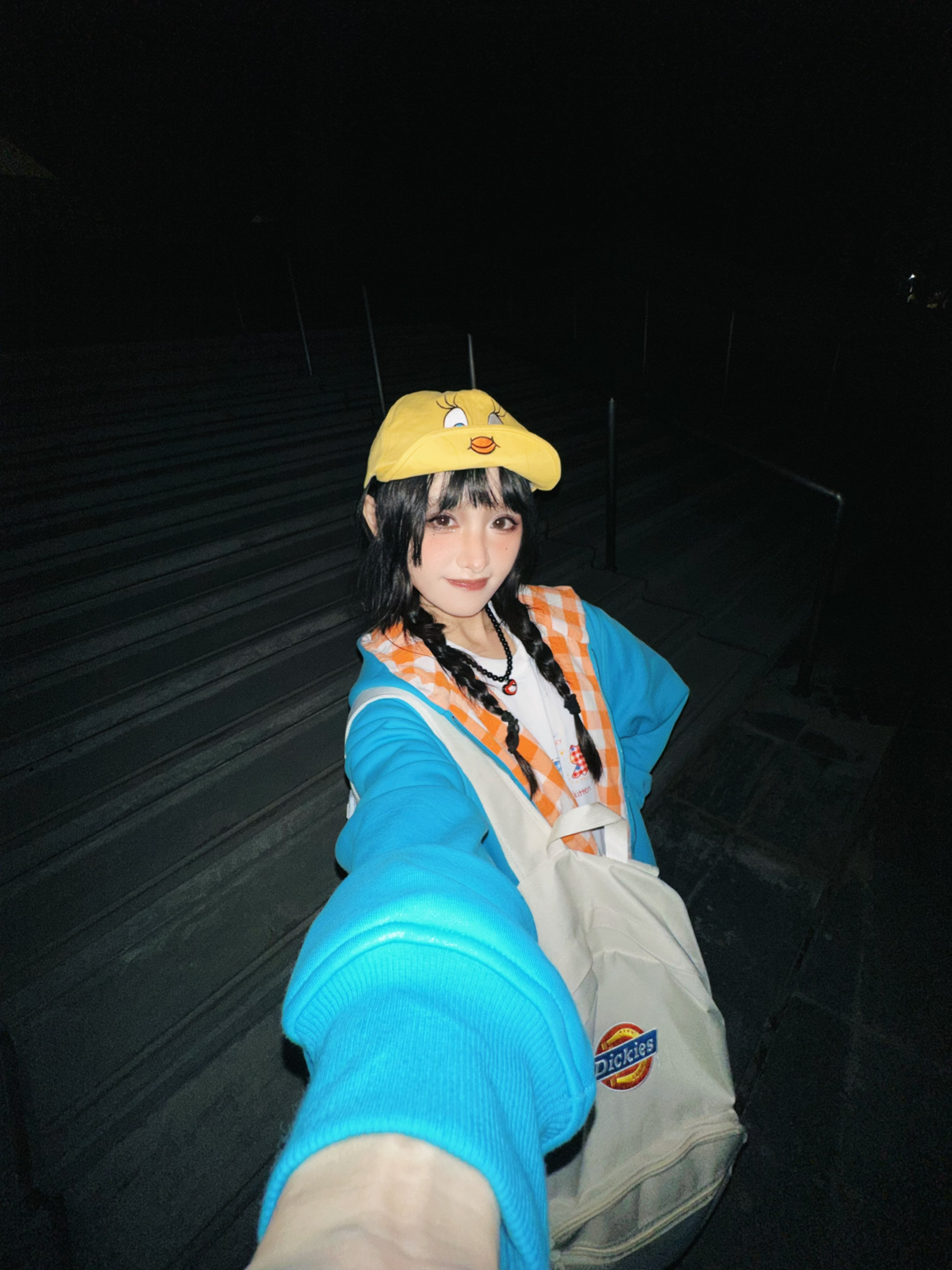 返校日穿点高能彩色呀🐣 尊嘟很有活力可可爱爱的一套 亮蓝色外套➕百褶裙校园感十足 翻领的橙色撞色蛮吸睛呢 身上彩色比较多就用个低饱和双肩包搭配 不会出错哟👀还能增加整套Look的氛围感~ 双肩包🎒很百搭的颜色啦 前面有个彩色的logo 刚好呼应了我这套的配色啦~ 很硬挺的帆布材质背上一整个小方块儿 挂上可爱滴鸭鸭挂件包好看滴🤩 这套真出门看着像晚自习下课的大学生👩🎓