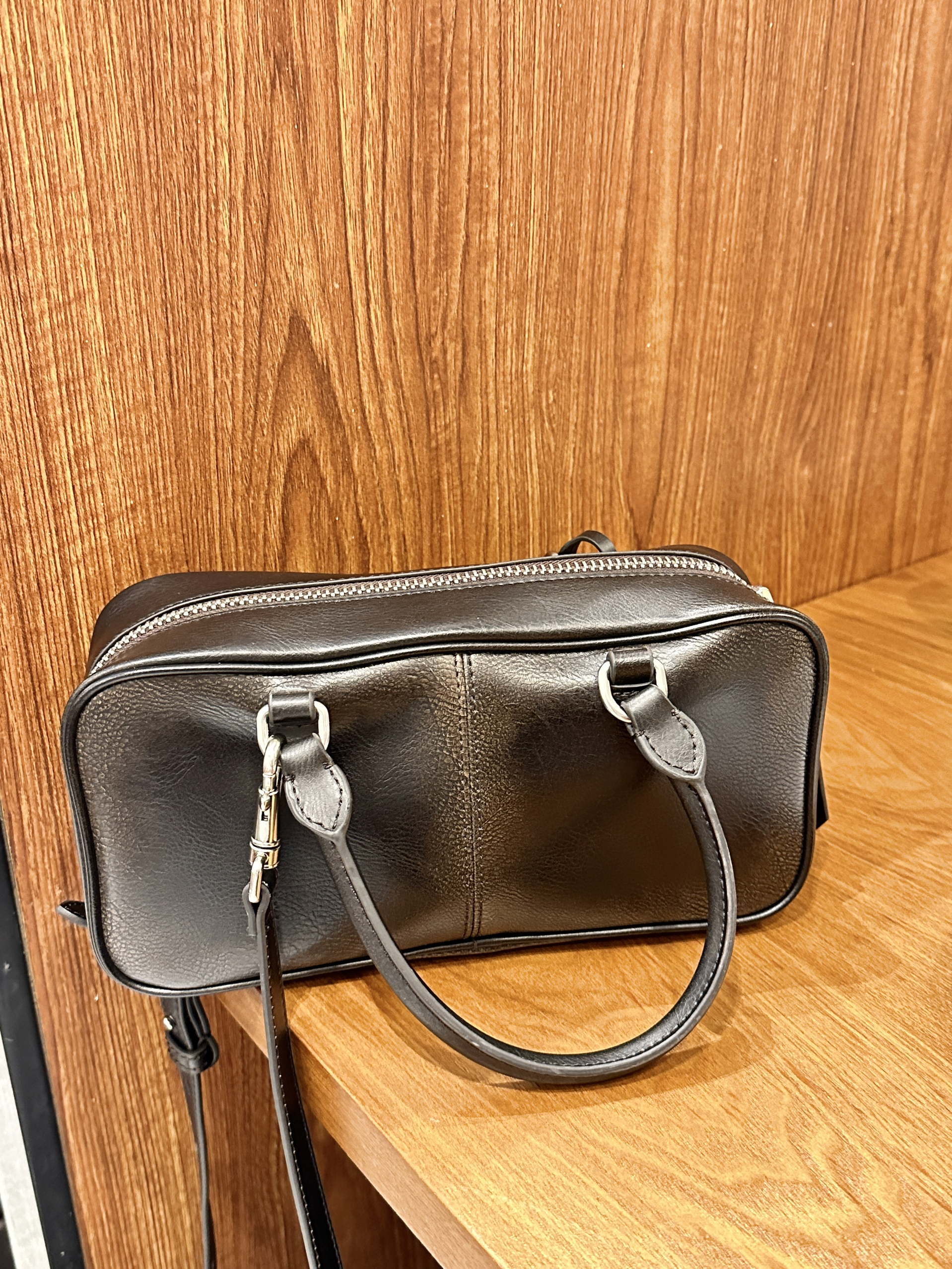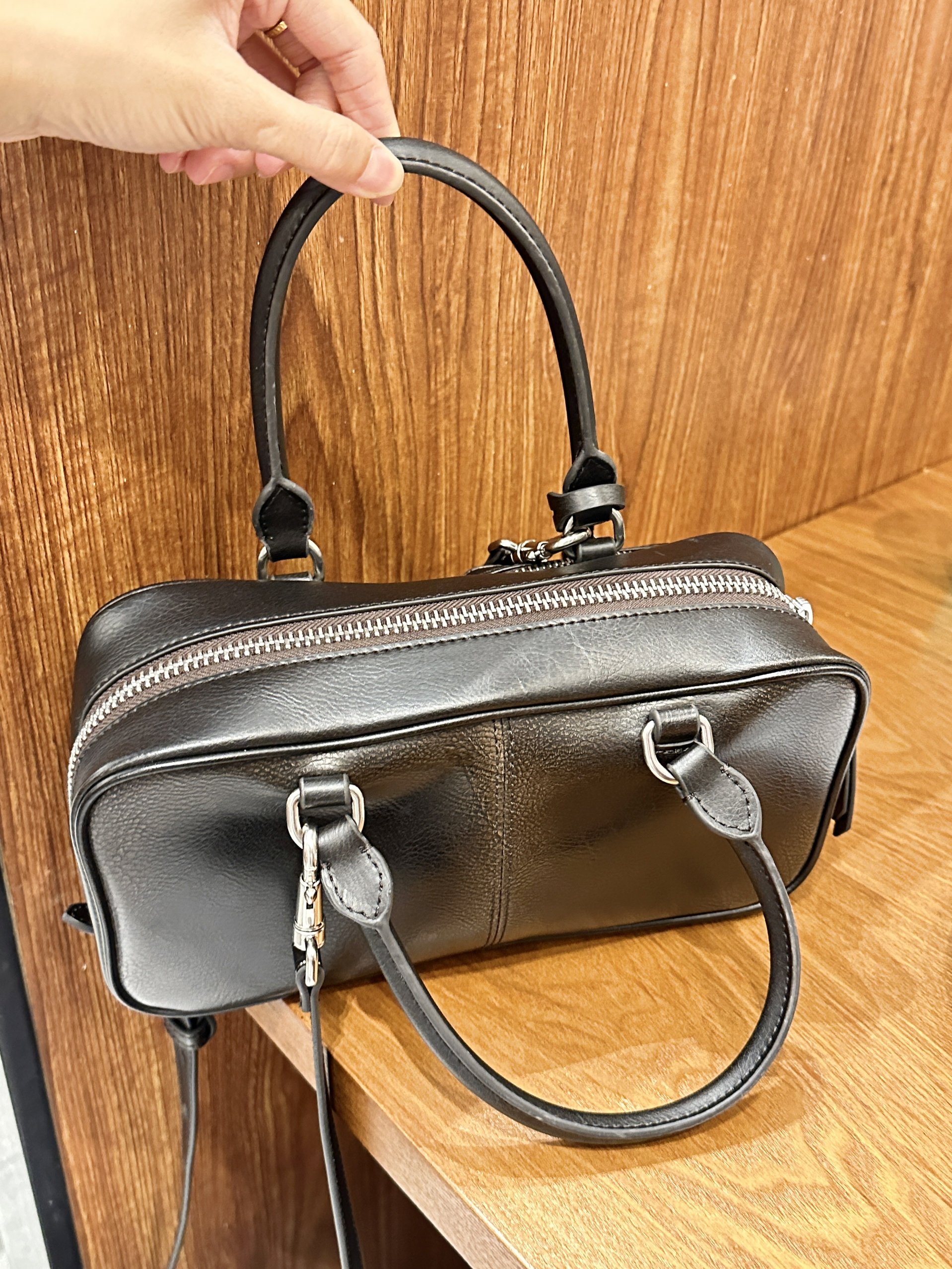 就是这个波士顿包包 第一眼见到的时候我就心动了 上身出奇的好看诶 容量我觉得挺大的 前面两个口袋可以放点小东西 这个还有斜挎的肩带 平时我用的比较多的是手提 这种颜色的包包 搭配起来比较有亮点 整体用下来感觉hin喜欢的一款~