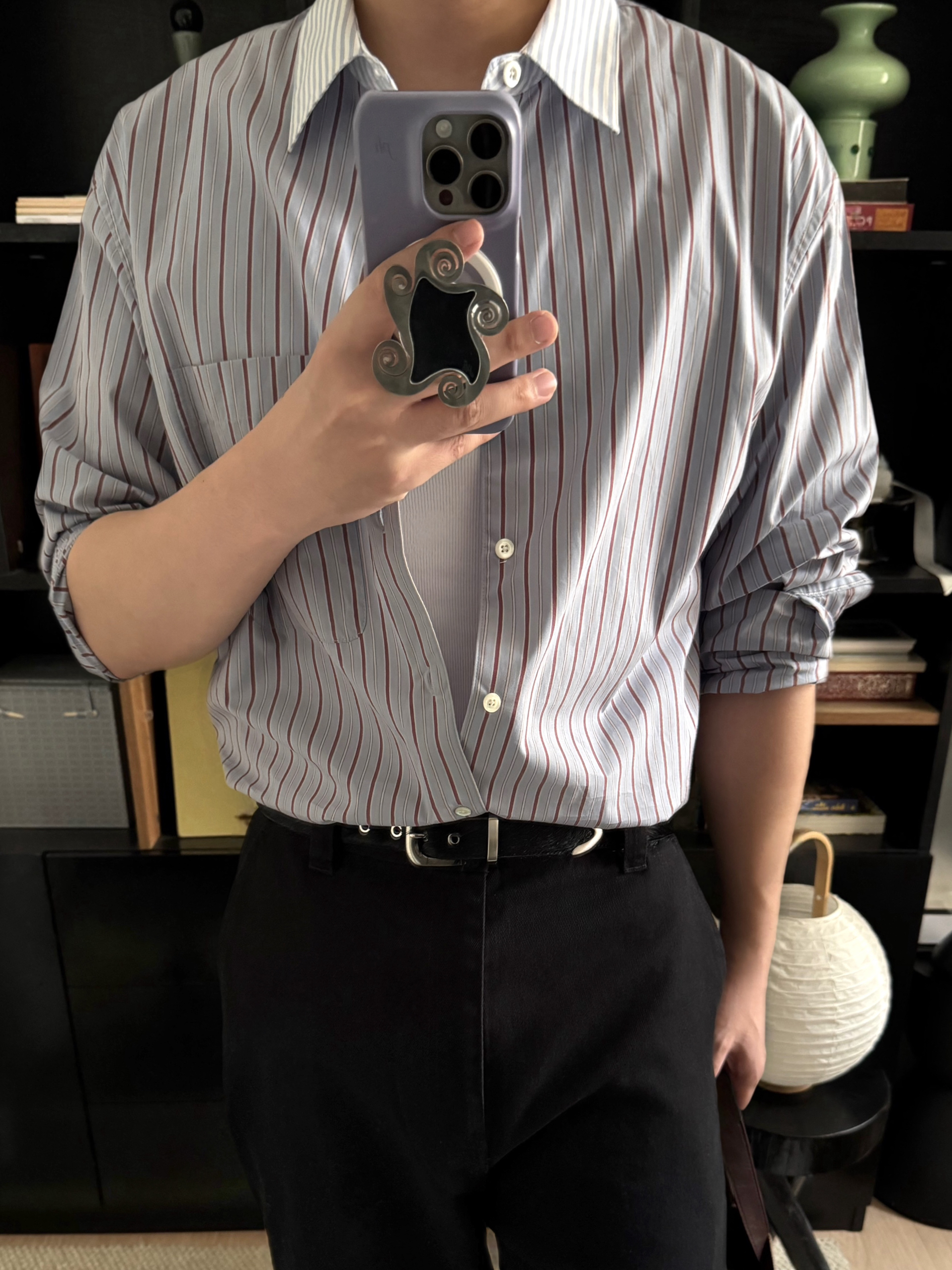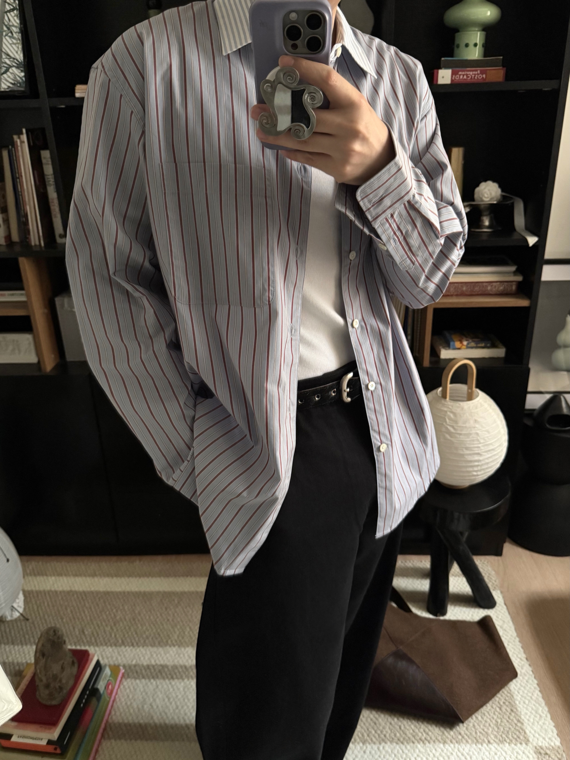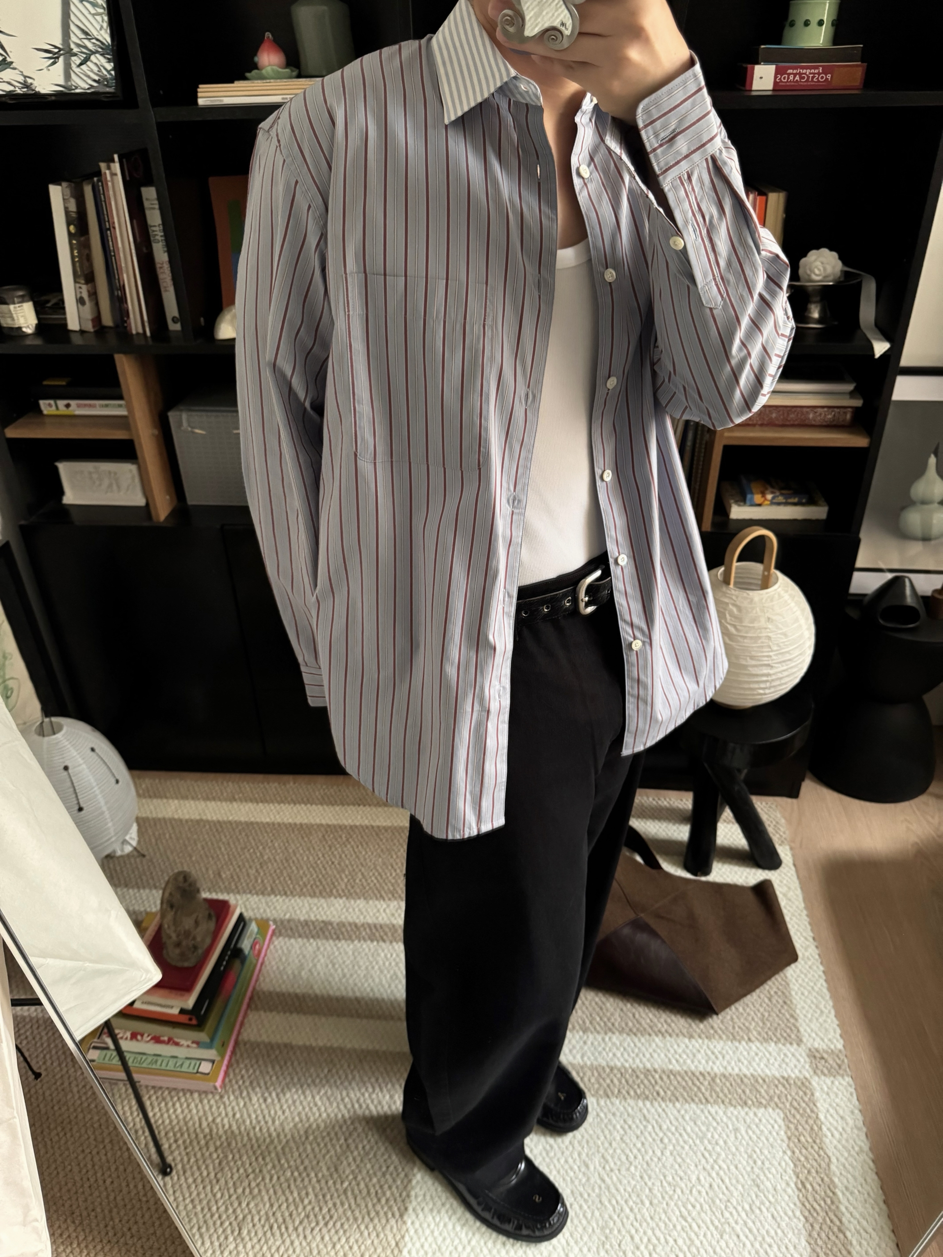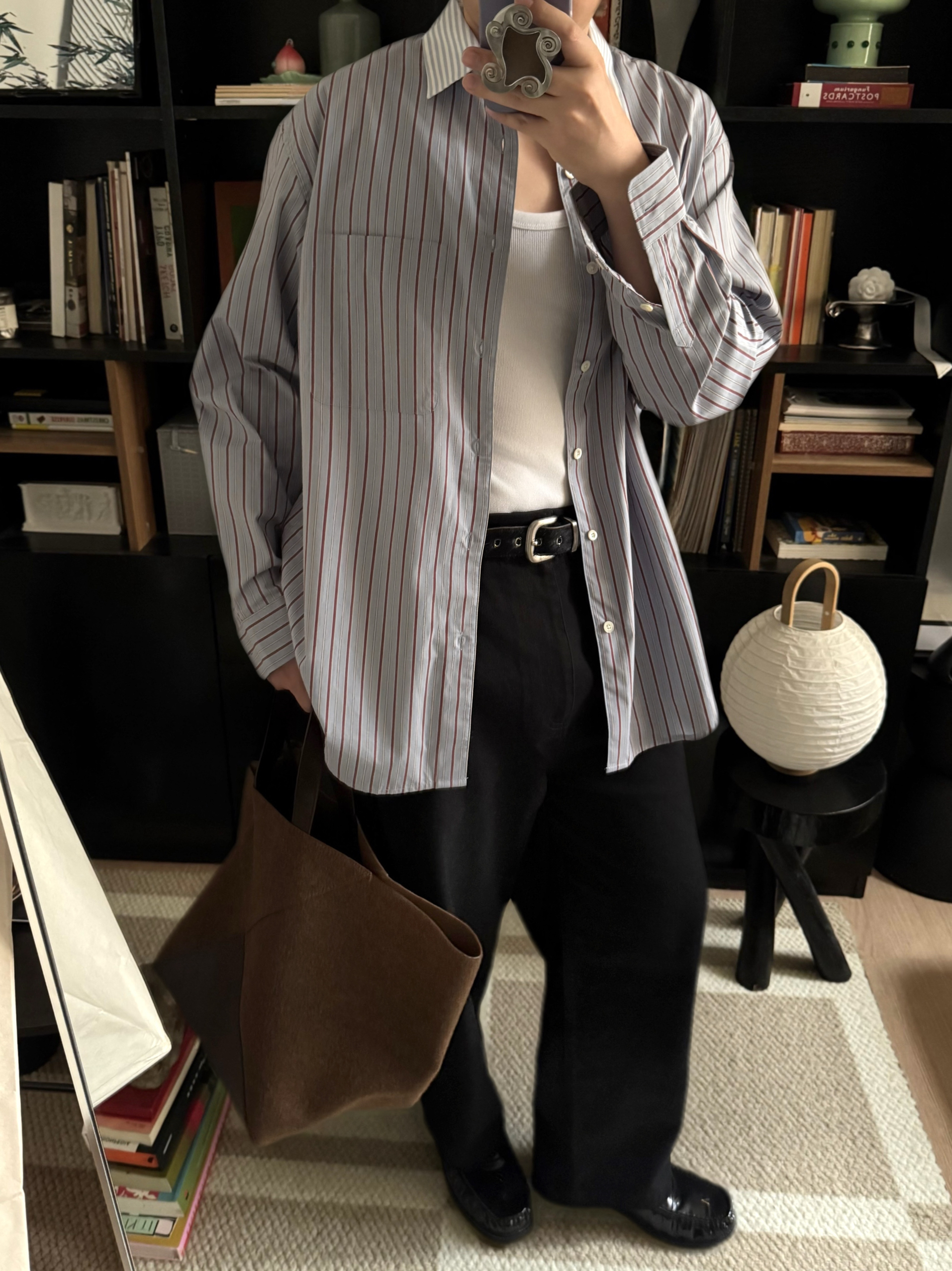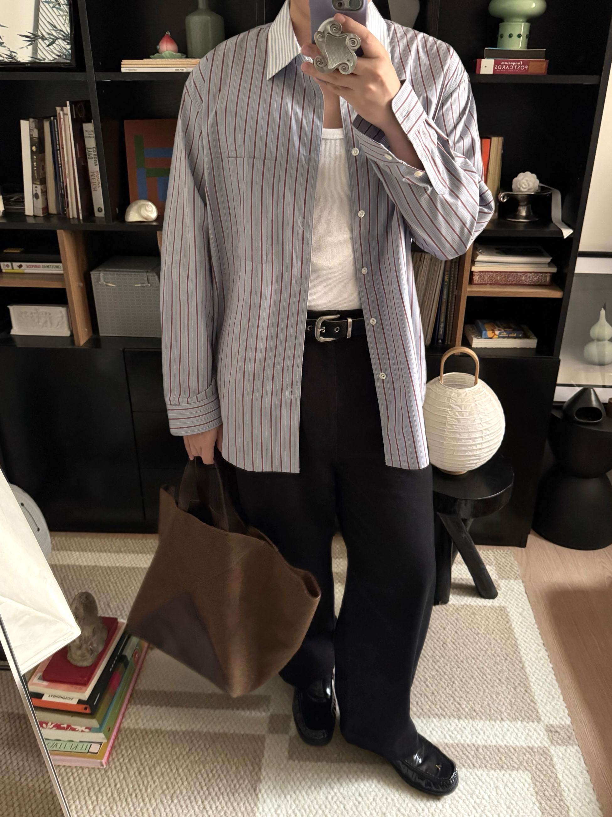 灰调的拼色条纹衬衫与秋天的适配度挺高,一件衬衫两种感觉,上班休闲轻松切换