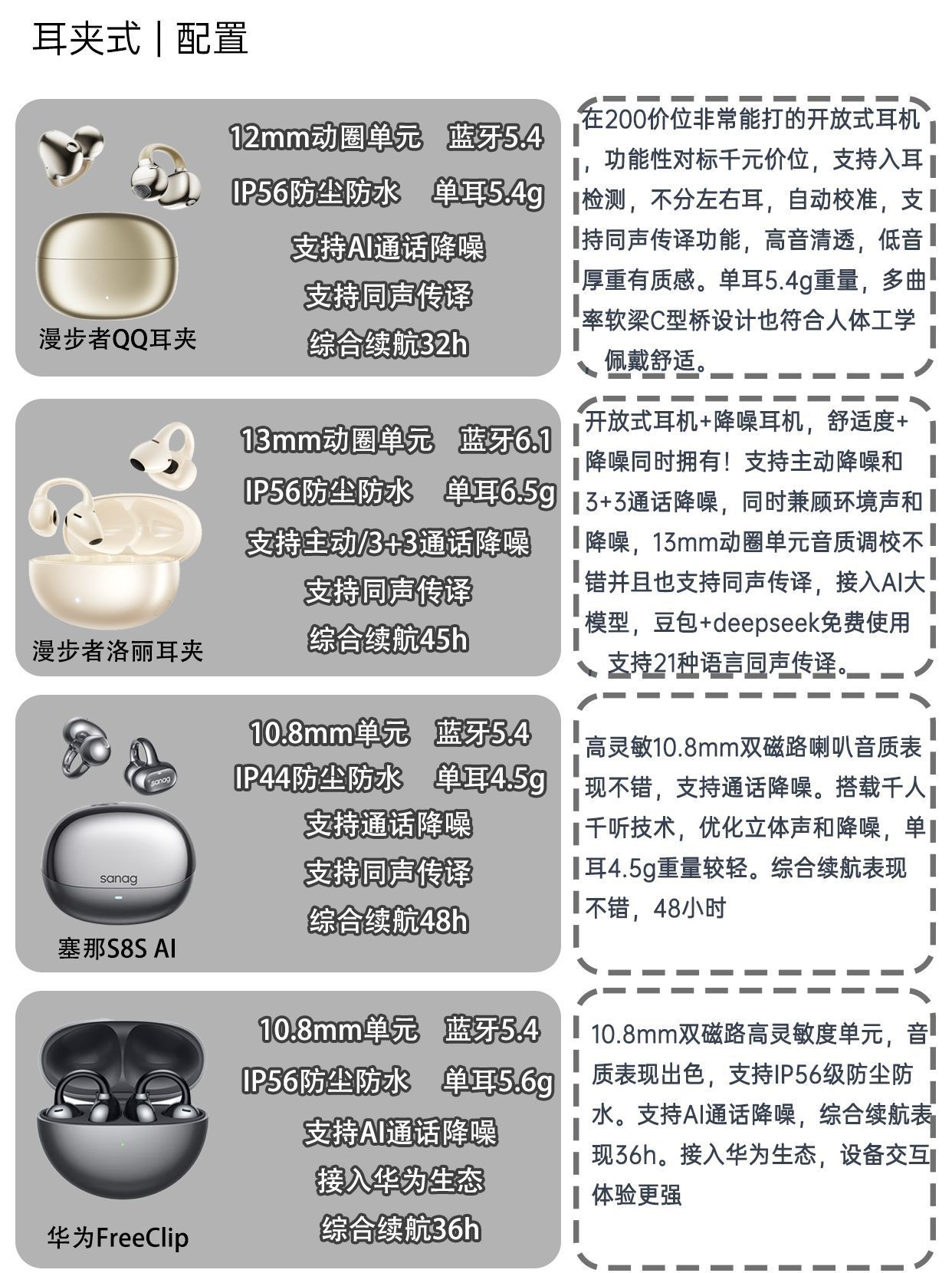 是不是总在纠结:买耳机,音质、降噪、颜值、价格…到底该怎么选?便宜怕踩雷,昂贵又心疼?其实,选对耳机不必如此纠结! 今天,精准盘点了 4款不同价位的‘闭眼入’耳夹式耳机,从百元性价比到千元旗舰,每一款都是同级中的‘卷王’,轻松找到最适合你的那一款,让你每一分钱都花在刀刃上! 1.漫步者QQ耳夹(💰269) 在200价位段非常有性价比的一款耳机,功能性对标千元价位,不分左右耳,入耳即听,自动校正...