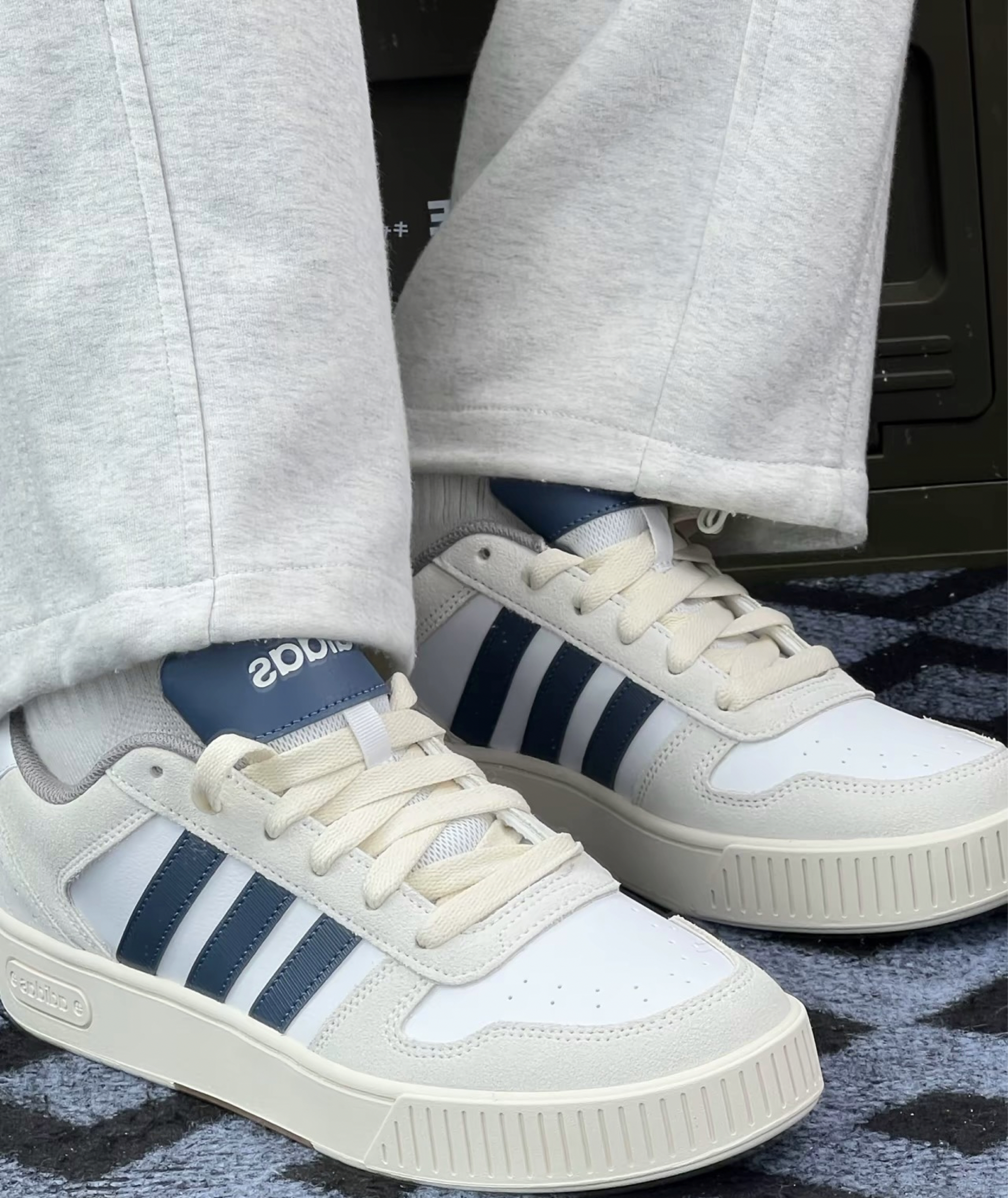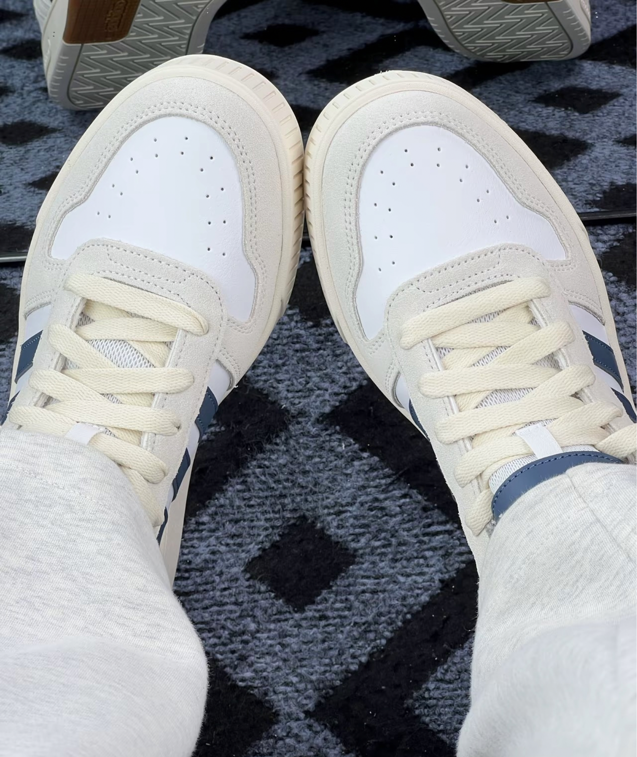 外观速览:奶白色鞋面+藏青三条纹,搭配米白鞋带和浅灰鞋舌,经典德训鞋轮廓带点复古运动风。鞋侧条纹是立体织带材质,比普通印花更有质感,鞋底锯齿纹路设计独特,细看细节挺用心~ 上脚感受·优点: 1.皮质鞋面好打理,上周蹭到咖啡渍拿湿巾一擦就掉,懒人福音👍; 2.鞋型宽松不挤脚,38码脚穿厚袜子也舒服,日常通勤走1万步没磨脚; 3.配色百搭,配卡其裤是日系少年感,搭碎花裙居然也不违和,实...