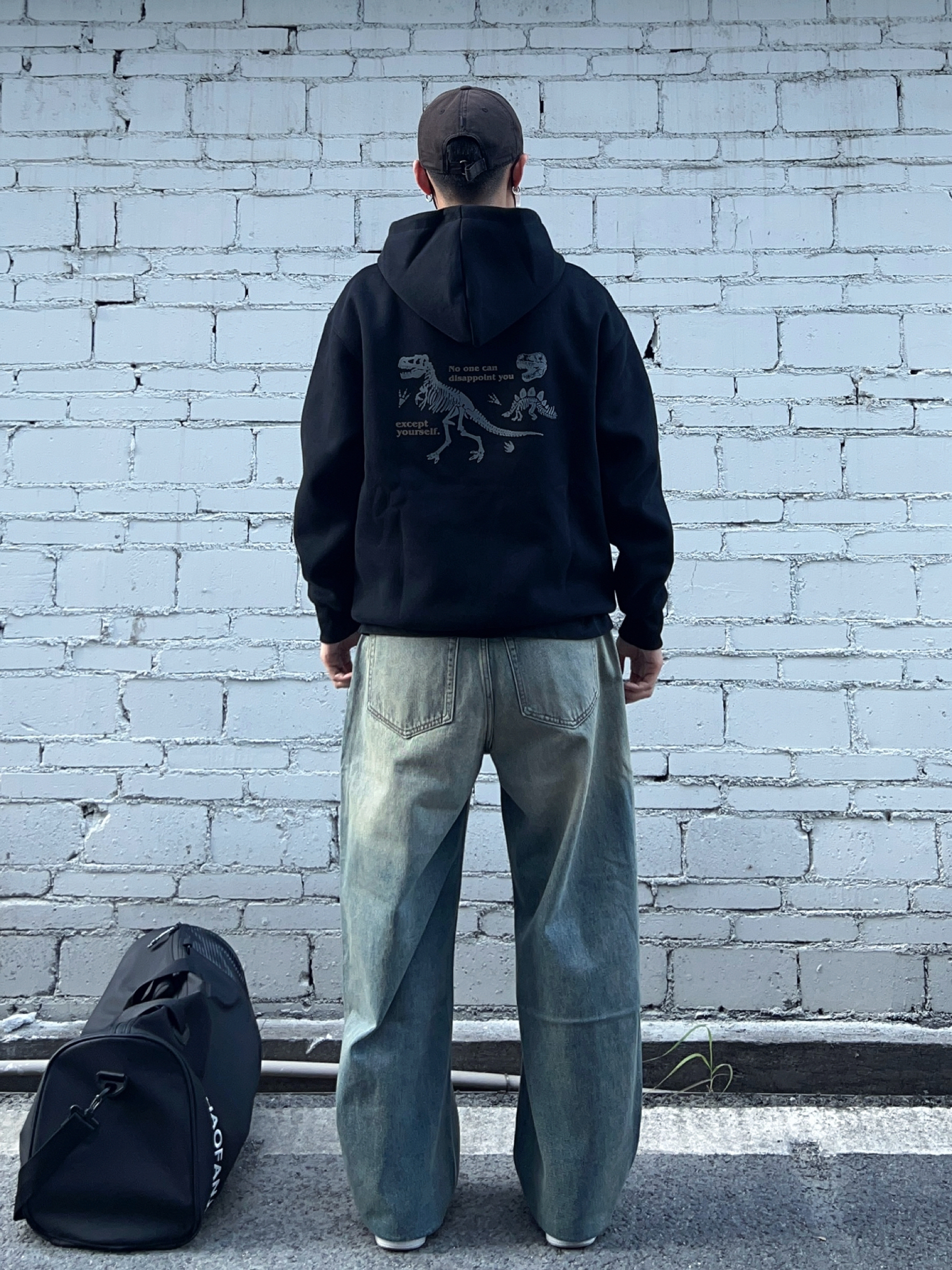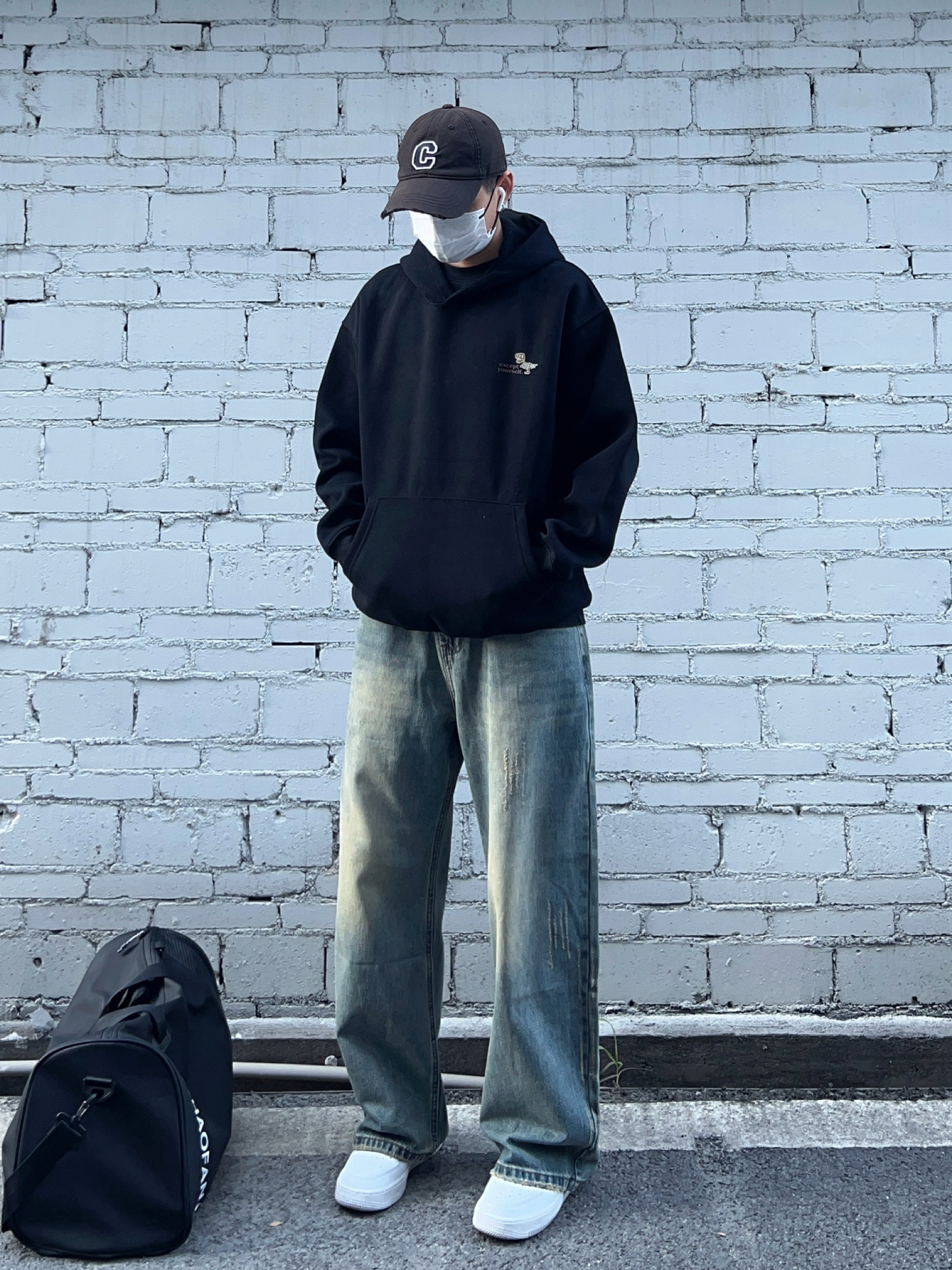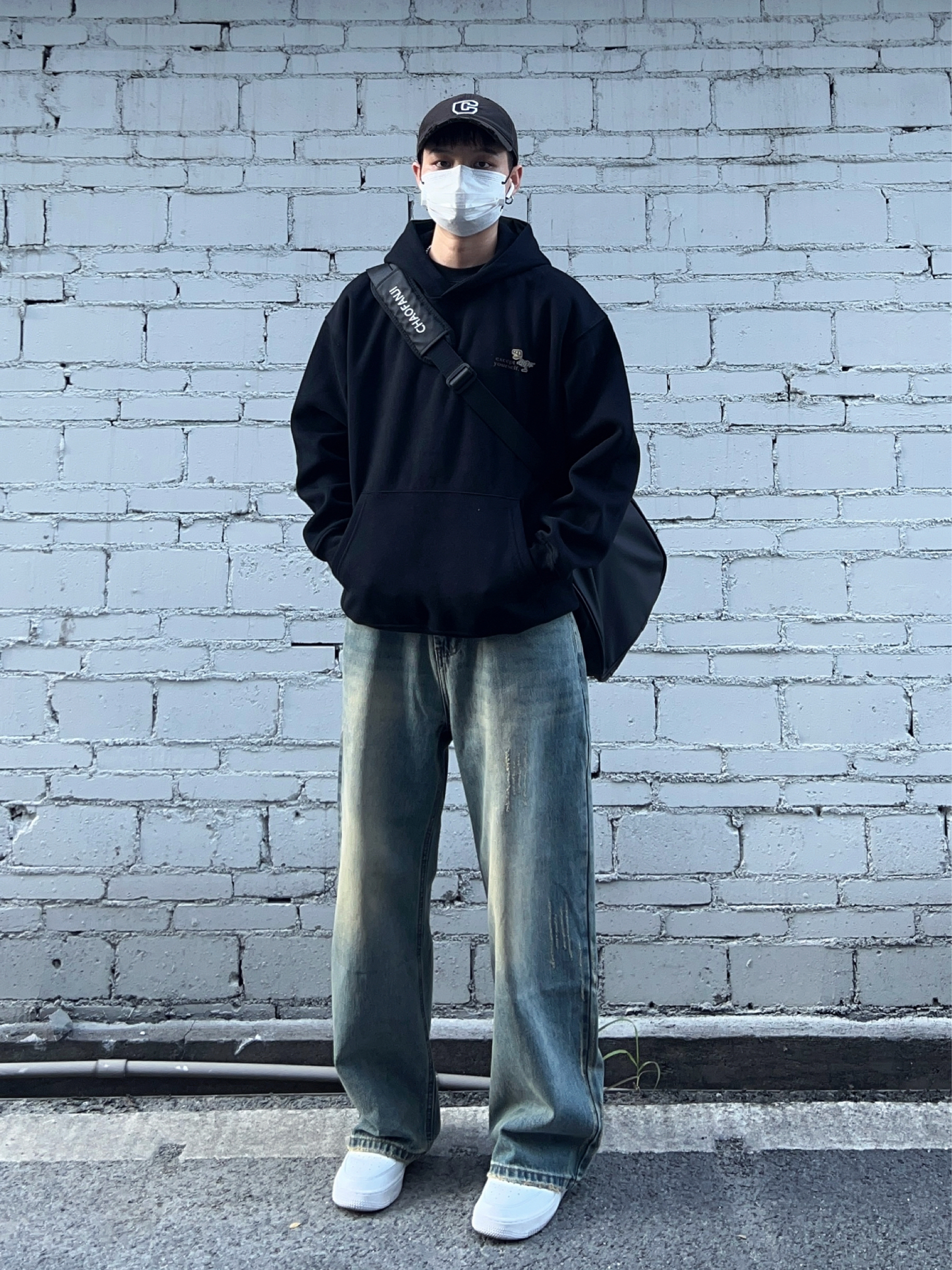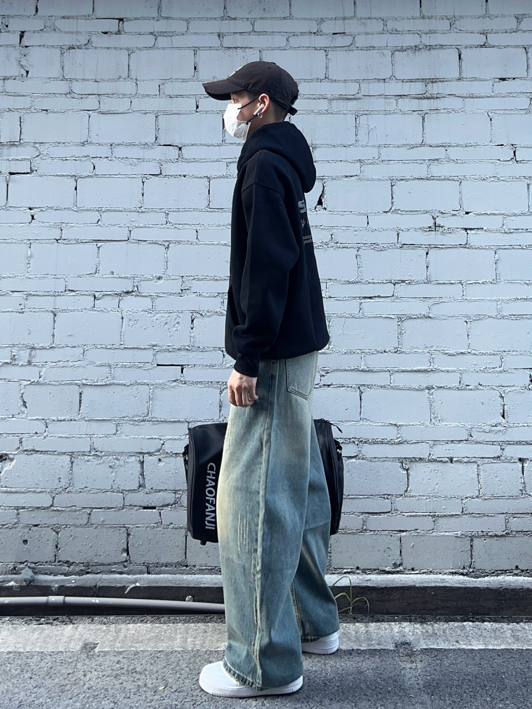 秋季开学通勤这么穿包帅! 上身黑色重磅连帽卫衣拿捏秋季氛围感,简约设计版型宽松,秋冬单穿叠穿都很好看 搭配一条黄泥蓝牛仔裤和白色板鞋 复古少年感十足!