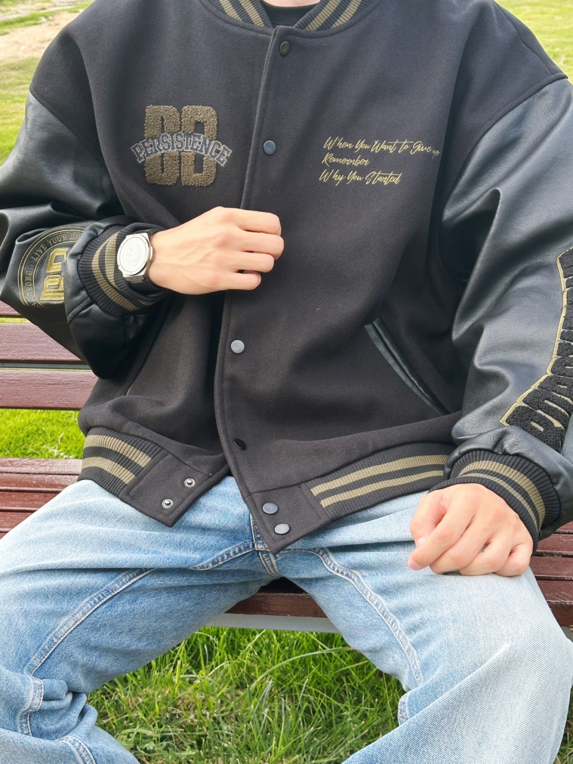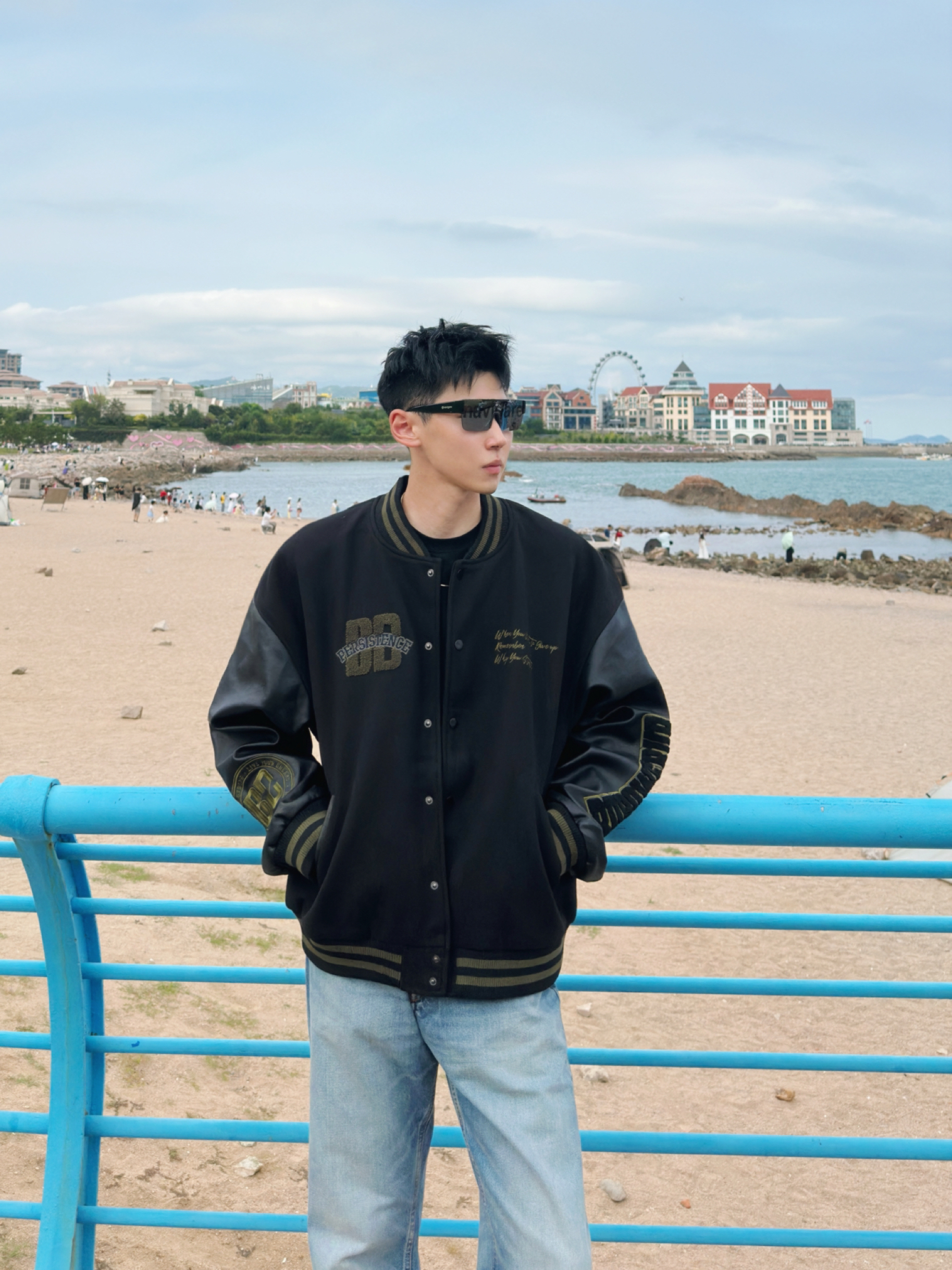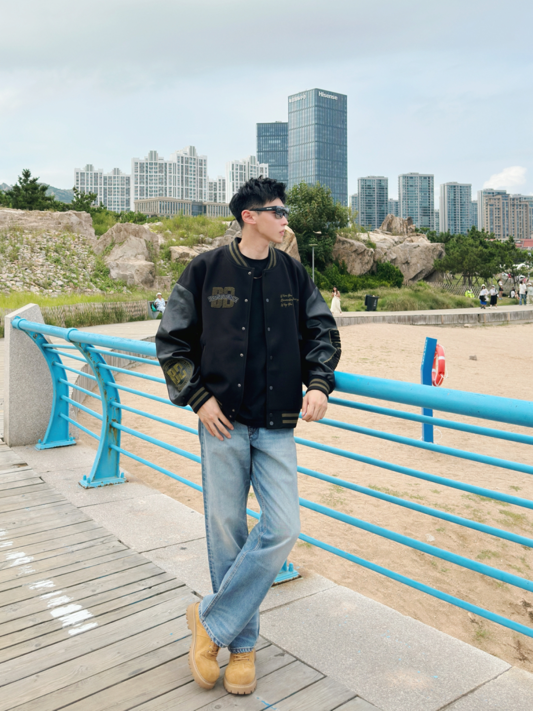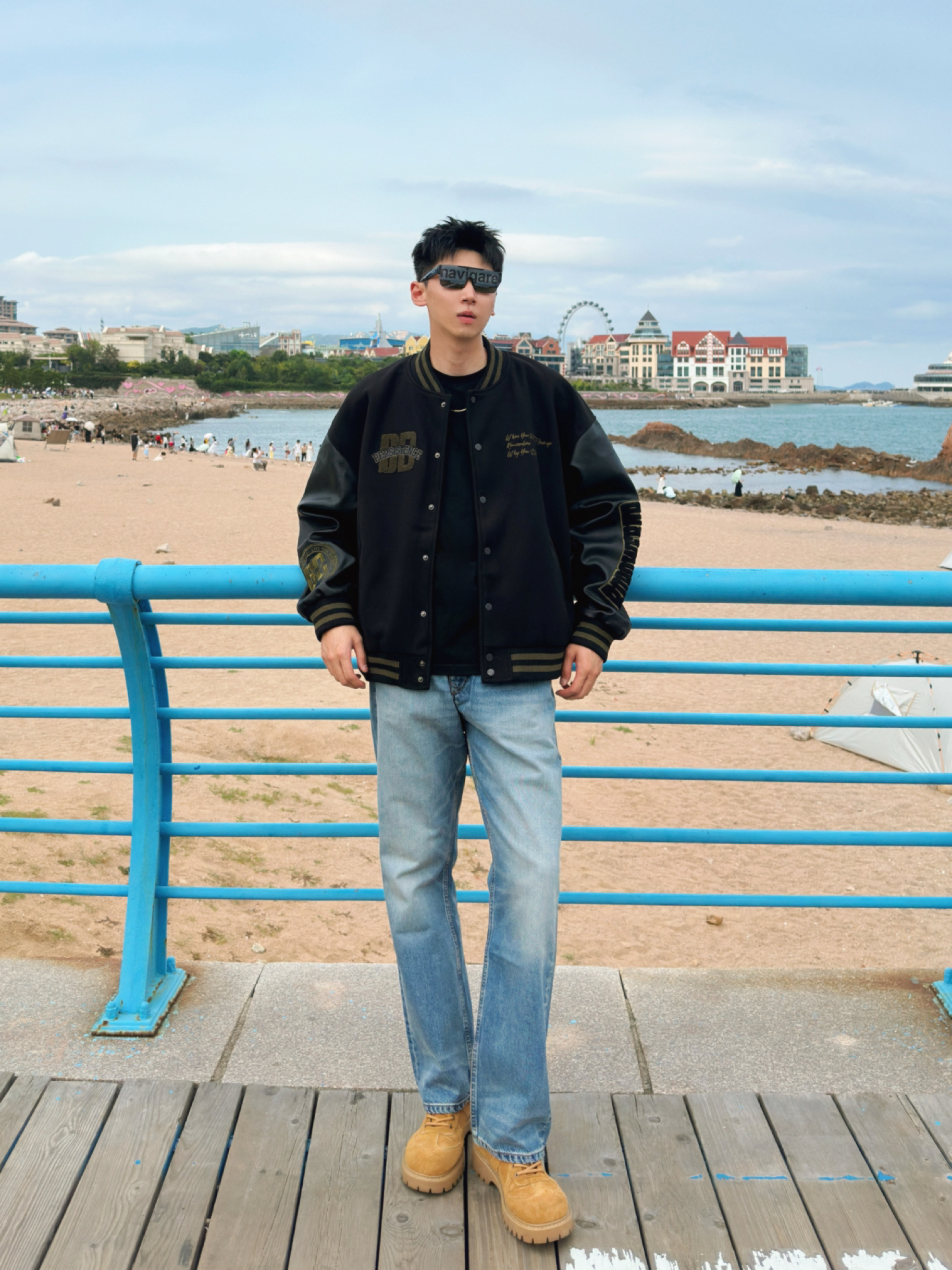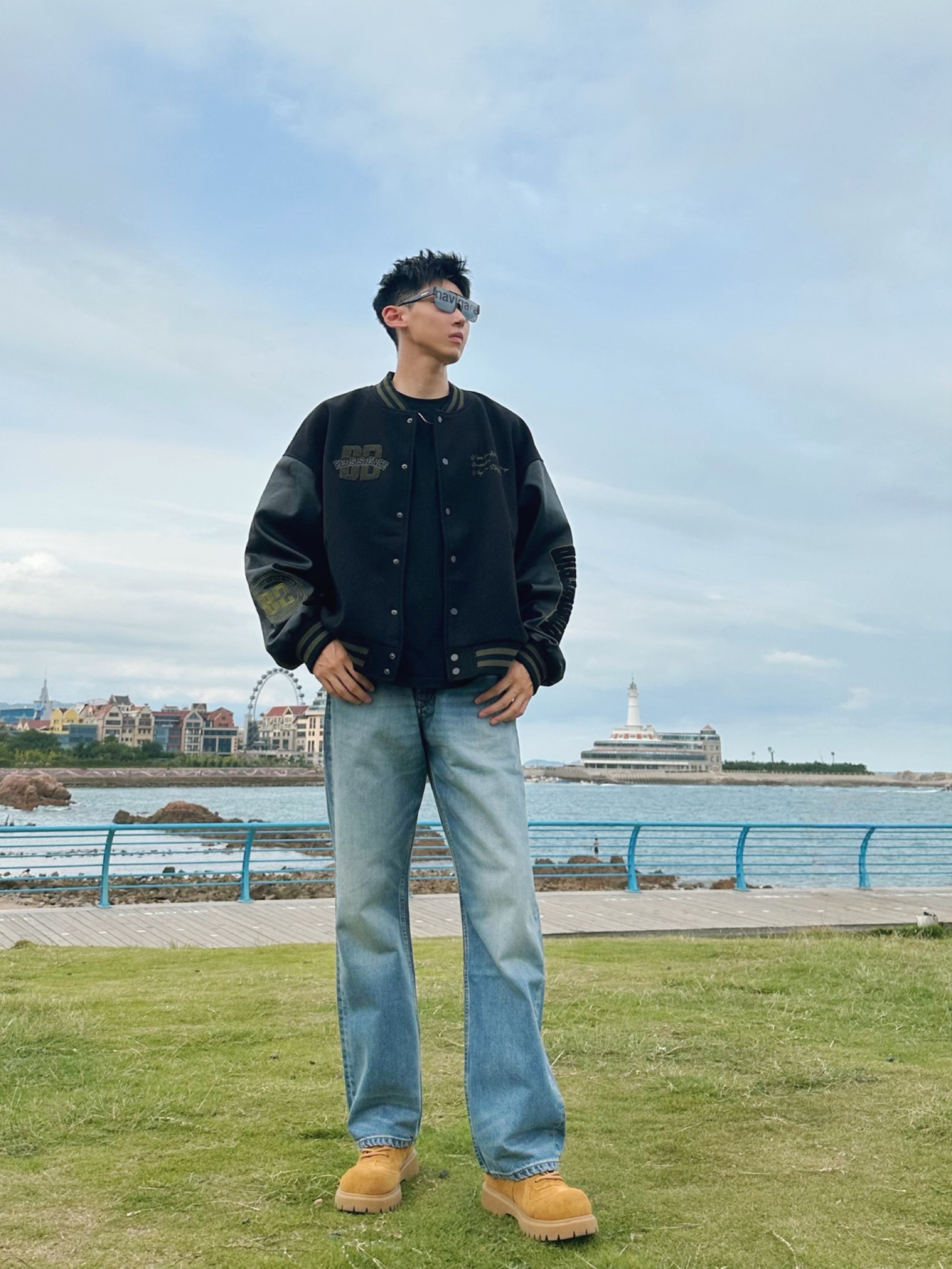 开学季了 还不知道怎么穿的兄弟们看过来了 - 上身一件BD.POWER UP+ 美式复古棒球服 宽松夹克的版型➕毛呢绣花撞色 而且袖子都是做的拼接皮质 搭配一条简约的直筒牛仔裤 洗水做旧的效果和今日美式复古的氛围感蛮搭调的 13.5盎司的面料不薄不厚,早秋穿着还是OK的 最后上脚一双圆头的德比大黄靴 这样的一身,开学还拿捏不了你的小美吗