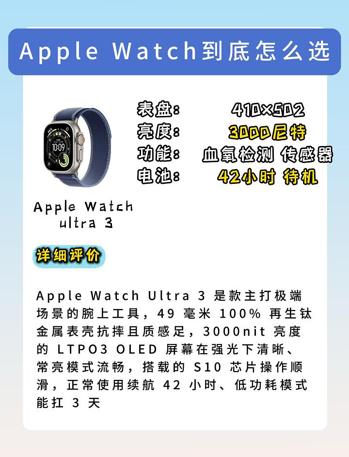 宝子们!Apple Watch 到底怎么选?今天直接把Ultra 3、Series 11、SE 3这三款扒得明明白白,按需冲就完事儿! Apple Watch Ultra 3 主打 “极限场景腕上工具”!49mm 100% 再生钛金属表壳,抗摔又有质感;屏幕是 3000 尼特 LTPO3 OLED,大太阳下看得清、常亮模式还丝滑;S10 芯片流畅度拉满,续航直接干到 42 小时,低功耗模式甚至能...