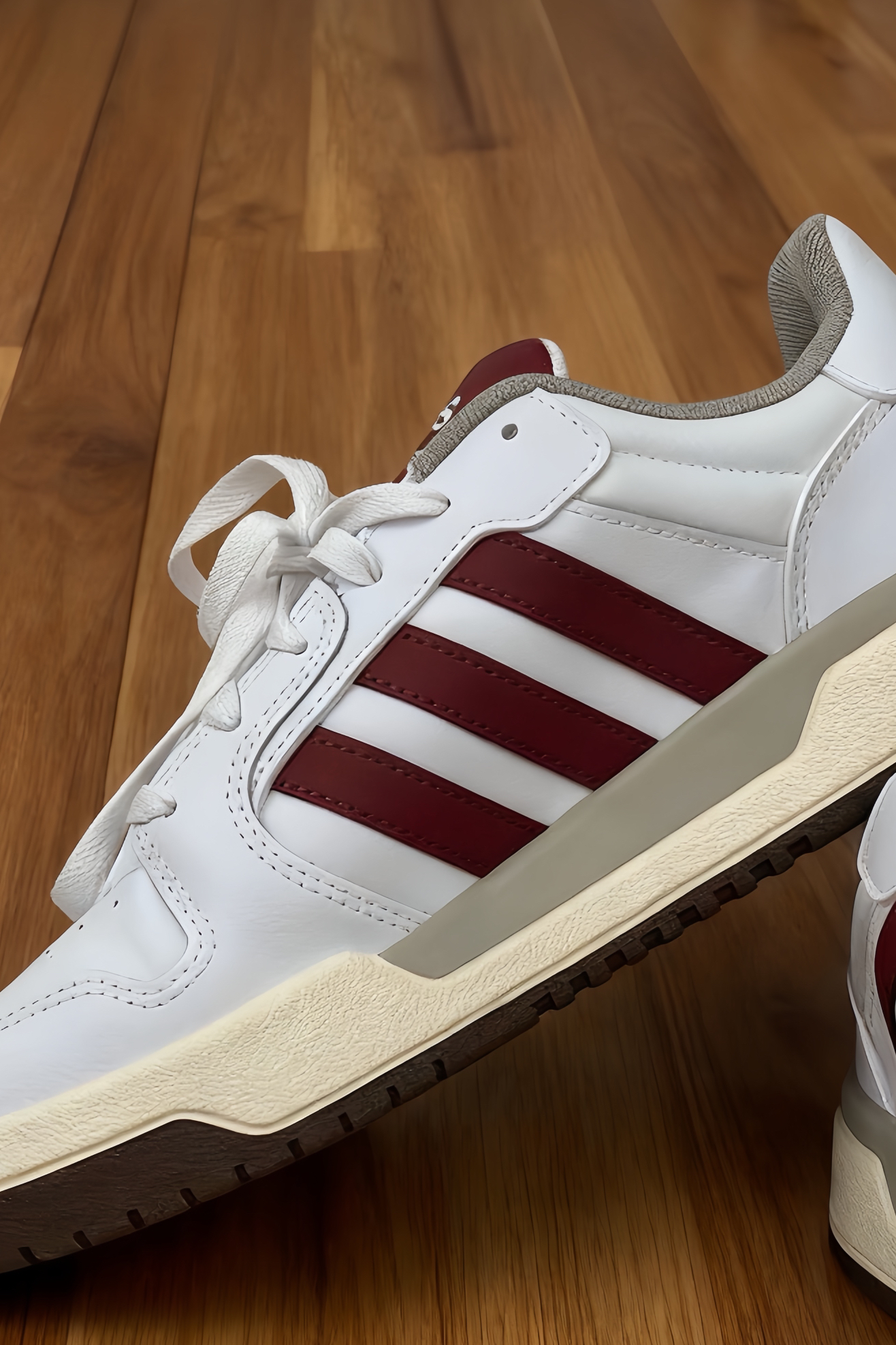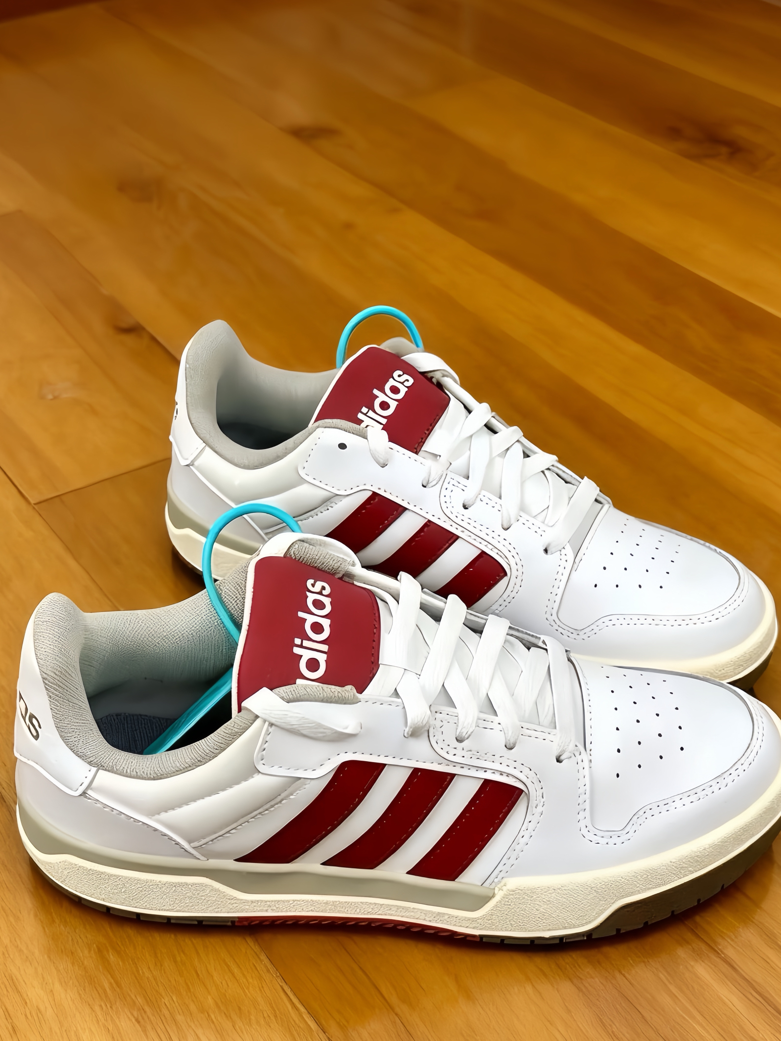 这双adidas板鞋真的长在我的审美点上。经典的白红配色,简约又复古,三条纹标志超有辨识度,怎么搭都好看。皮质鞋面质感很棒,上脚也舒服,日常出街或者运动都很合适