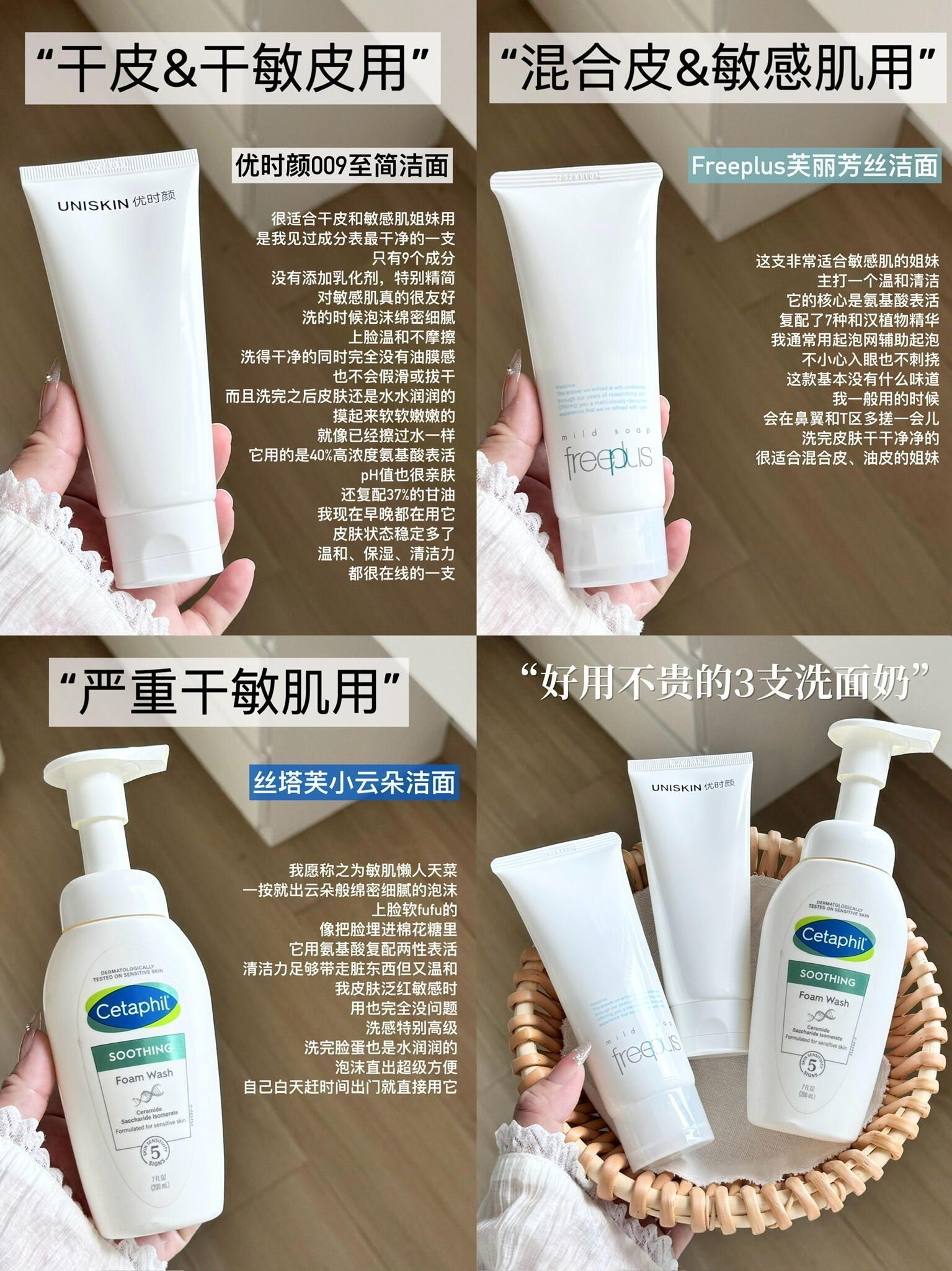 最近是真的能感受到换季的不安了!! 天气忽冷忽热,一下子很潮湿一下子又很干燥🥺 每年这个时候护肤品都会被我大换血!😖 洗脸作为护肤第一步也很重要,一不小心就会喜提红脸蛋 今天就把我自用的三支氨基酸洗面奶分享给大家 姐妹们可以根据自己的肤质和需求参考一下!✍🏻 - ▫优时颜009至简洁面 只有9种精简成分,40%高浓度氨基酸+37%甘油体系,温和保湿 适合人群:干皮&干敏皮,洗养二合一 ▪Freep...