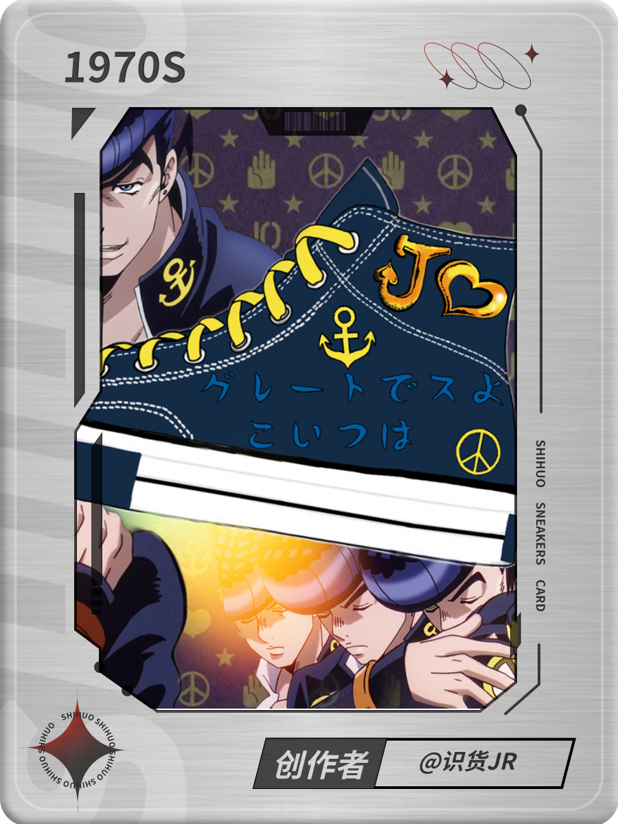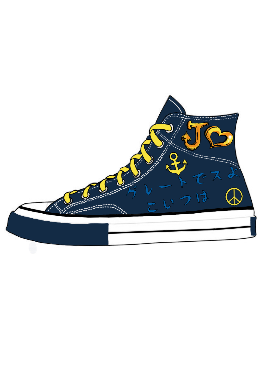 第一个认识的jojo就是仗助,不管是性格还是替身能力都牢牢抓住我的心,从此迷上jojo无法自拔(认真/ 想到之前匡威也有第四部的联名鞋,就想做一个仗助 鞋子内含元素有:鞋装饰为仗助漫画服装元素(刺绣),黄色鞋带=仗助黄色内衬,日文内容(真的Great啊,这个家伙)为仗助口头禅 指绘扣了半天了(枯/求点赞收藏) (禁二改/二传)