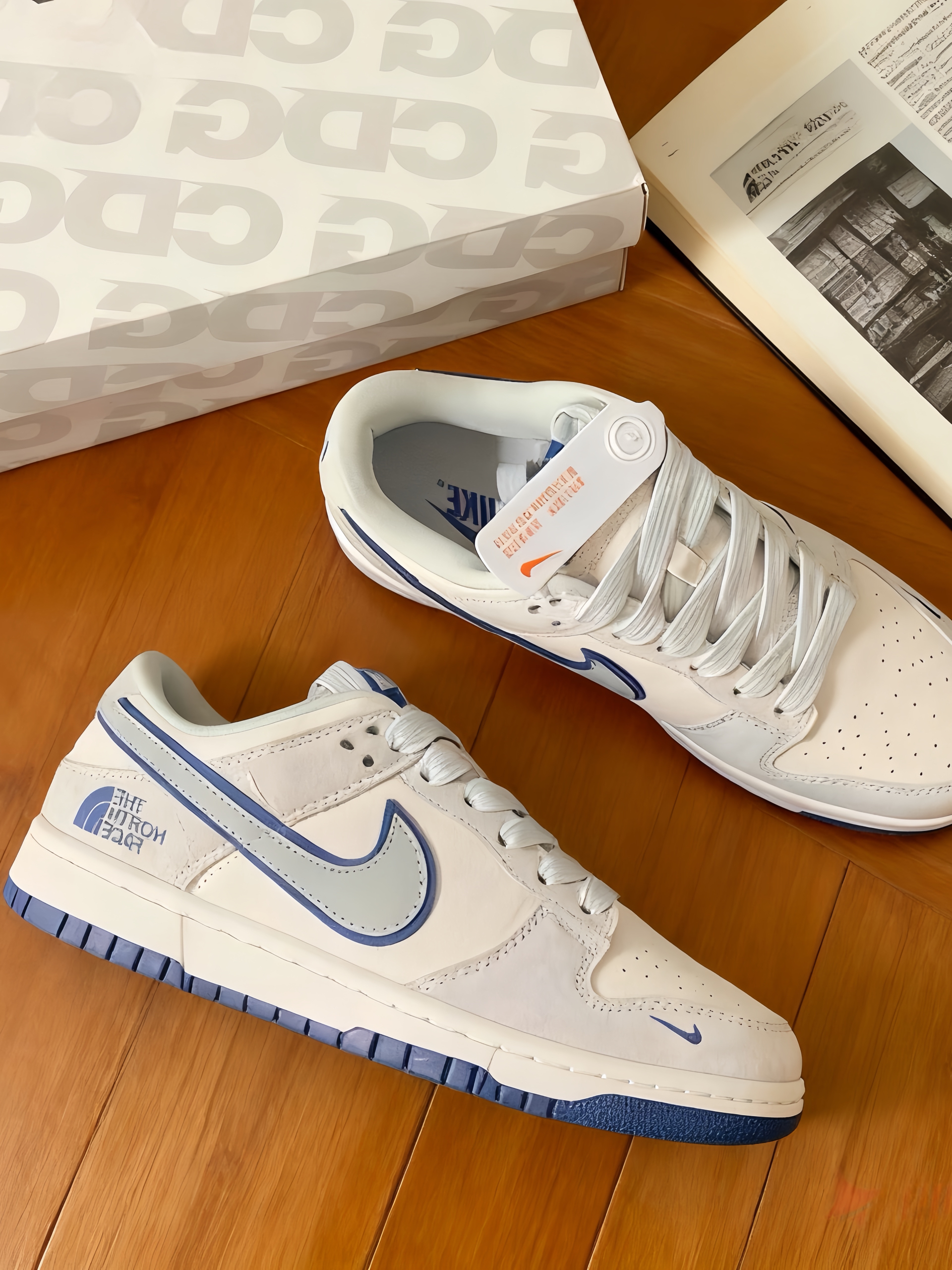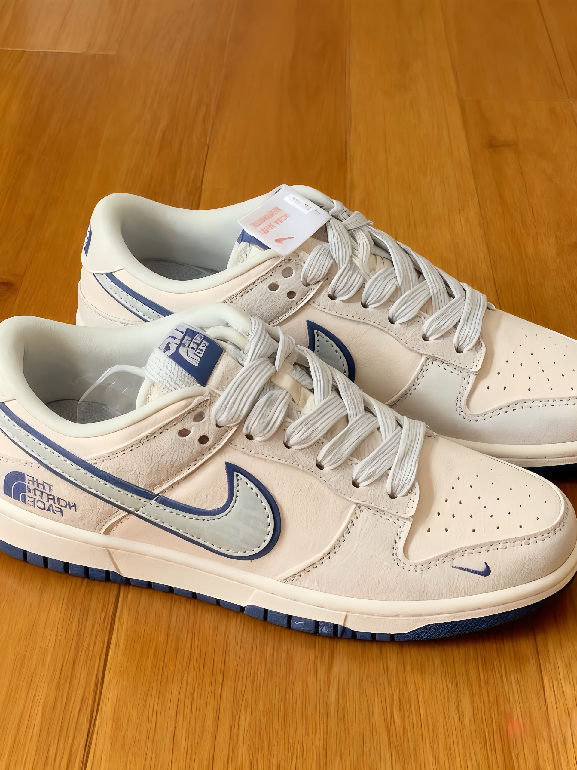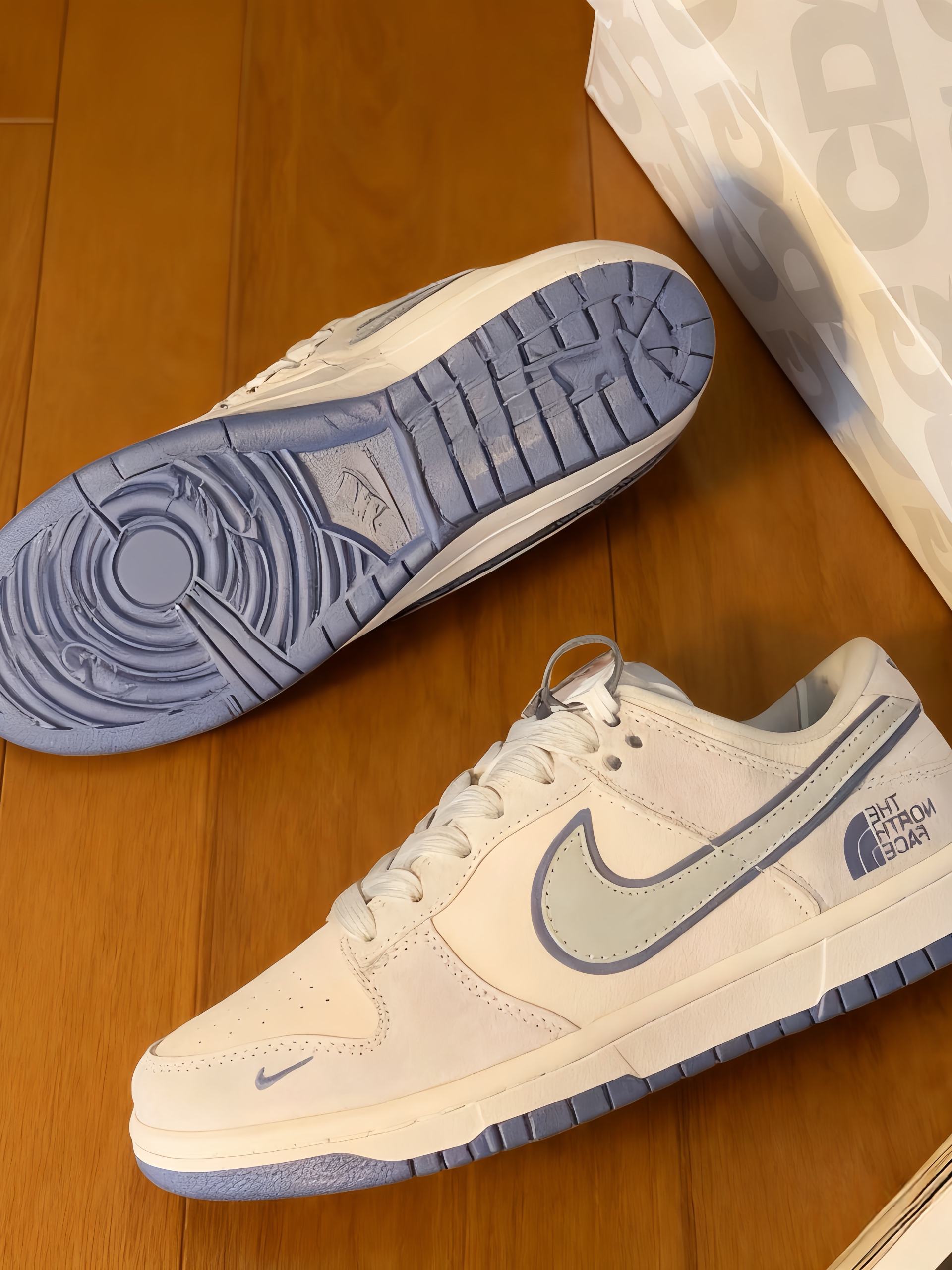 Nike和The North Face的联名款来啦!奶白配浅蓝的色调,清新又高级,两个品牌的标志都很醒目,细节满满。鞋身质感超棒,上脚舒适又百搭,不管是日常出街还是户外走走都很合适~