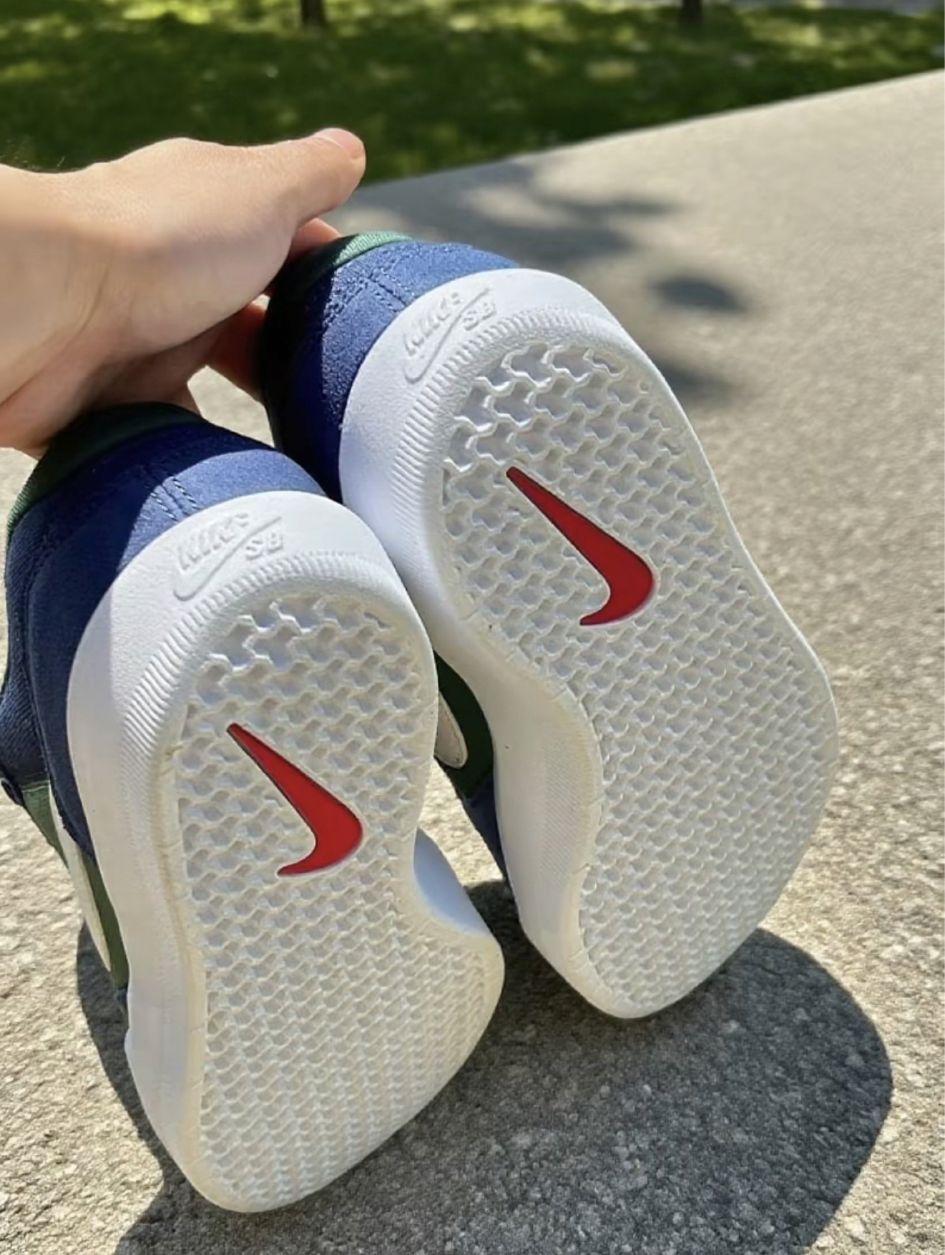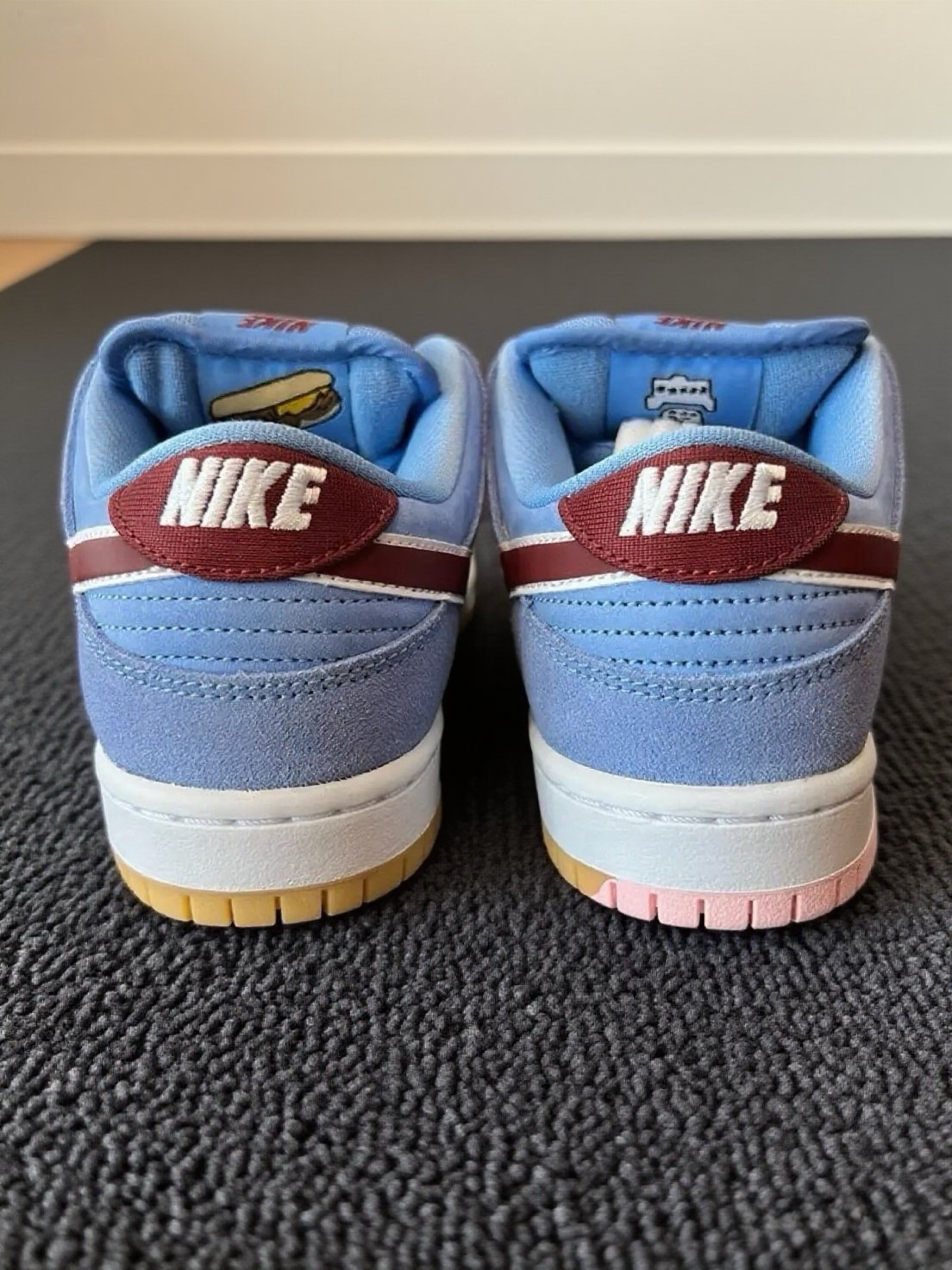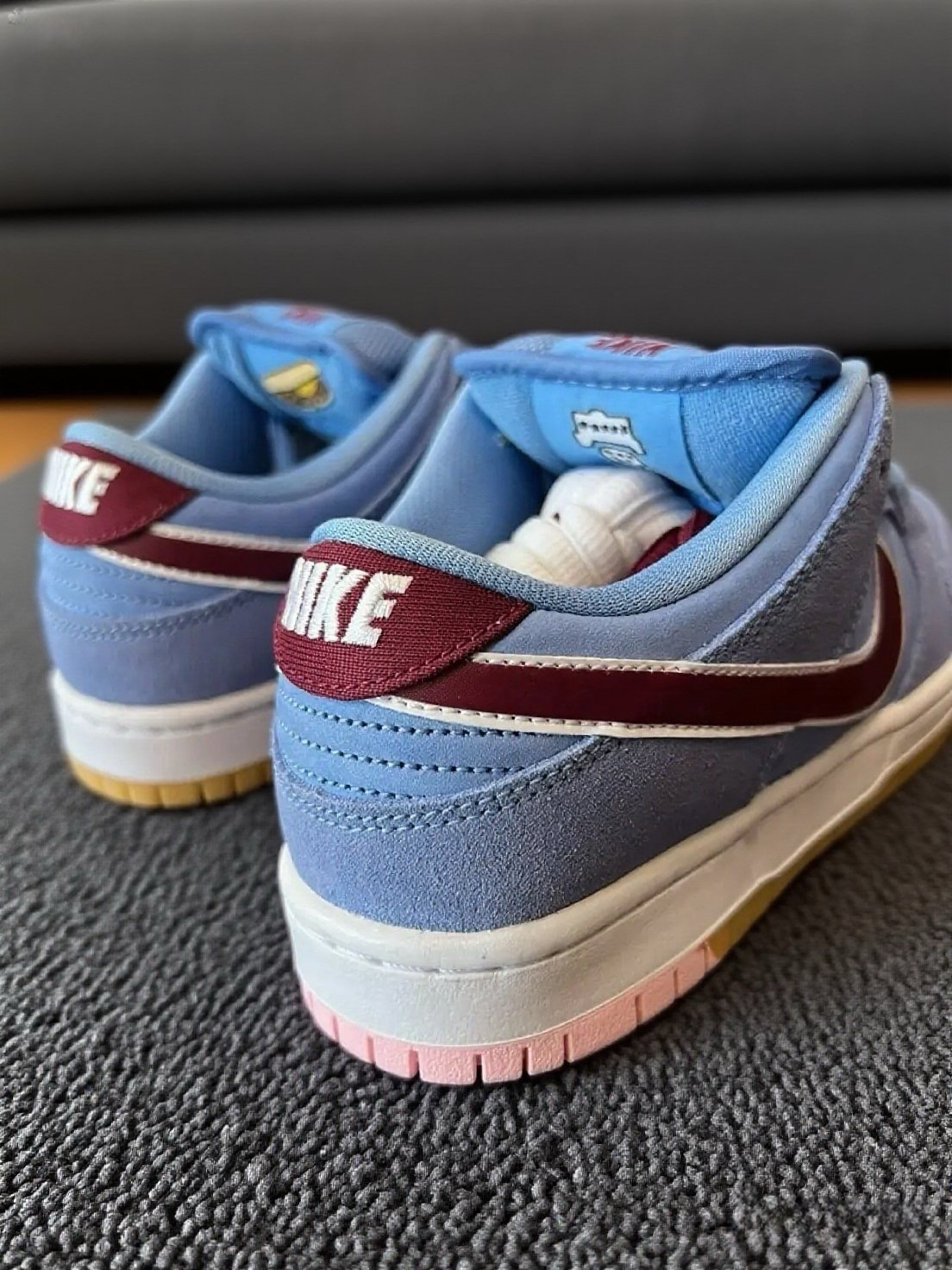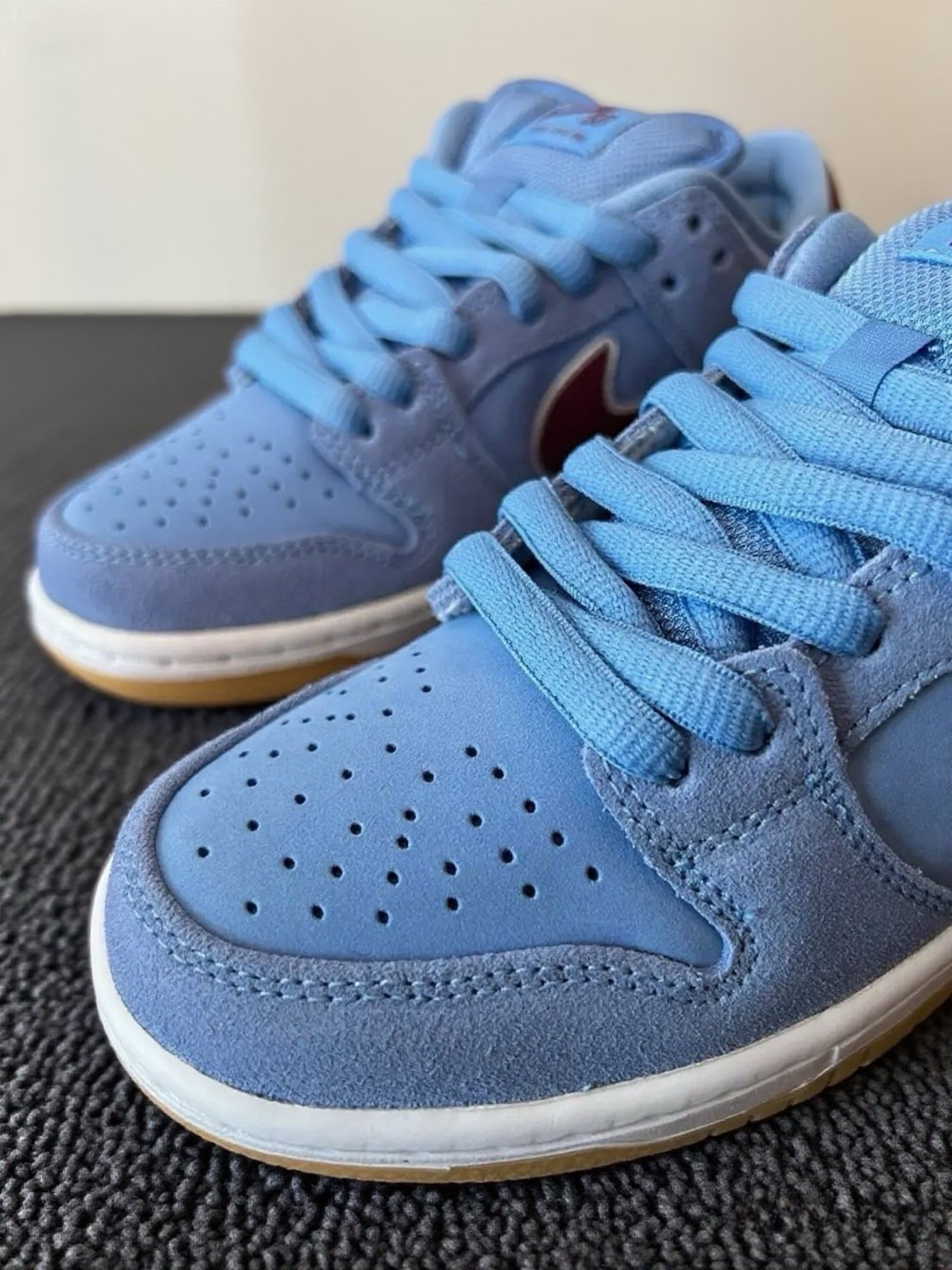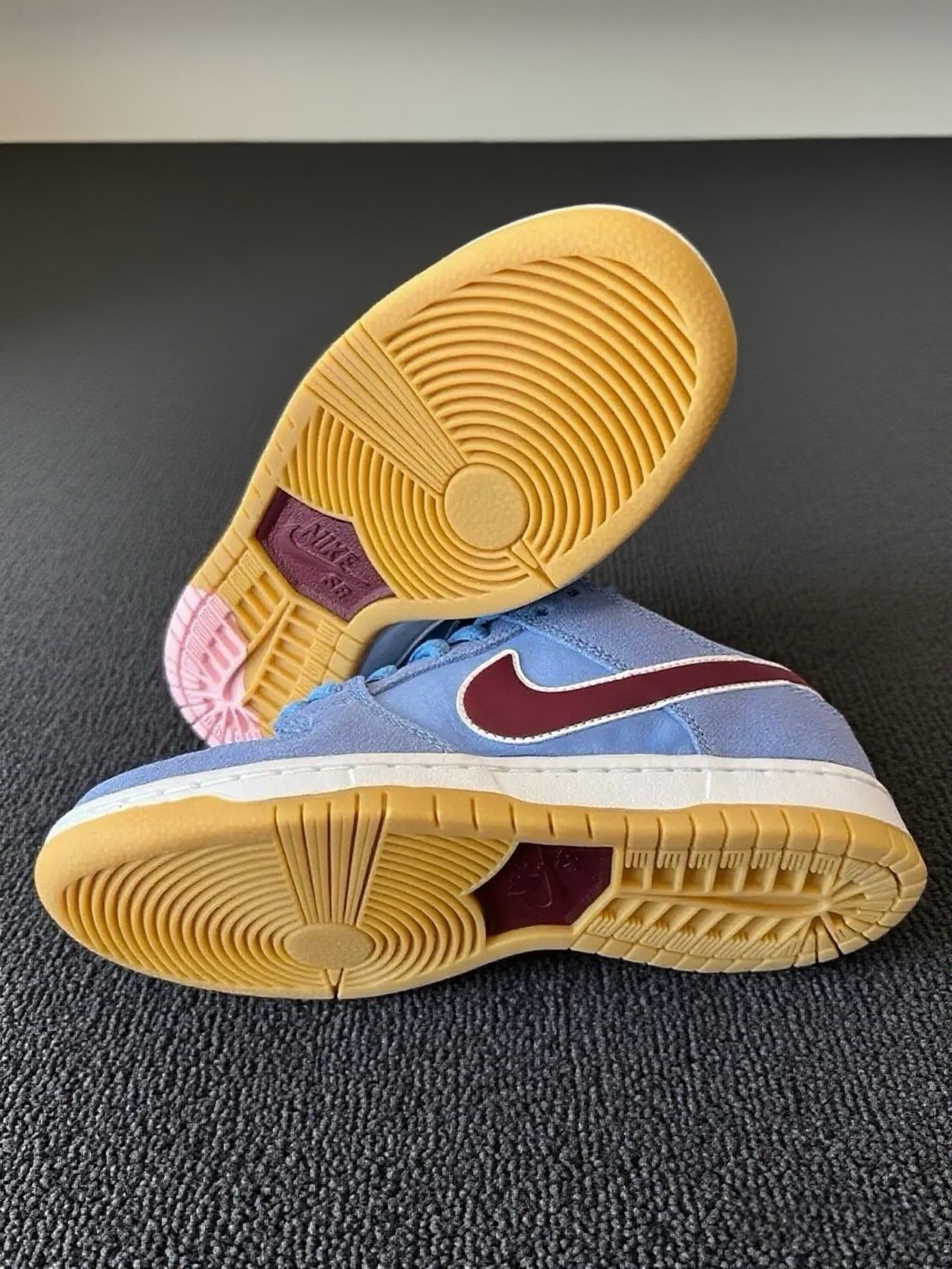 这双Nike SB Dunk,这配色真的太戳我了!淡蓝色的鞋身搭配酒红色Swoosh,还有生胶底,复古又清新。拿到手就忍不住摸了摸,麂皮材质质感很棒,细节处理得也很到位,鞋舌、鞋跟的标志都很精致。上脚试了下,脚感很舒适,包裹性挺好的,走路也很跟脚。而且这个颜色太适合夏天了,感觉随便搭个短裤或者牛仔裤都很出彩,已经开始期待穿着它出门的样子啦,真的越看越喜欢~