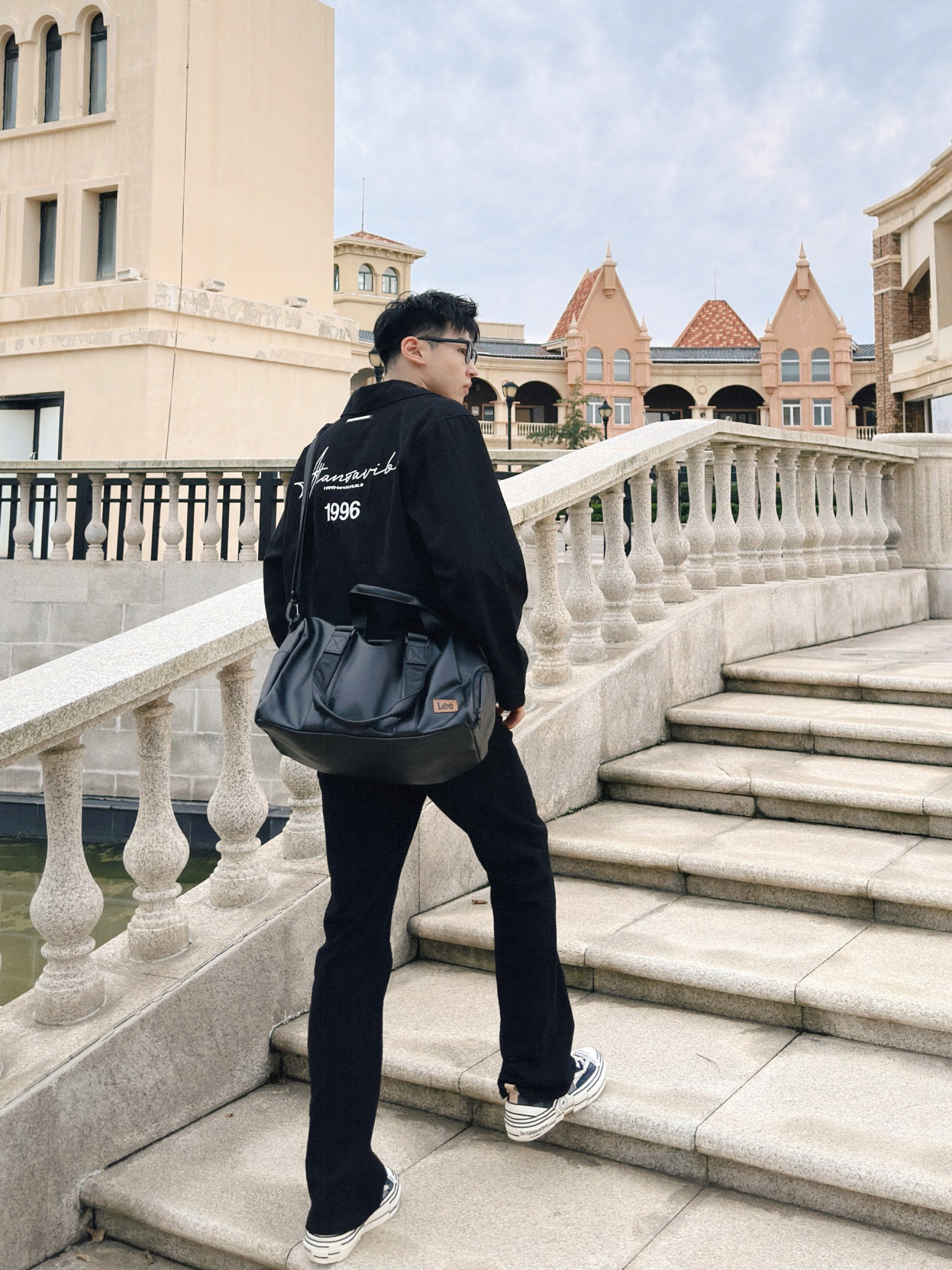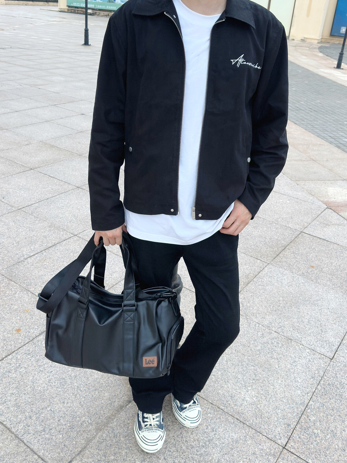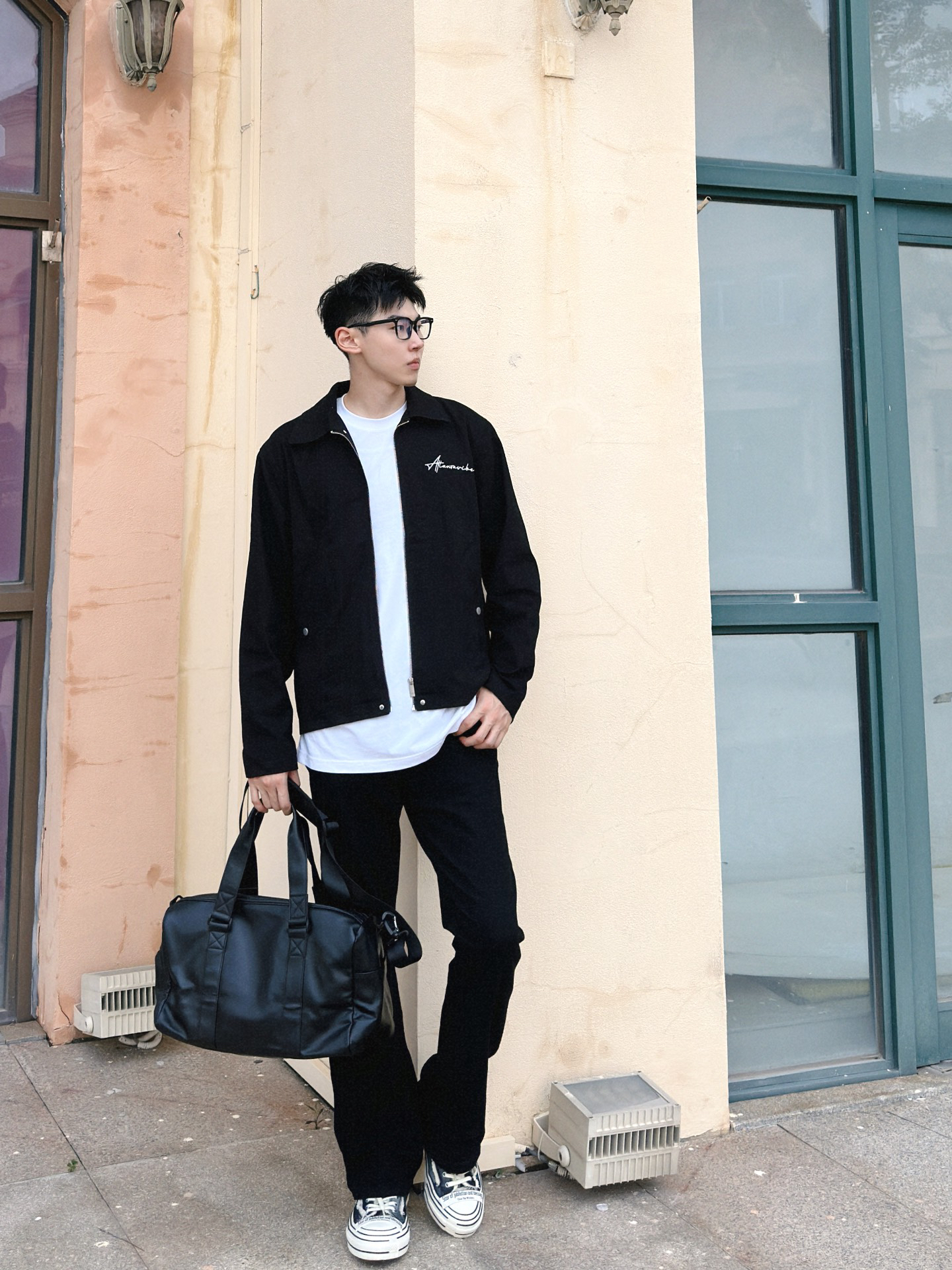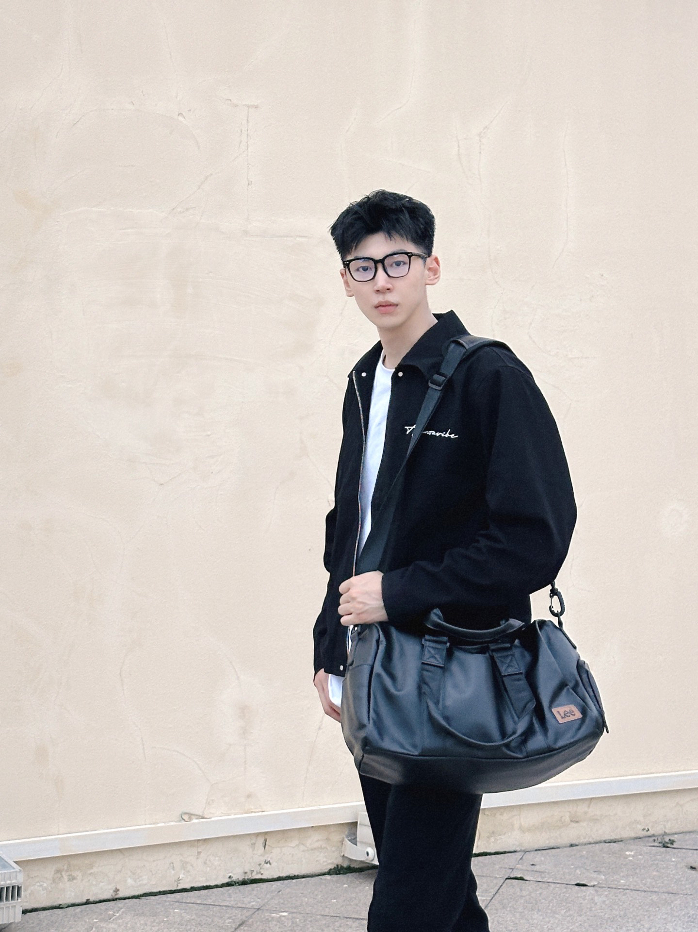 今天还是一套简约的美式穿搭 一身黑但不突兀 一件短款的修身夹克 一条黑色的微喇裤 外加一双增高的帆布鞋 最后再配上一个黑色的皮质单肩包 这一身有够酷的