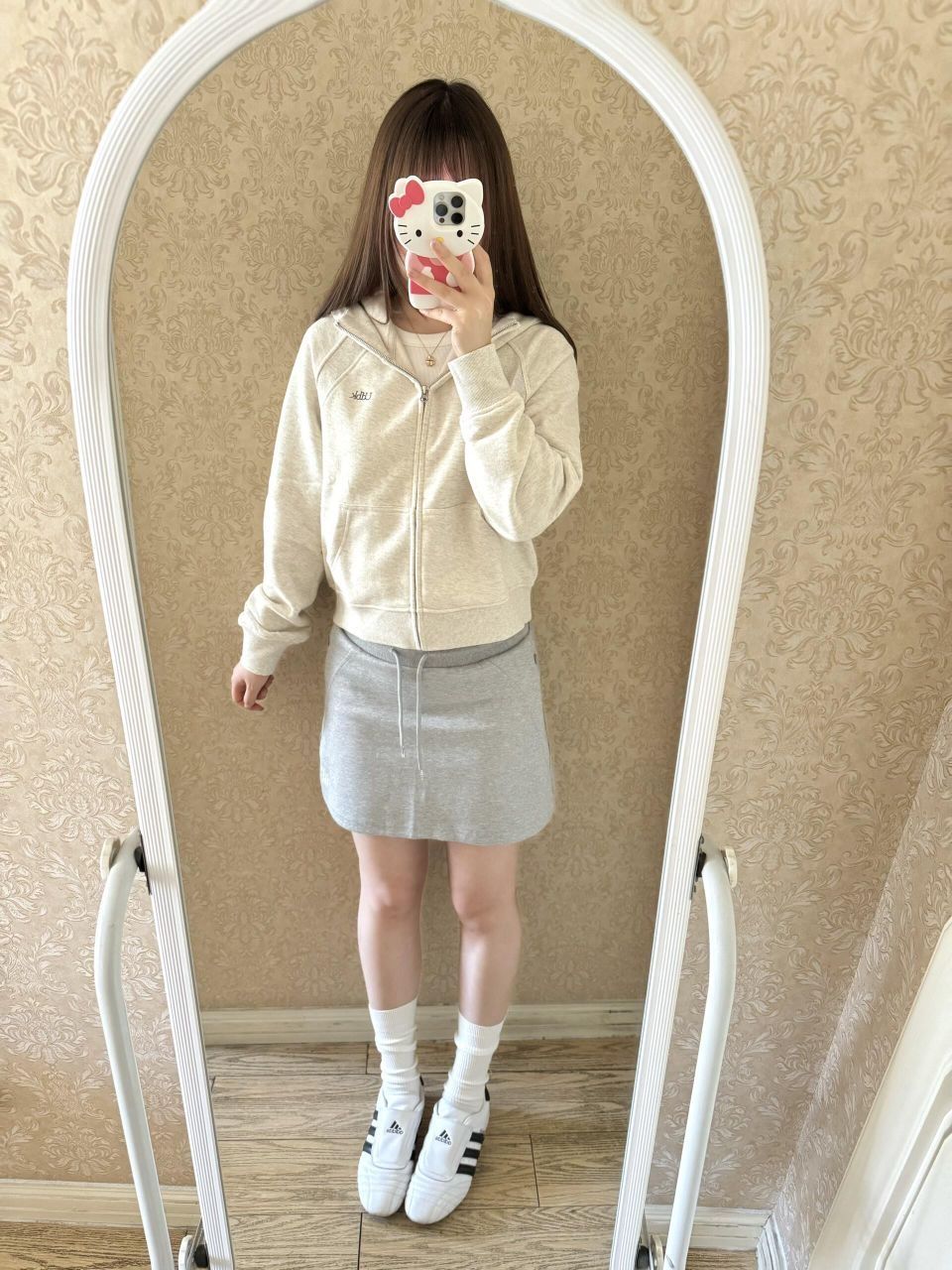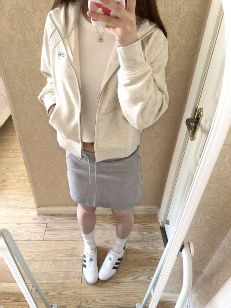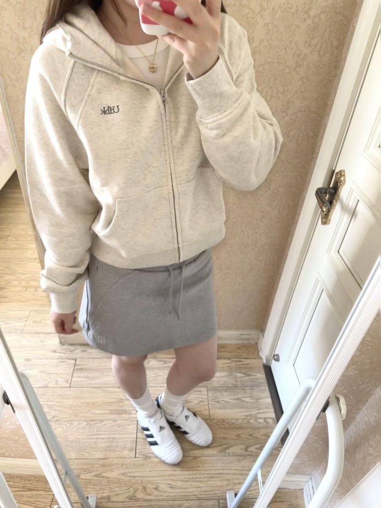 ⬆️:休闲运动风穿搭来啦!燕麦灰色百搭又高级!短款有点点小宽松的设计上身真的很休闲舒适!外套前面的走线我很喜欢比较简约!面料很软内里有一点点绒质量很好! ⬇️:搭配了灰色的运动短裙很显比例!短裙搭配卫衣外套真的很俏皮!