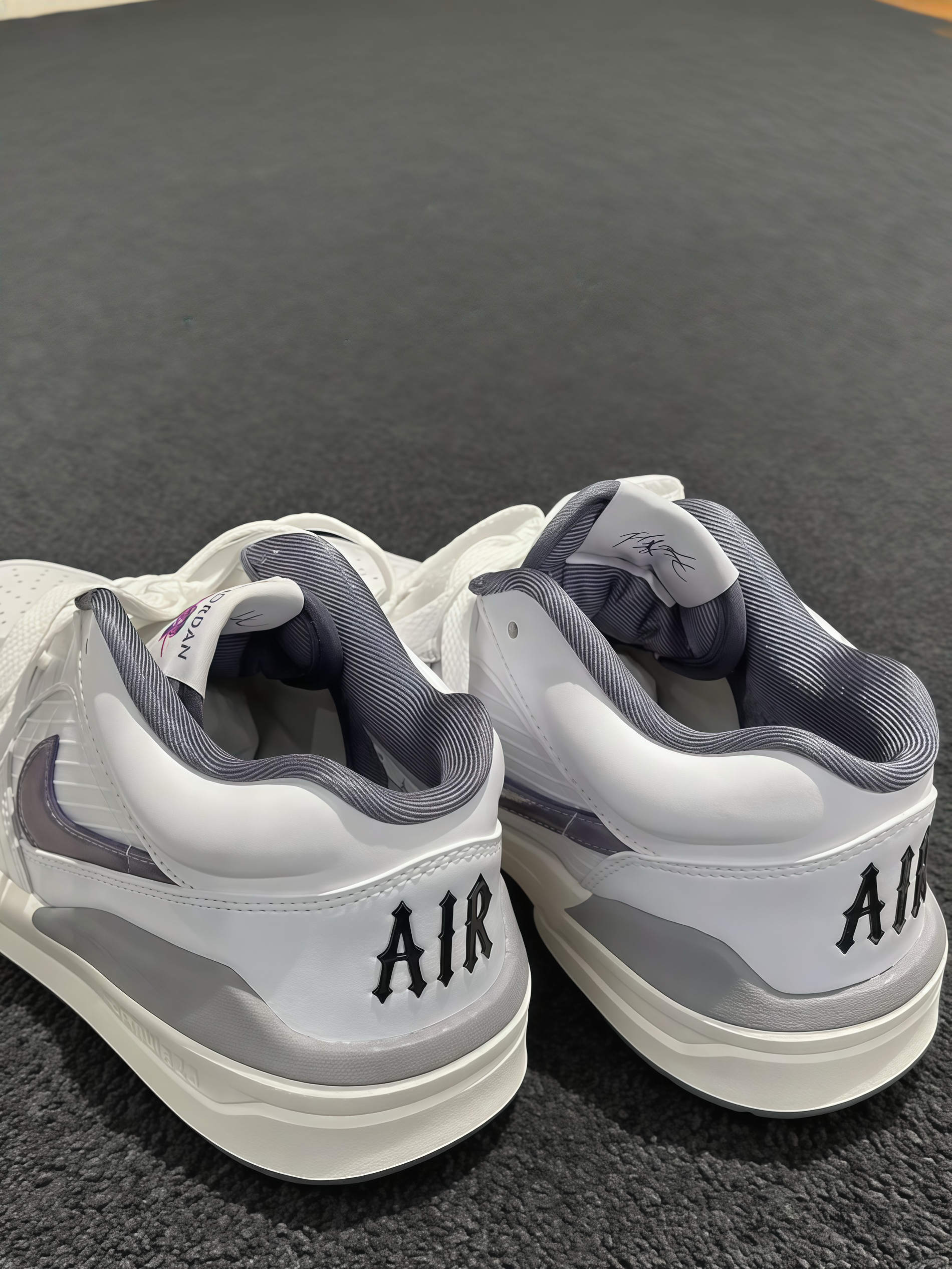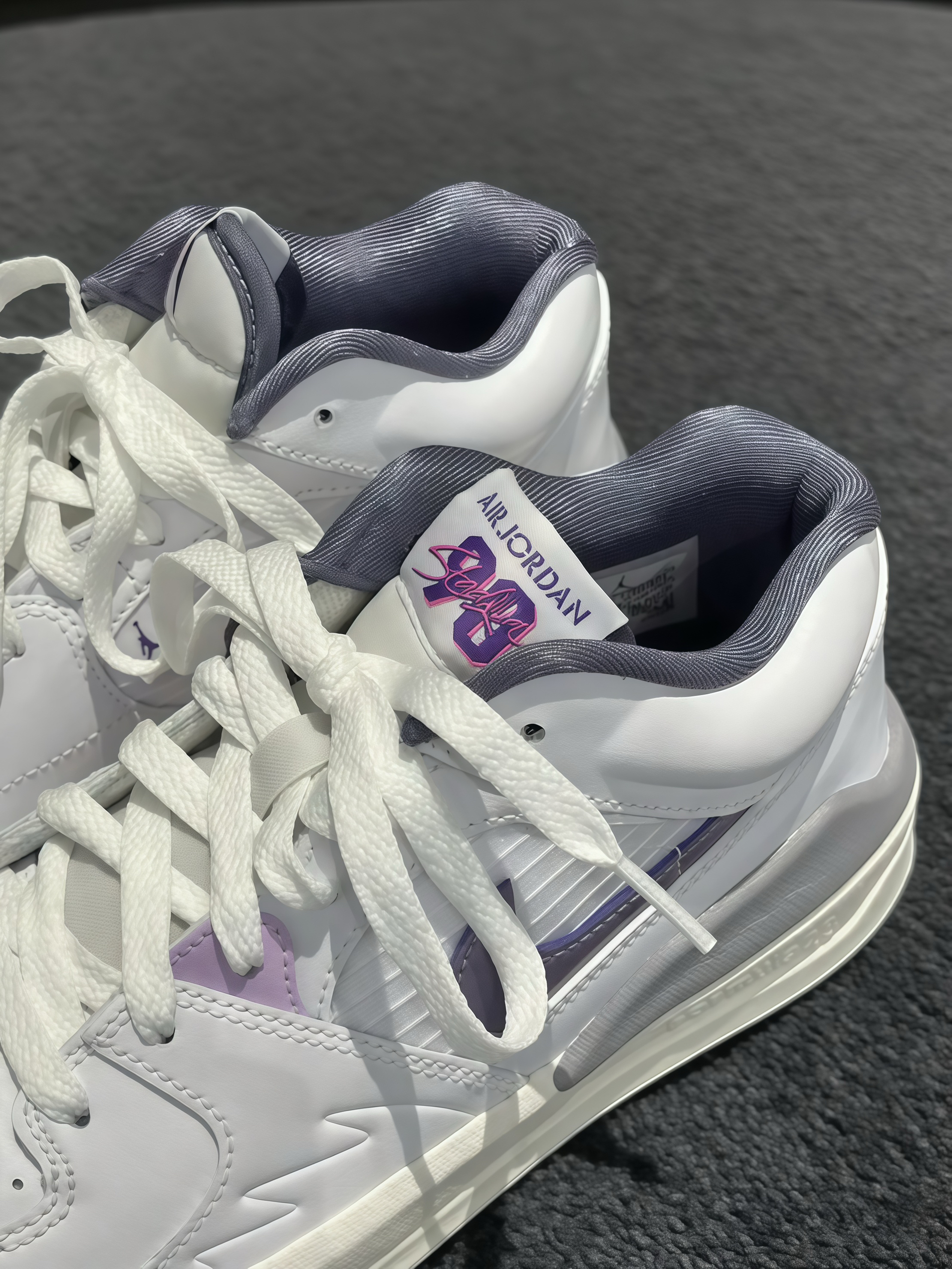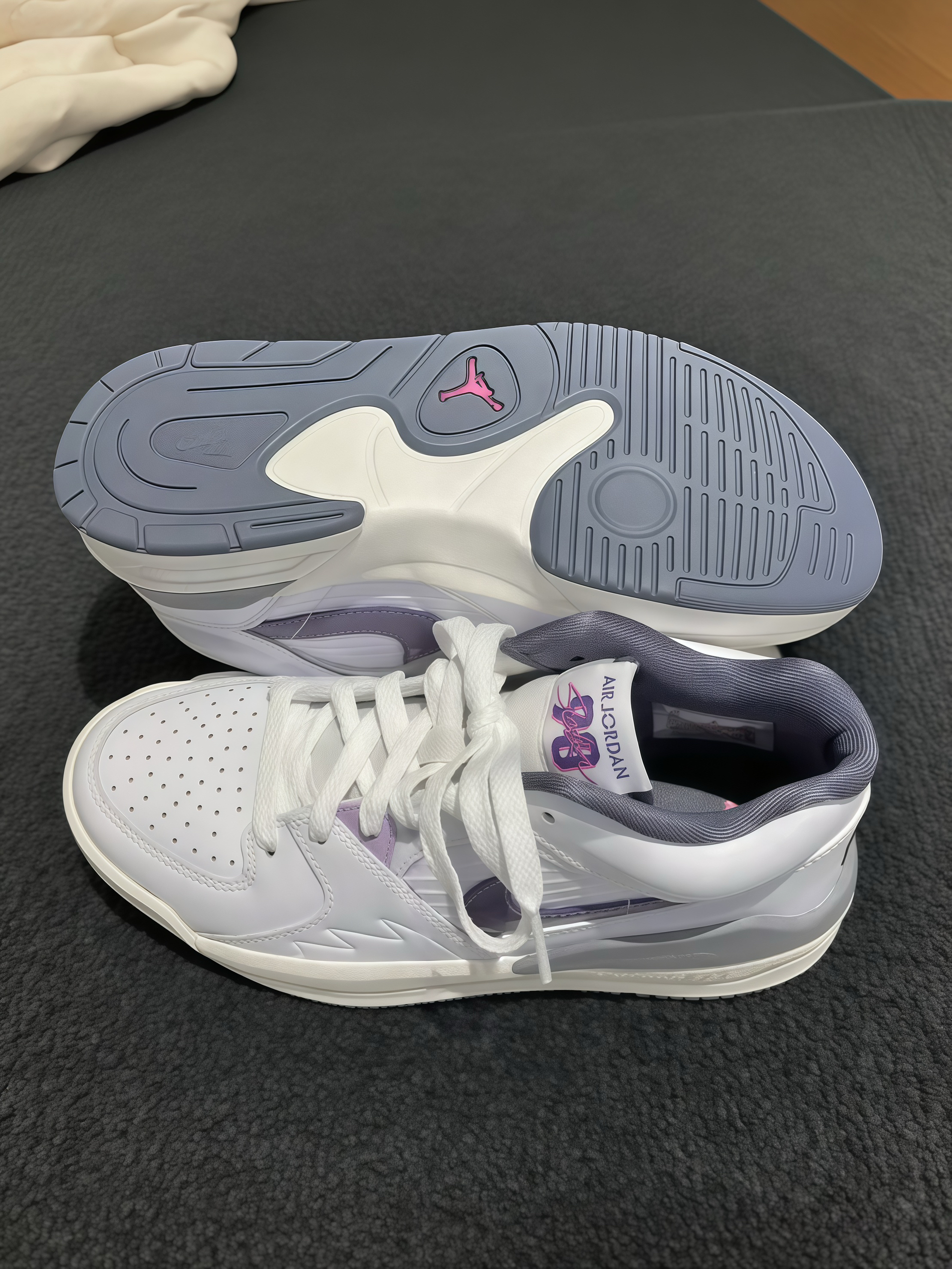 收到这双Air Jordan,拆开瞬间被颜值戳中!白紫配色清新又高级,鞋型很利落。上脚试了下,脚感意外舒服,包裹性挺好,走路也轻松。细节也很在线,鞋舌的标志、后跟的“AIR”都很有质感。平时搭休闲裤、运动裤都很合适