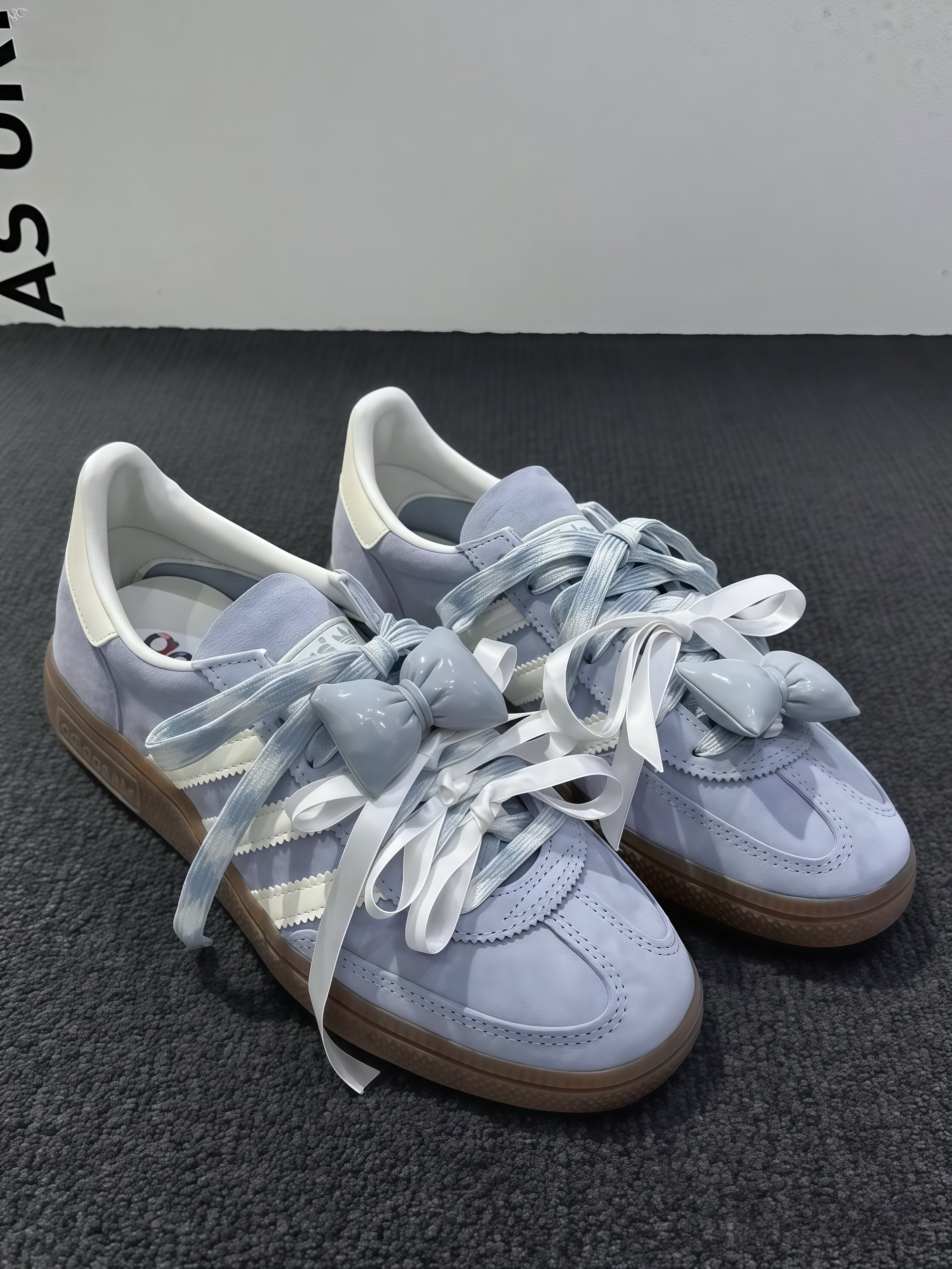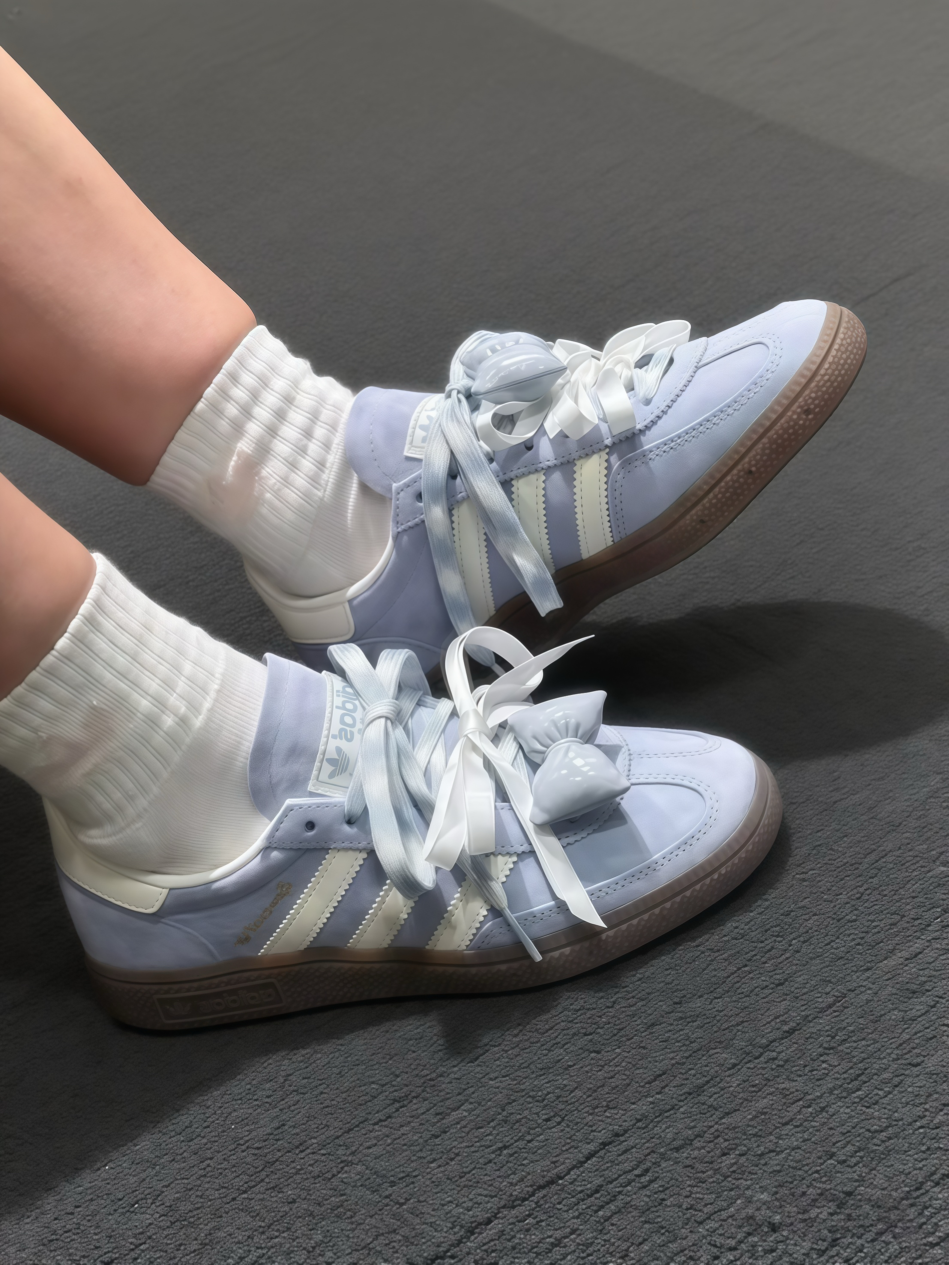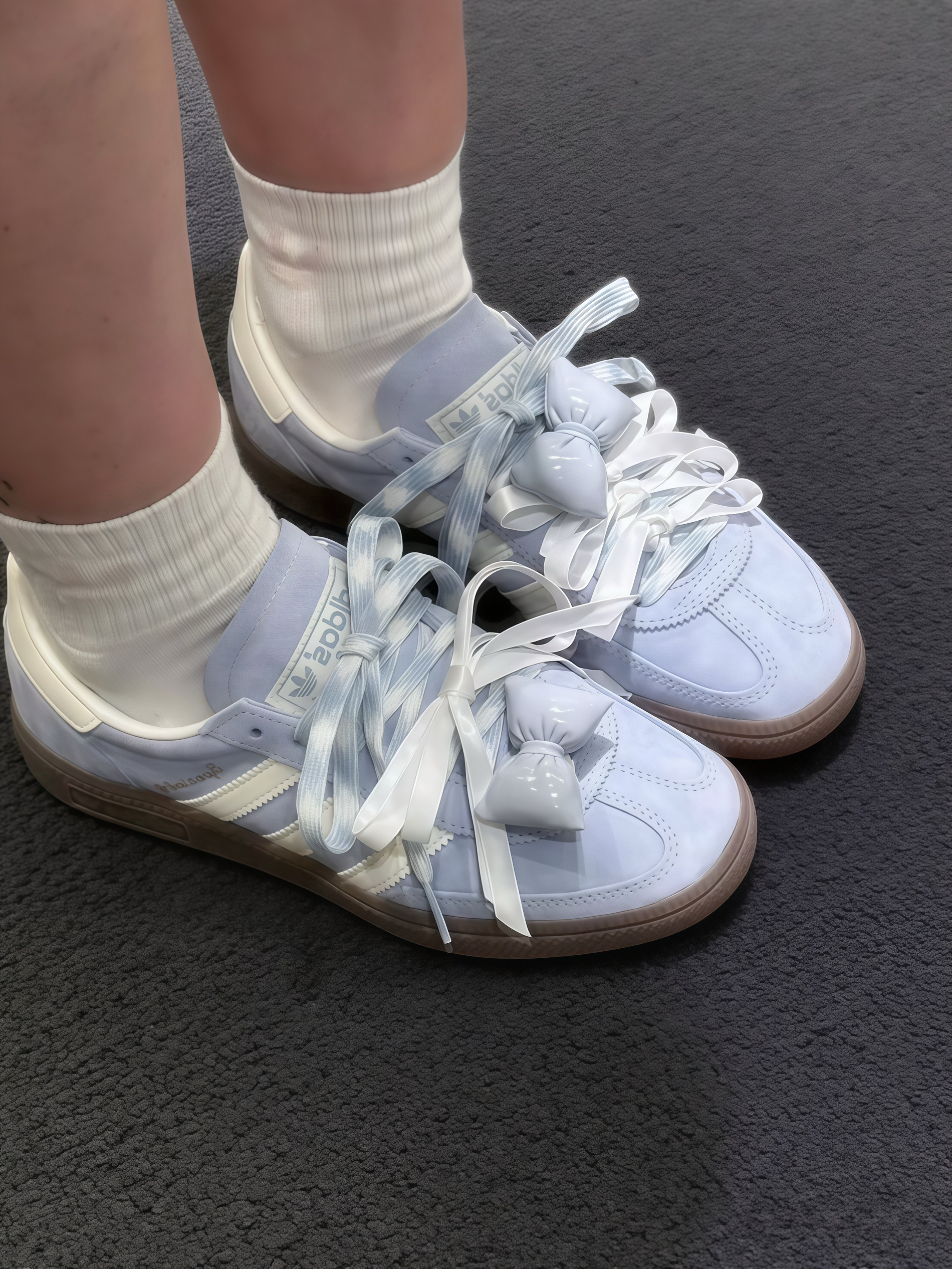 这双阿迪达斯太戳我了!淡蓝色鞋面清新又温柔,搭配白色条纹和蝴蝶结装饰,甜酷感直接拉满。自己换了丝带鞋带,系上后更有氛围感了。上脚试了下,脚感很舒服,鞋底软软的,走路也不累。搭配白色堆堆袜,一整个少女心爆棚,感觉能搭好多衣服,已经成为我最近出门的心头好了,越看越喜欢