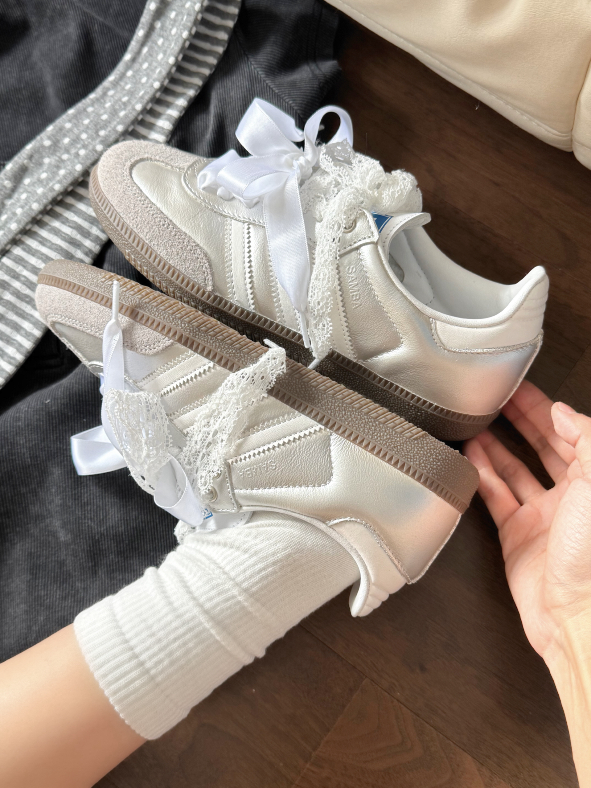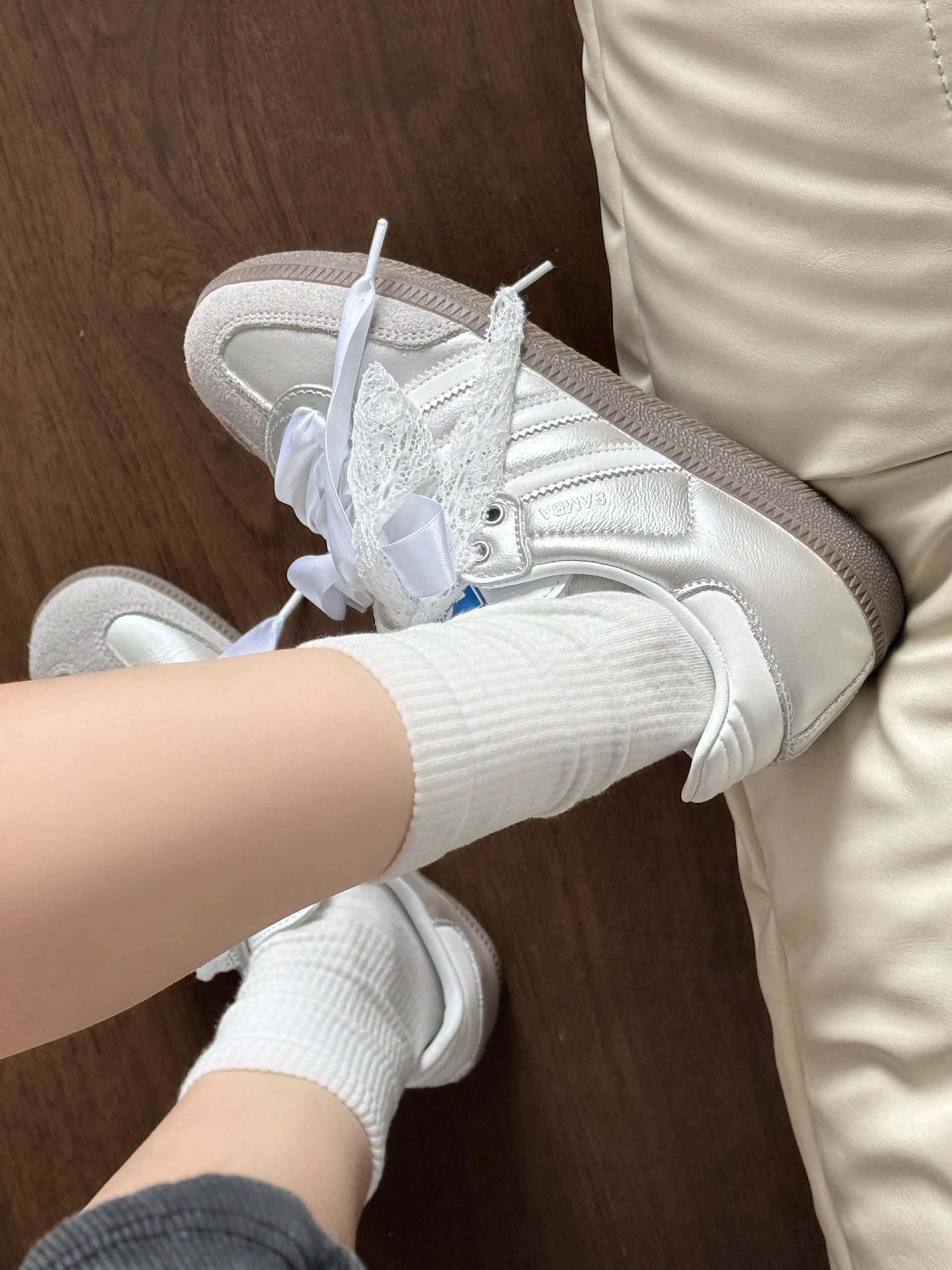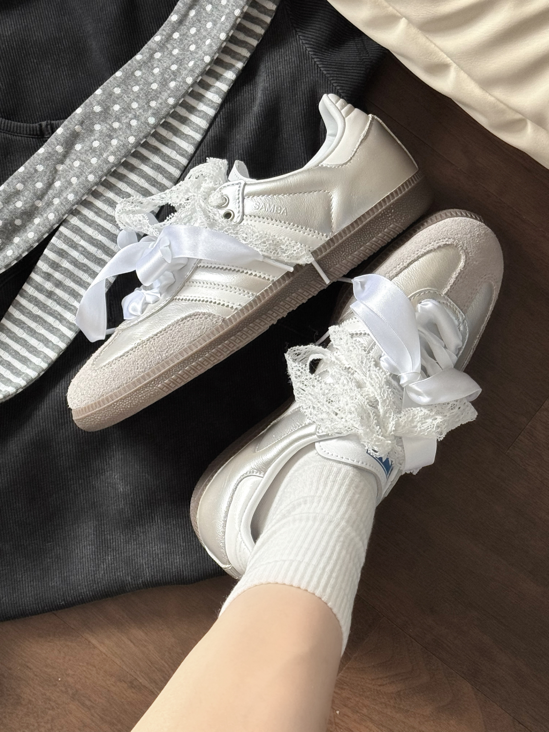阿迪银白配色的samba上脚好像白天鹅呀 鞋带是蕾丝和丝带的温柔又少女~ 我感觉银色搭配小裙子或者牛仔裤穿都是可以滴 周末约会 日常通勤都能搭得上 #开学报道ootd #女明星的高智姐系风 #开箱心动好鞋 #把浪漫穿在脚下 #拿捏复古松弛感