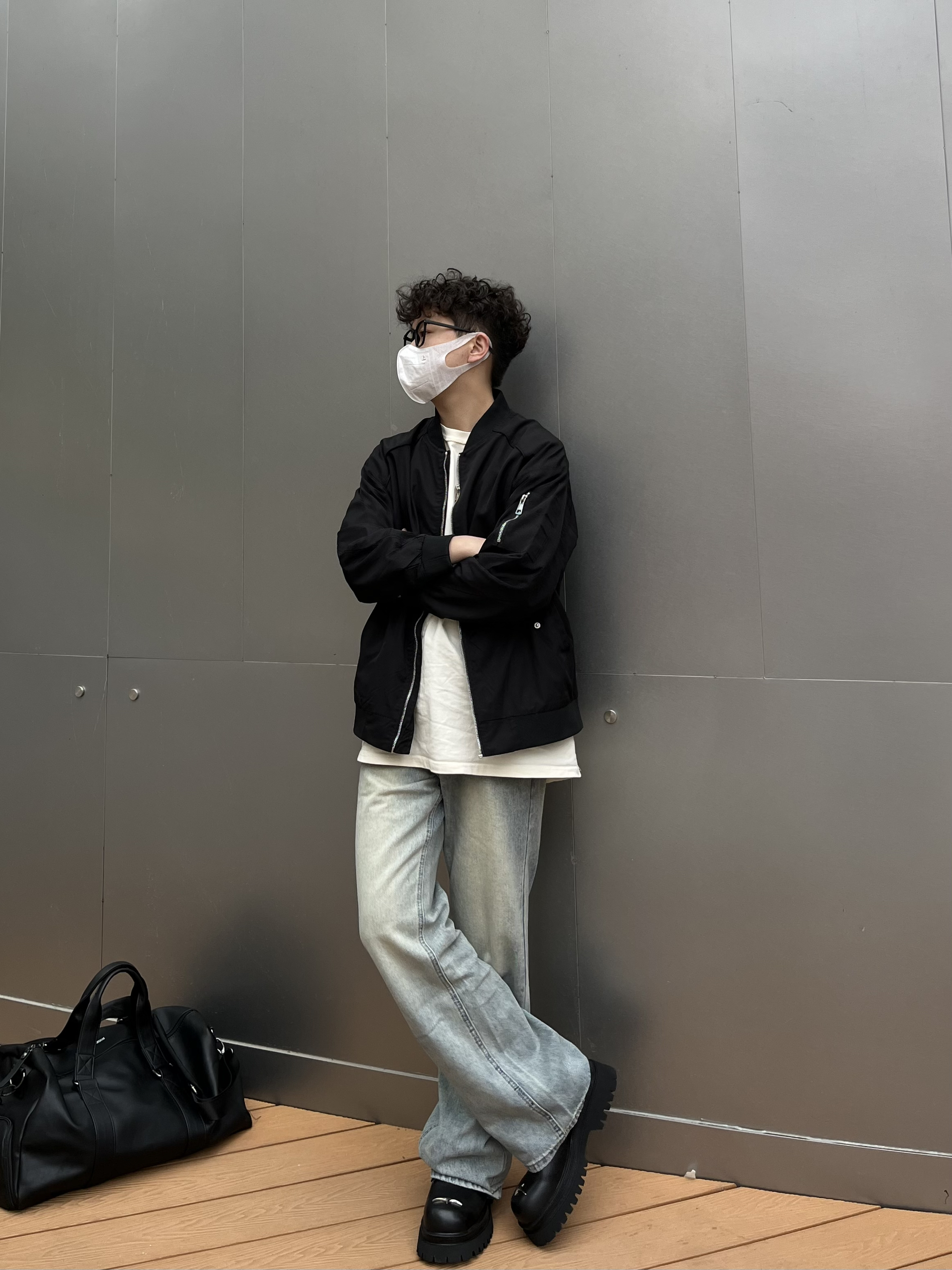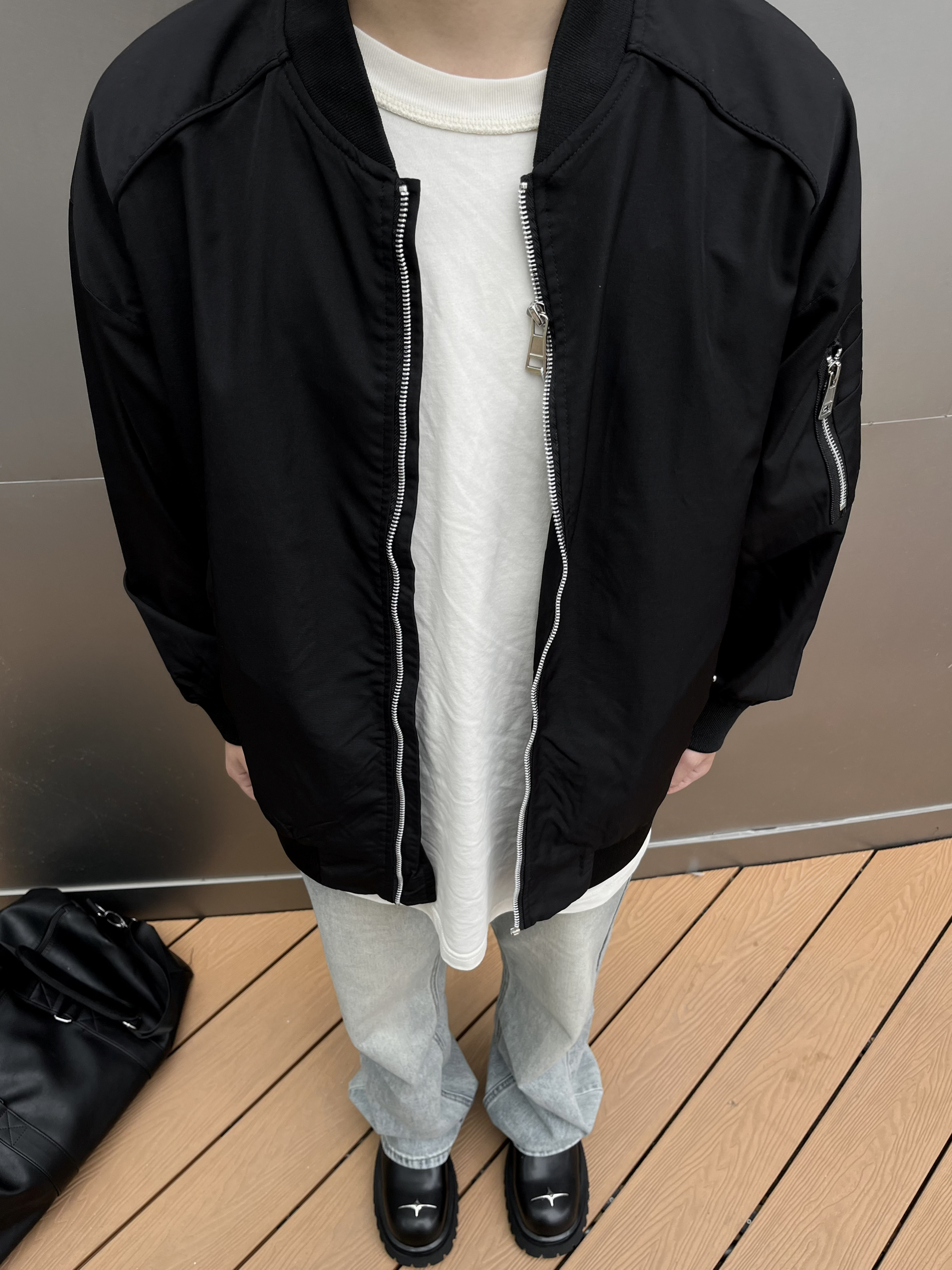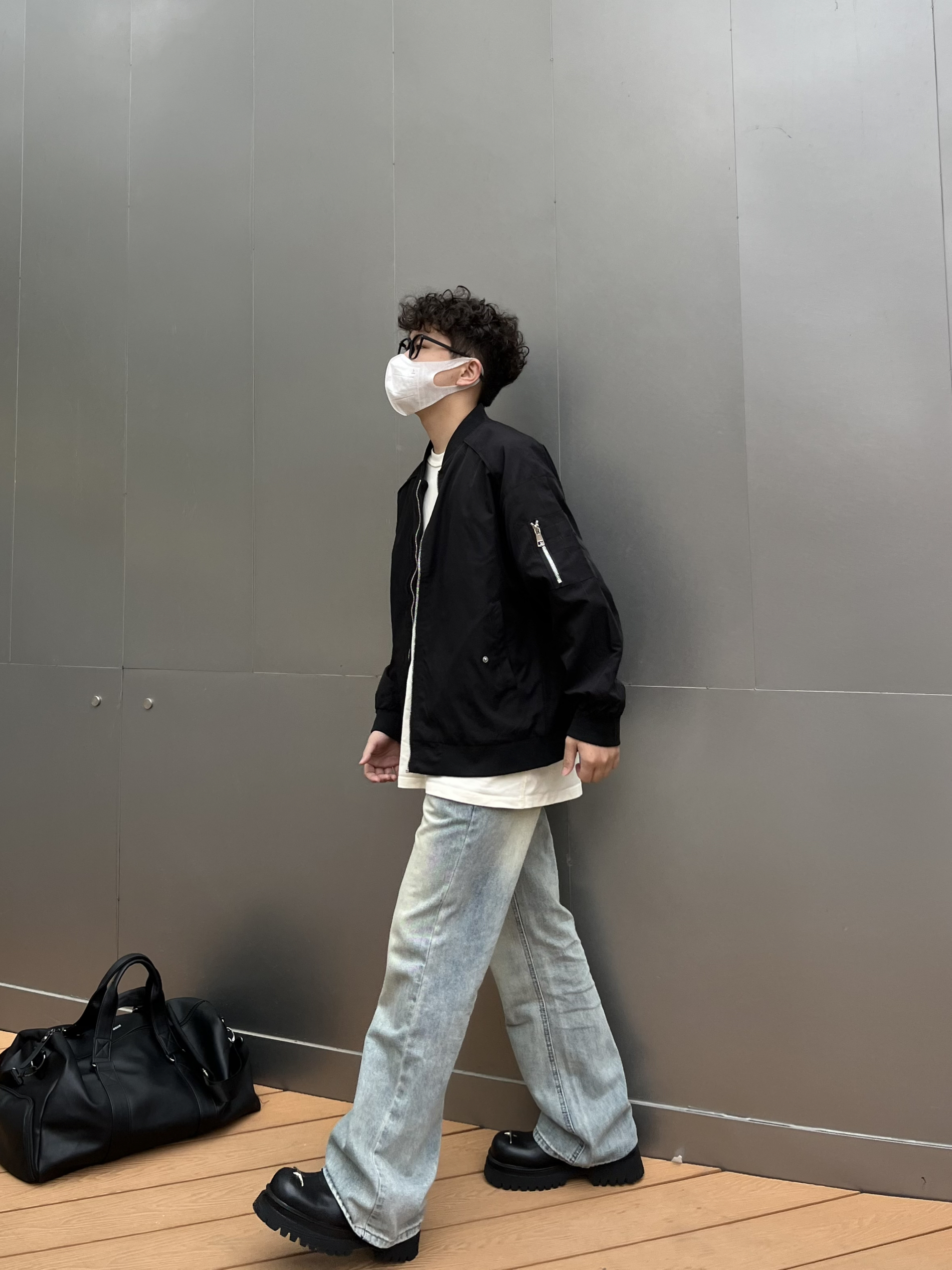 哈喽这里是乐言同学😗 今日是极简质感的cleanfit穿搭 上衣选择短宽的飞行员夹克 黑色耐看简单的纯色打底就很有质感 搭配一条微喇的浅蓝牛杂 裤长盖住鞋子显高显瘦 喜欢cleanfit的一点要尝试下德比 驰狼的这款很有特色 鞋头有个银色的十字架很有造型感相对于传统的德比 这双更加兼具脚感 上脚舒服 还有4cm左右的增高效果很酷