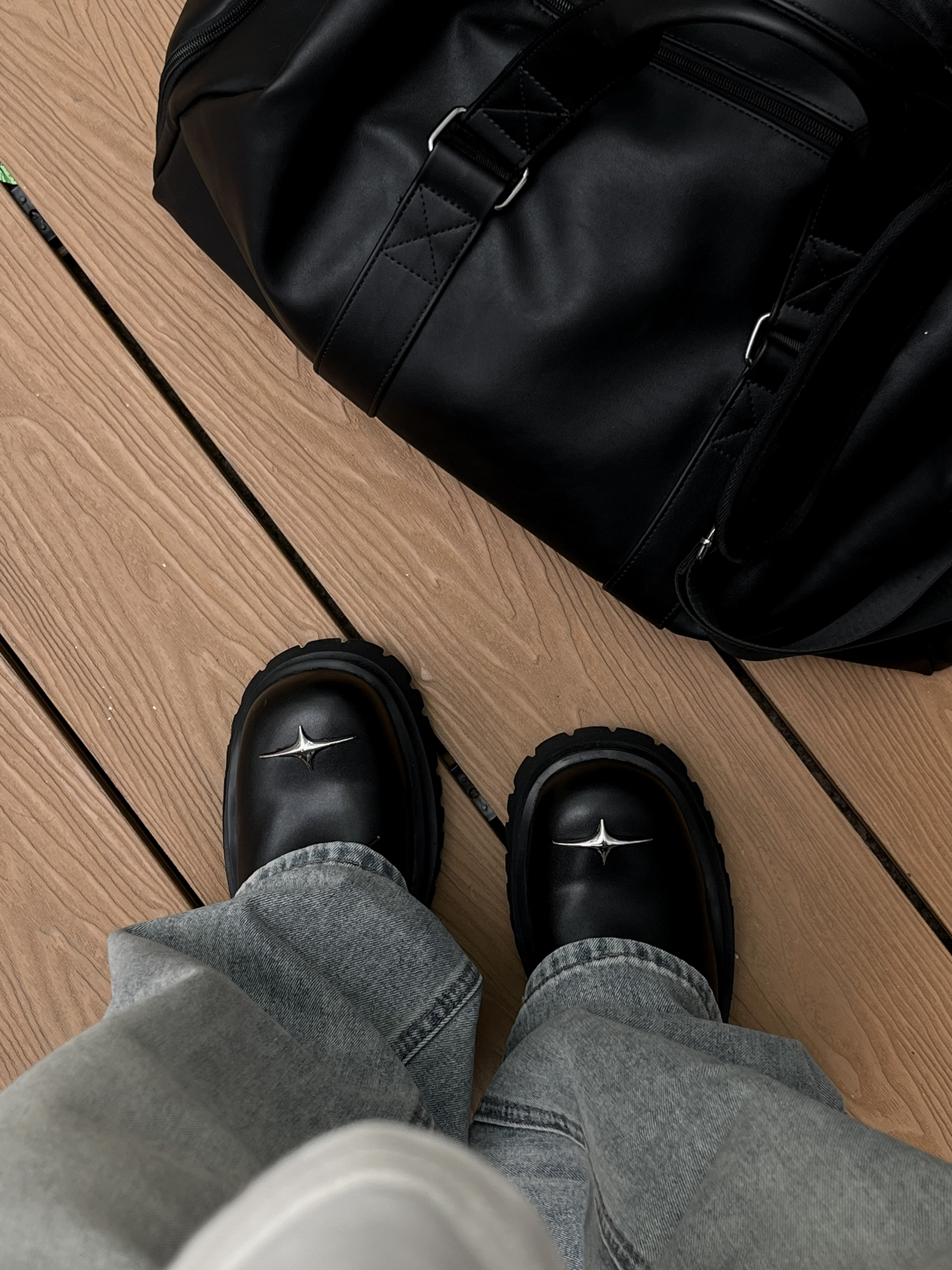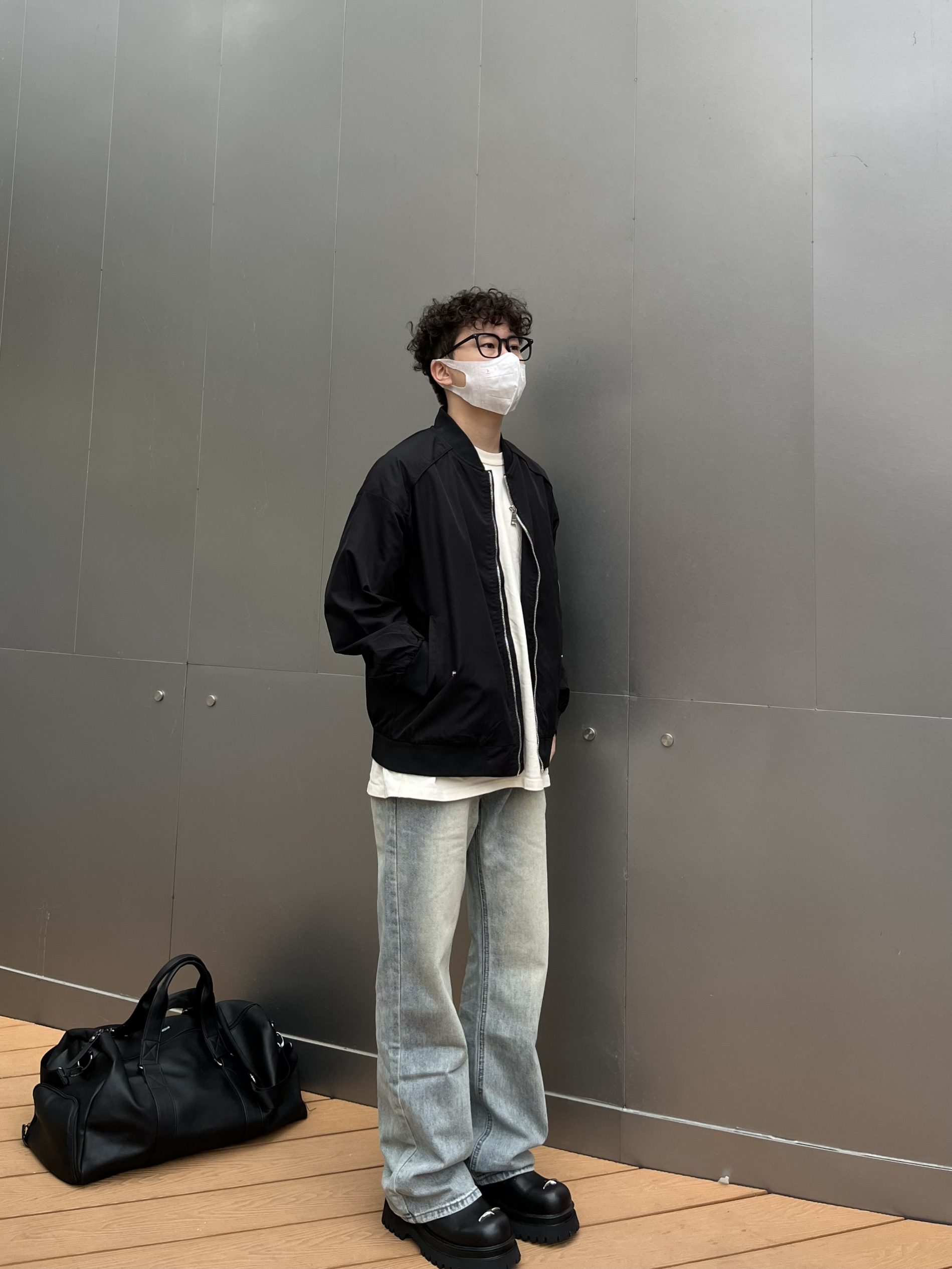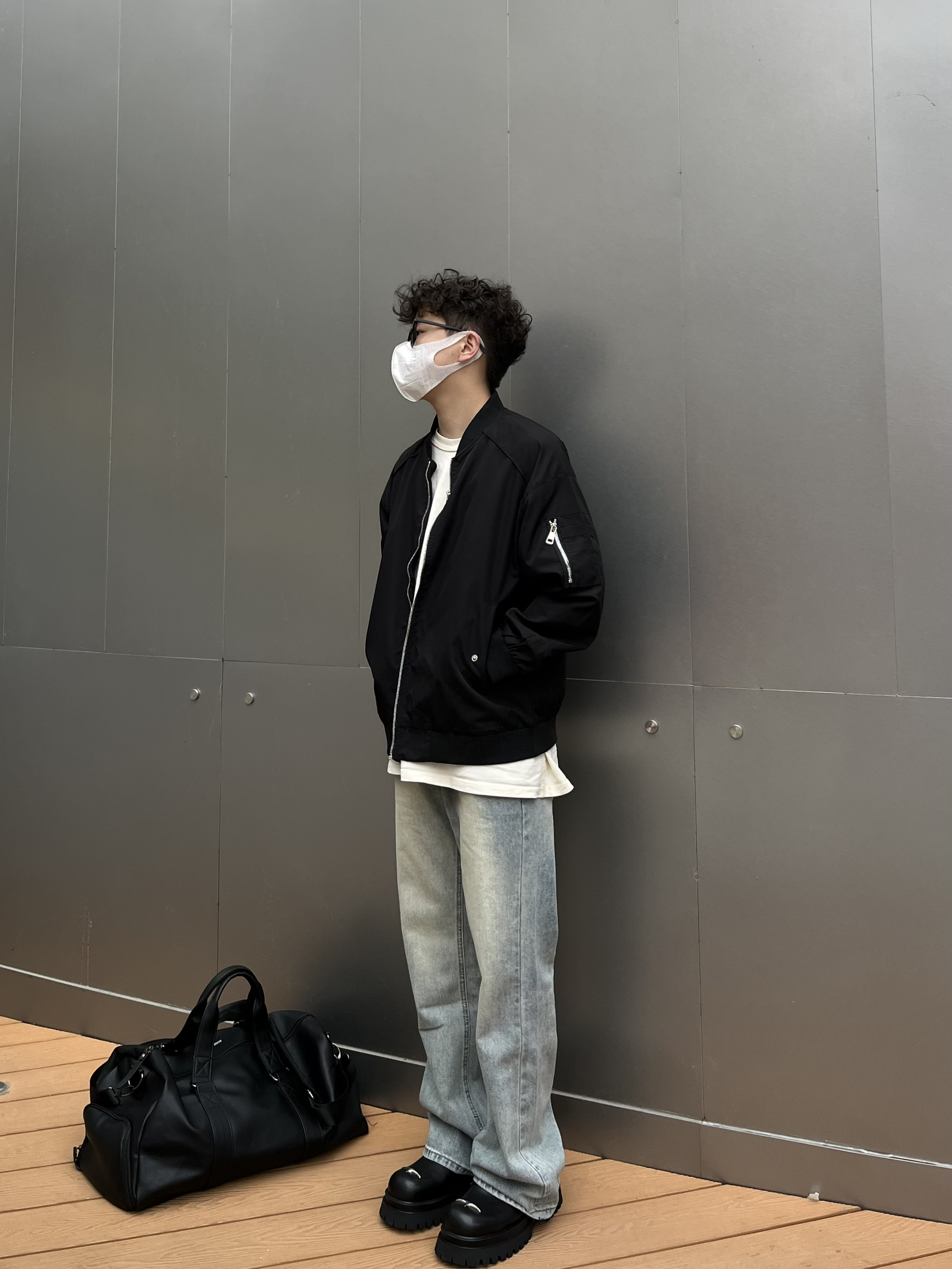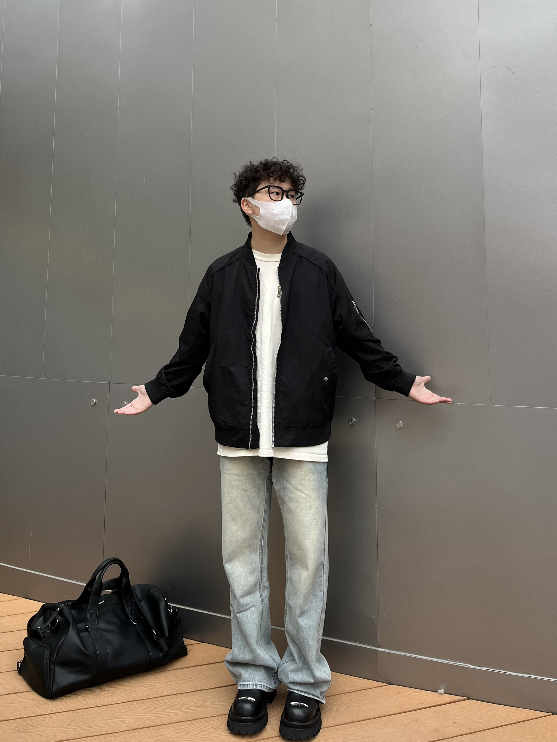 哈喽这里是乐言同学😗 今日是极简质感的cleanfit穿搭 上衣选择短宽的飞行员夹克 黑色耐看简单的纯色打底就很有质感 搭配一条微喇的浅蓝牛杂 裤长盖住鞋子显高显瘦 喜欢cleanfit的一点要尝试下德比 驰狼的这款很有特色 鞋头有个银色的十字架很有造型感相对于传统的德比 这双更加兼具脚感 上脚舒服 还有4cm左右的增高效果很酷