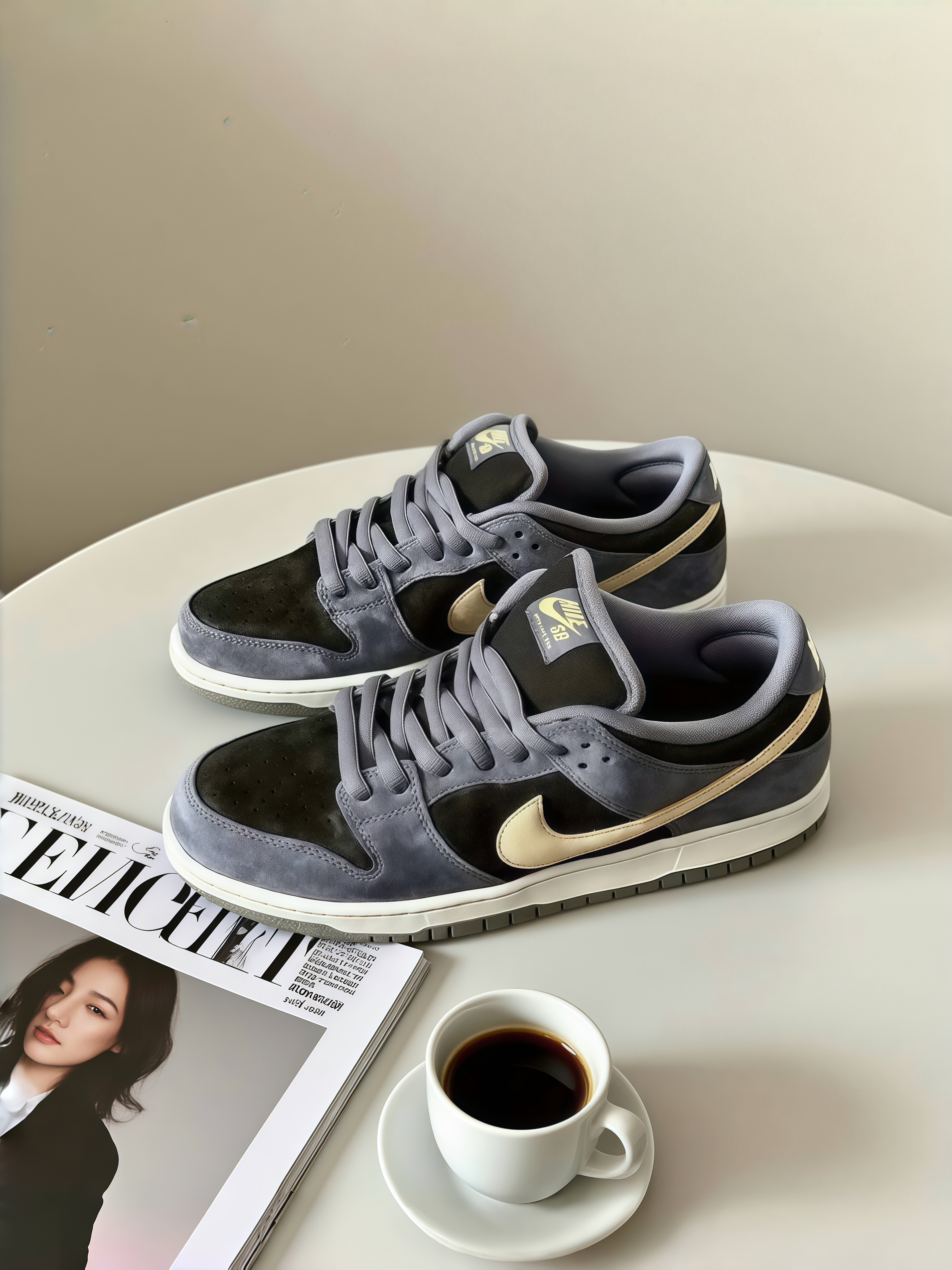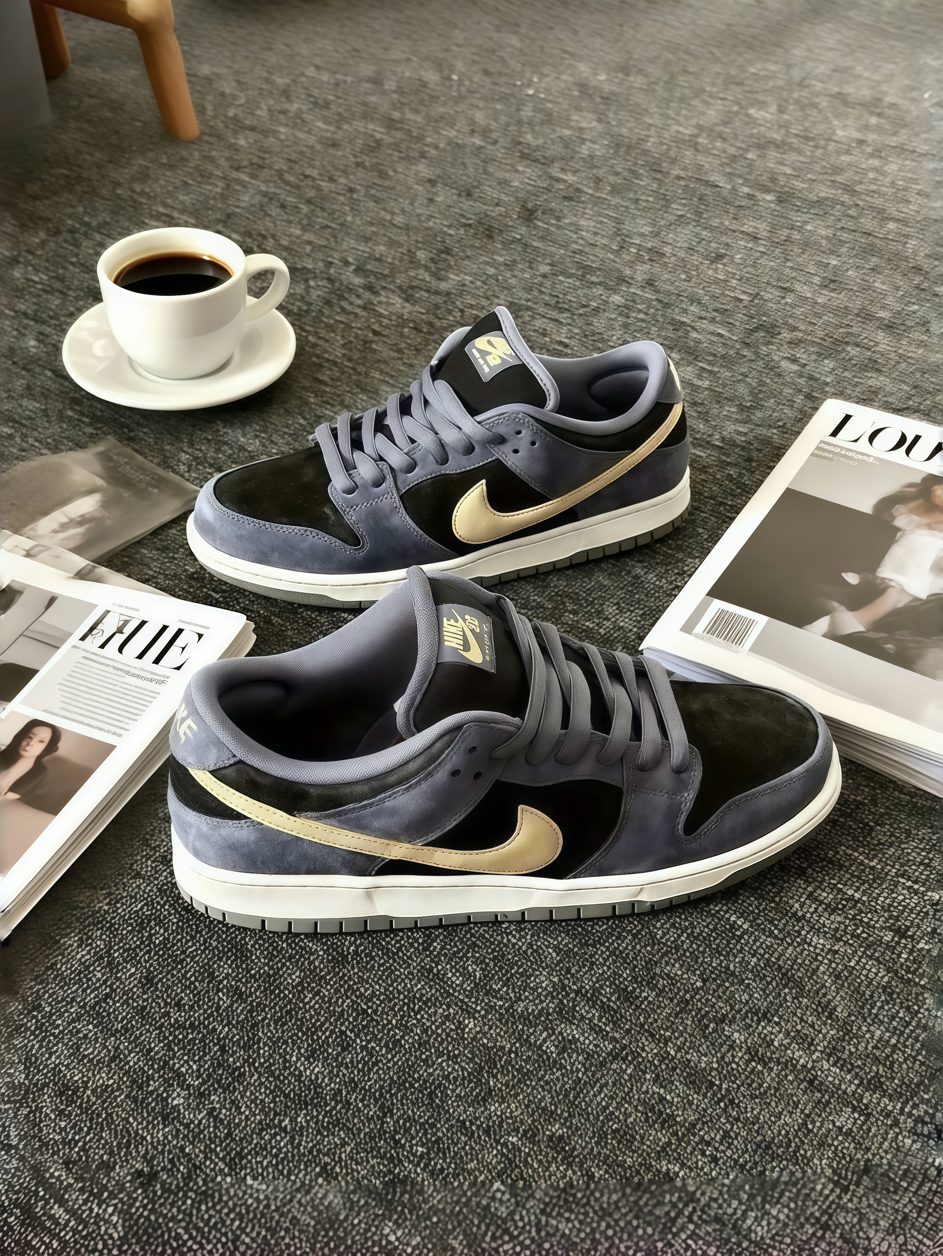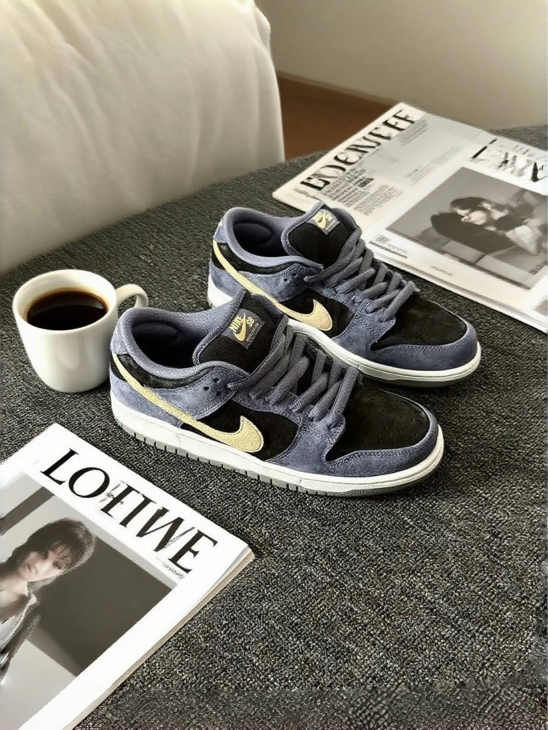 谁懂啊!这双Dunk的配色真的长在我审美上了~拿到手就被灰蓝和浅金的搭配戳中,麂皮摸起来软乎乎的,质感特别高级。 上脚那天搭了条浅灰卫裤,朋友说像把“冷调高级感”穿脚上了。而且脚感好绝,鞋底软软的,我上周穿它逛艺术展,站一下午都没觉得累。最惊喜的是百搭,这几天配牛仔外套、卡其风衣都很搭,现在已经是我鞋柜里的“心头好”了,感觉能从秋天一直穿到冬天,后悔没早点入!