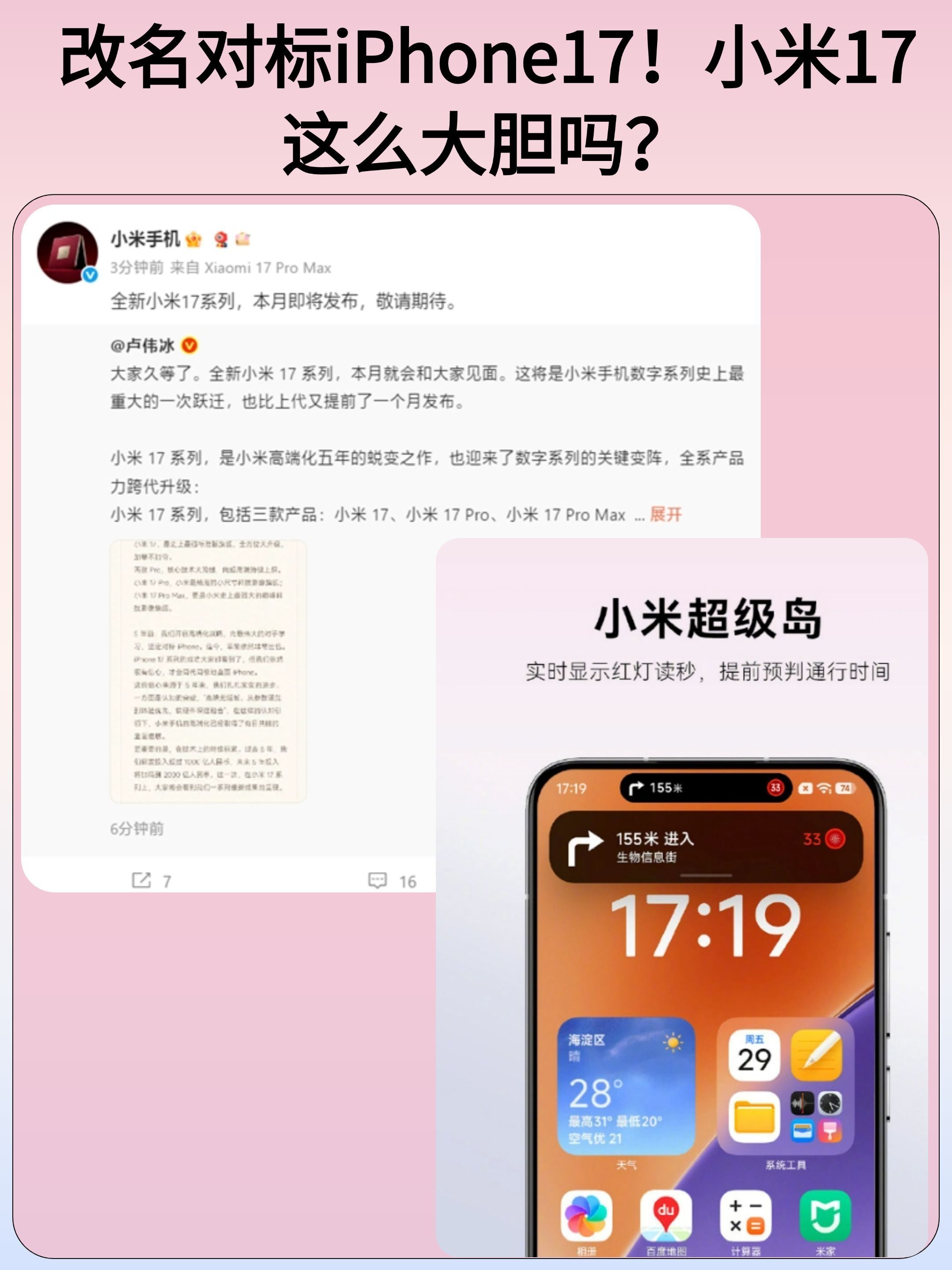 家人们谁懂啊!今天卢伟冰突然甩王炸💣——小米17直接跳过16代本月发布!雷军更狠:"全面对标iPhone17,正面刚!"(库克连夜改PPT既视感😂)