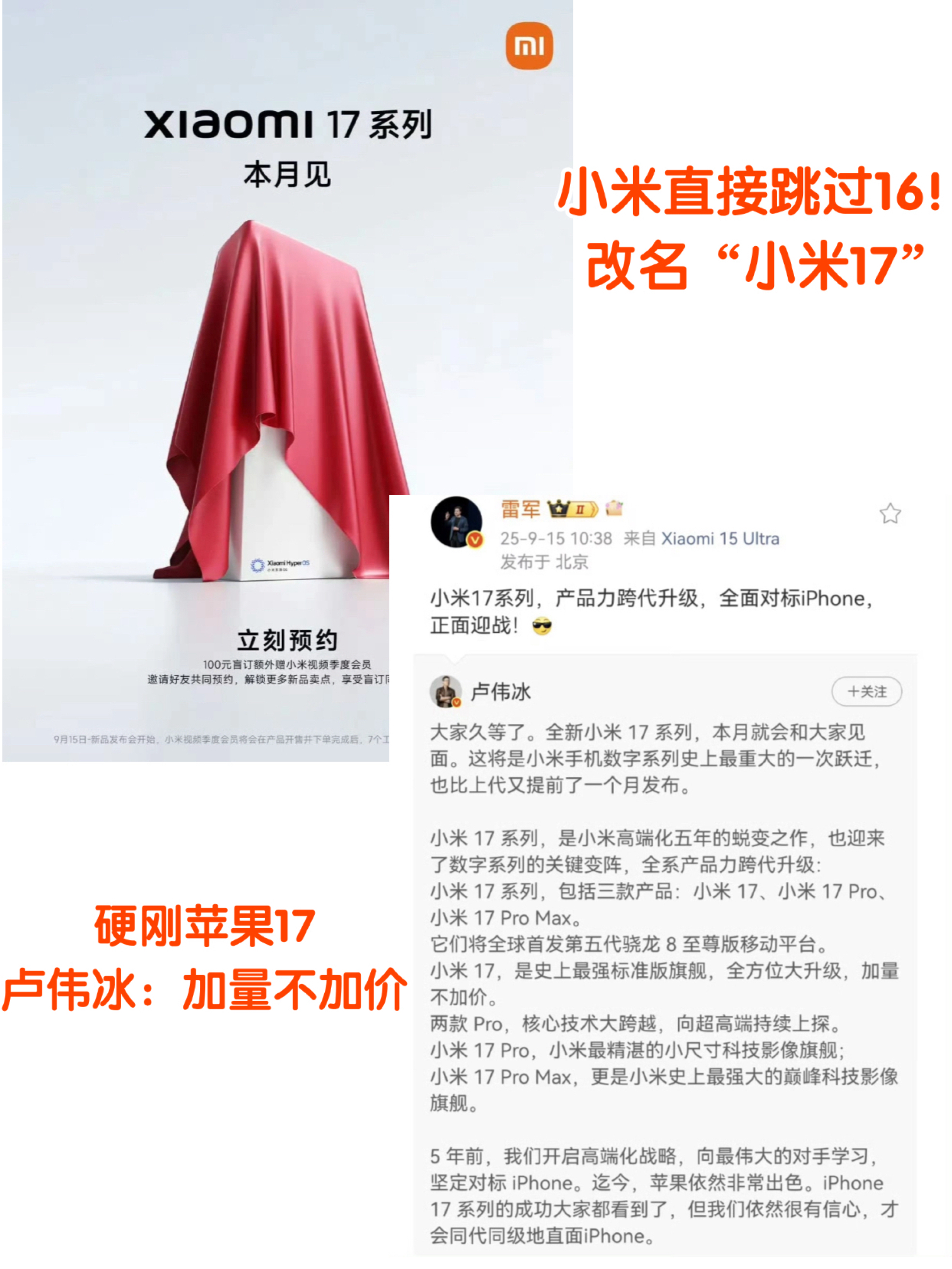 正面迎战iPhone!小米17系列官宣:本月发布,产品力跨代升级 原以为该是小米16登场,结果直接跳过数字改成小米17,还一口气推出小米17、17 Pro、17 Pro Max三款机型。只是说好的小米17 Ultra呢?对标iPhone17改名能理解,连Ultra都换成Pro Max,这波属于命名对标?也太直接了吧!