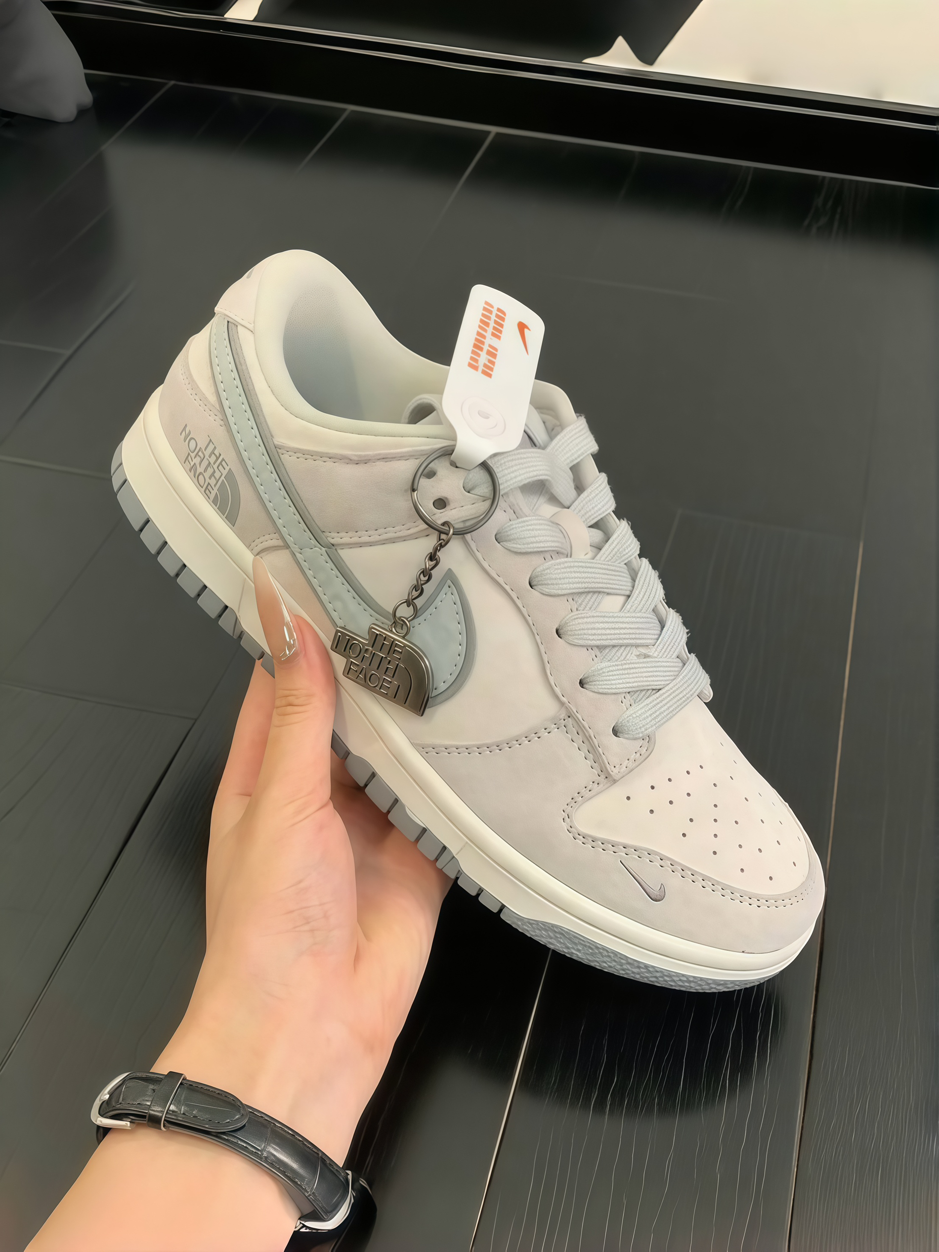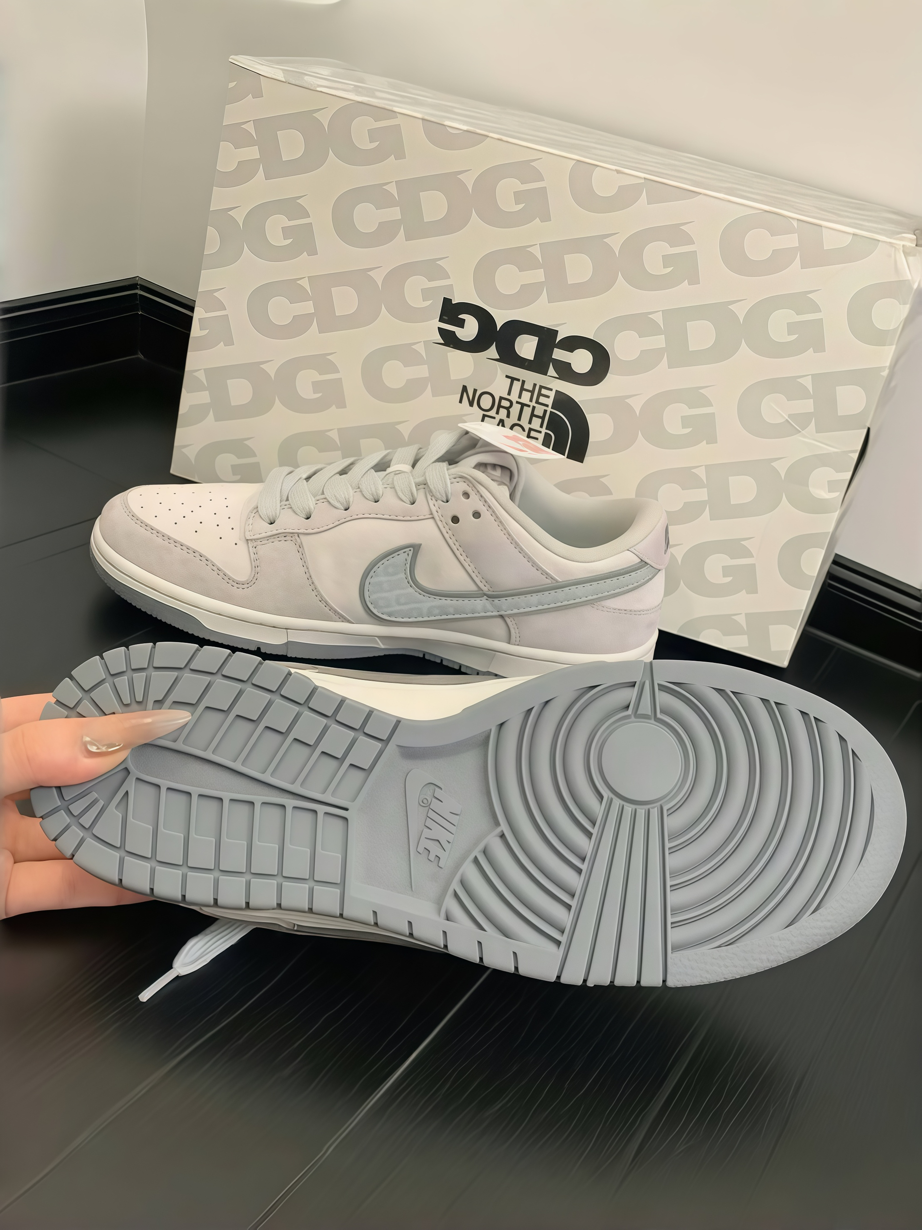 谁懂啊!收到这双CDG和北面联名的Dunk时,我直接对着鞋盒盯了半分钟。浅灰调的麂皮摸起来软乎乎的,钩子上还有CDG的暗纹,细节控真的会爱死! 上脚那天搭了条浅卡其工装裤,朋友说我这鞋“把高级感焊在脚上了”。而且脚感特别舒服,鞋底软软的,我上周穿它逛了一下午买手店,回家脱鞋居然没觉得累。最惊喜的是晚上出门,钩子还会反光,瞬间变成街头焦点~现在每天出门都想穿它,感觉是那种越看越喜欢、能穿很久的款,...